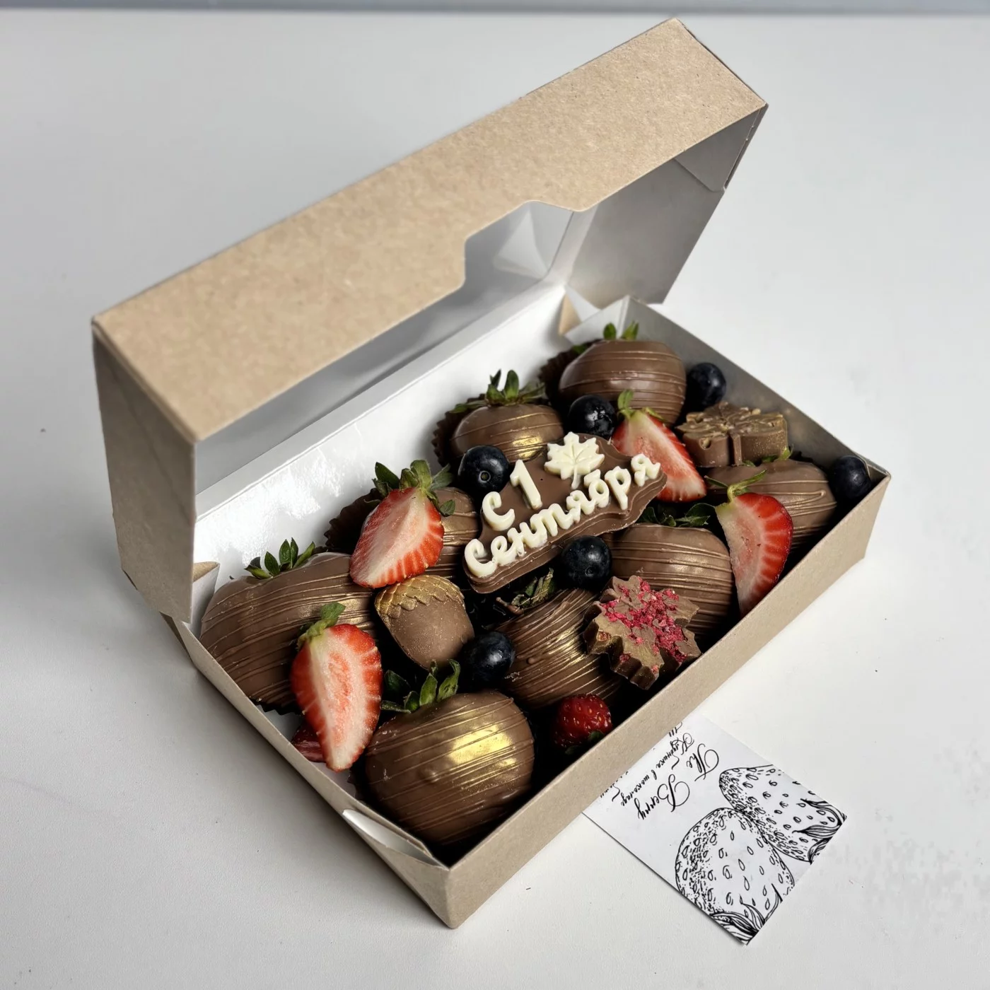 Клубника в шоколаде - 8, шоколад ручной работы - 3, топпер шоколадный - 1, нарезка клубника, голубика, коробка.