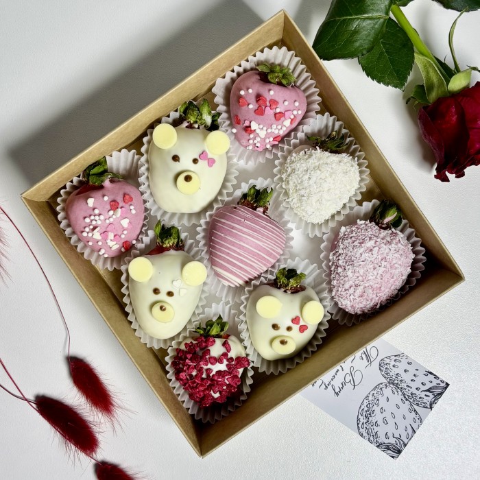 Красивый и милый набор из клубники в шоколаде в виде мишек. Приятный сюрприз для любимой или дочке на день рождения.
