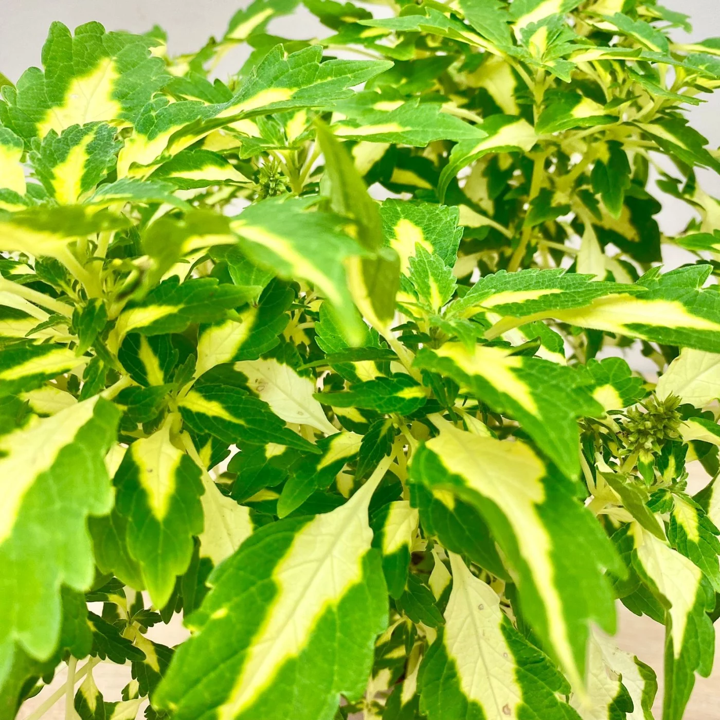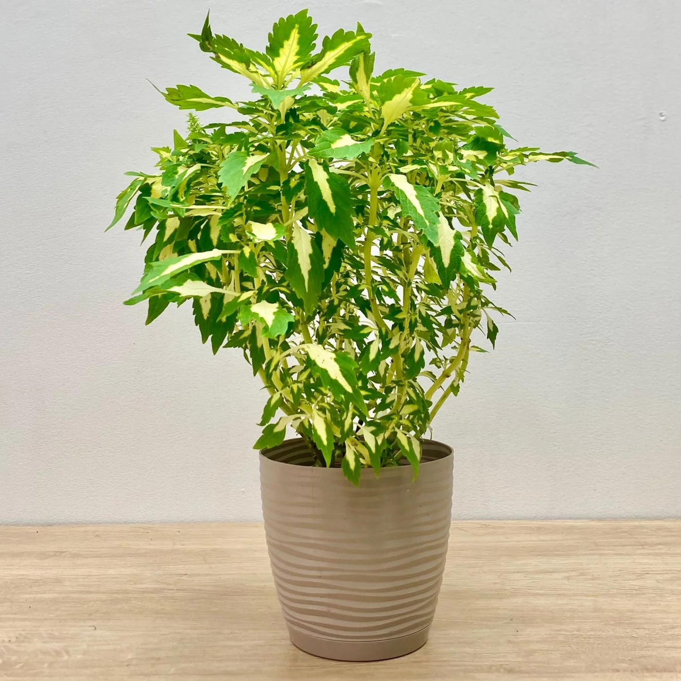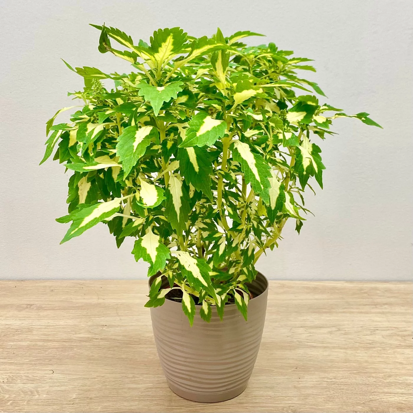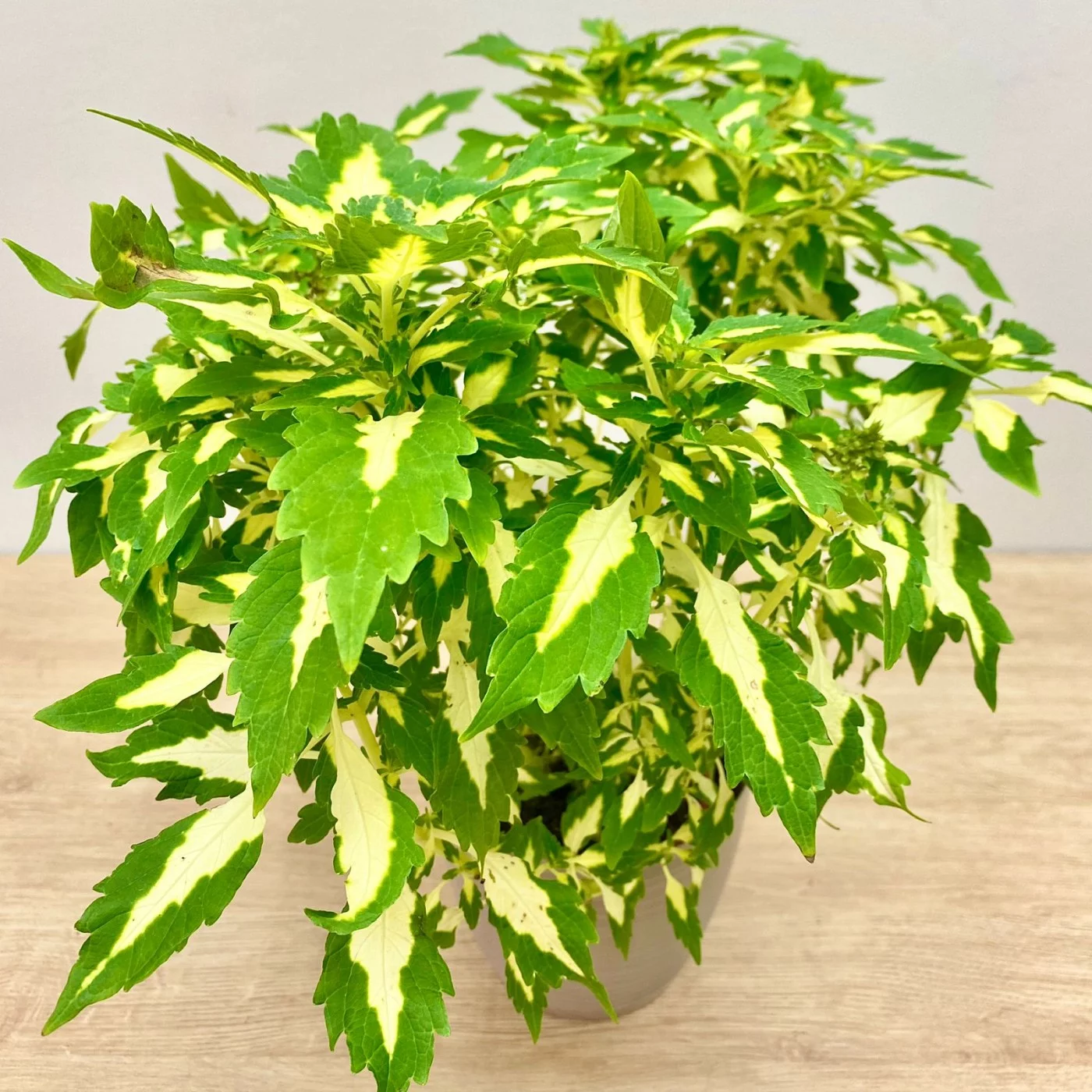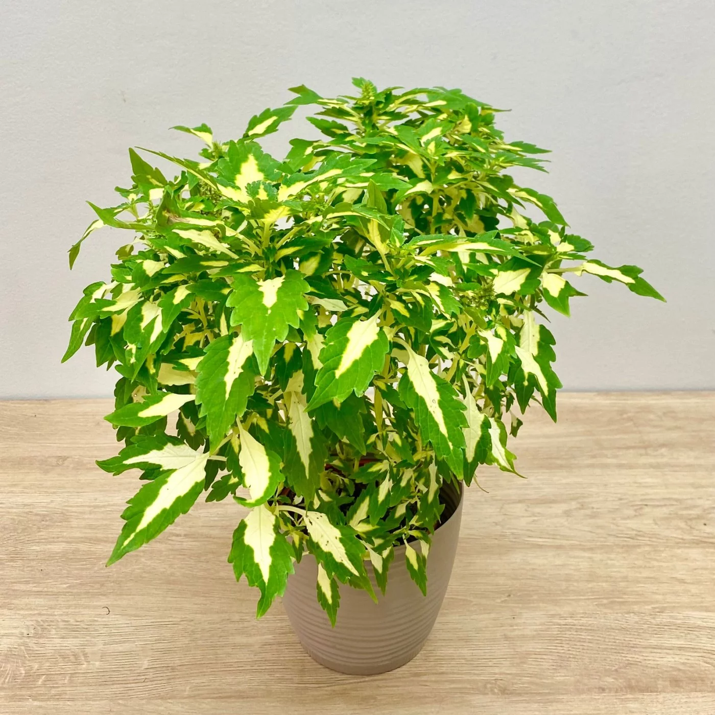 Колеус иногда путают с кротоном. По красочности он может даже превосходить кротон, но стоит не в пример дешевле. У него есть ещё одно преимущество: он не требователен, не то что капризный кротон. Существует невероятное множество гибридов. Это кустистое растение с сочными стеблями необходимо регулярно прищипывать, чтобы стебли не оголялись снизу.