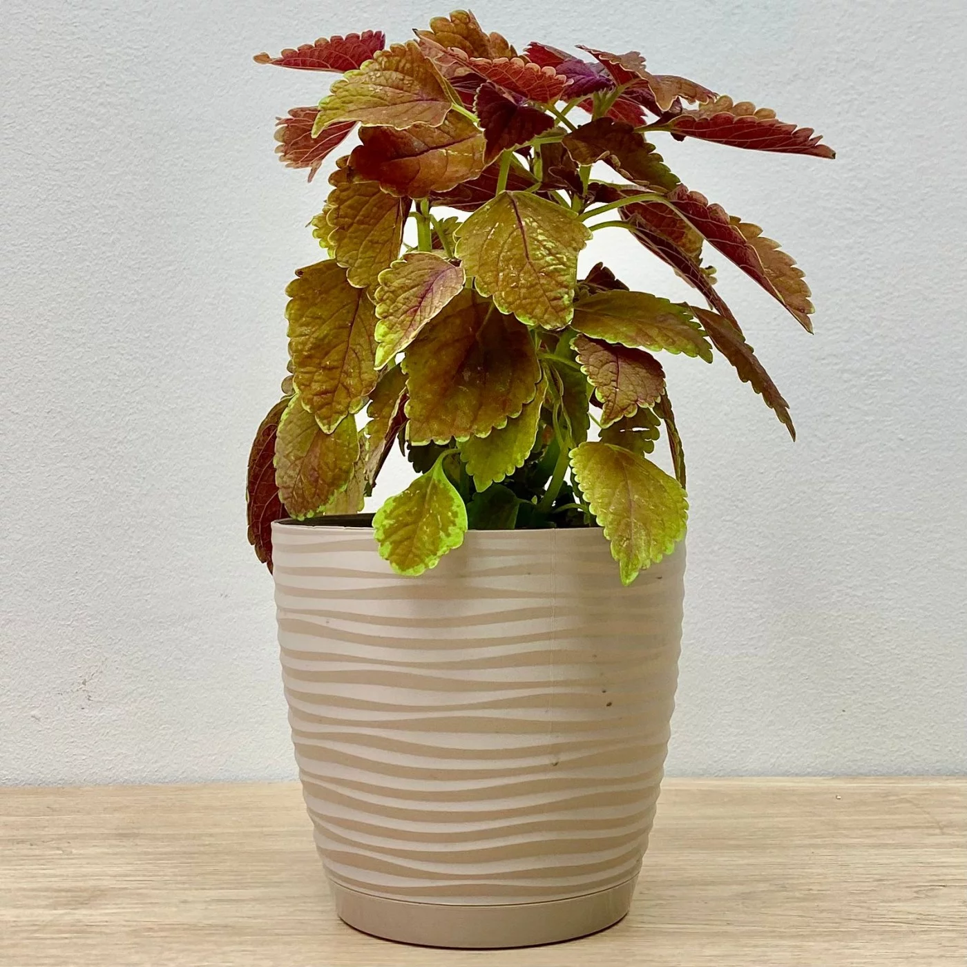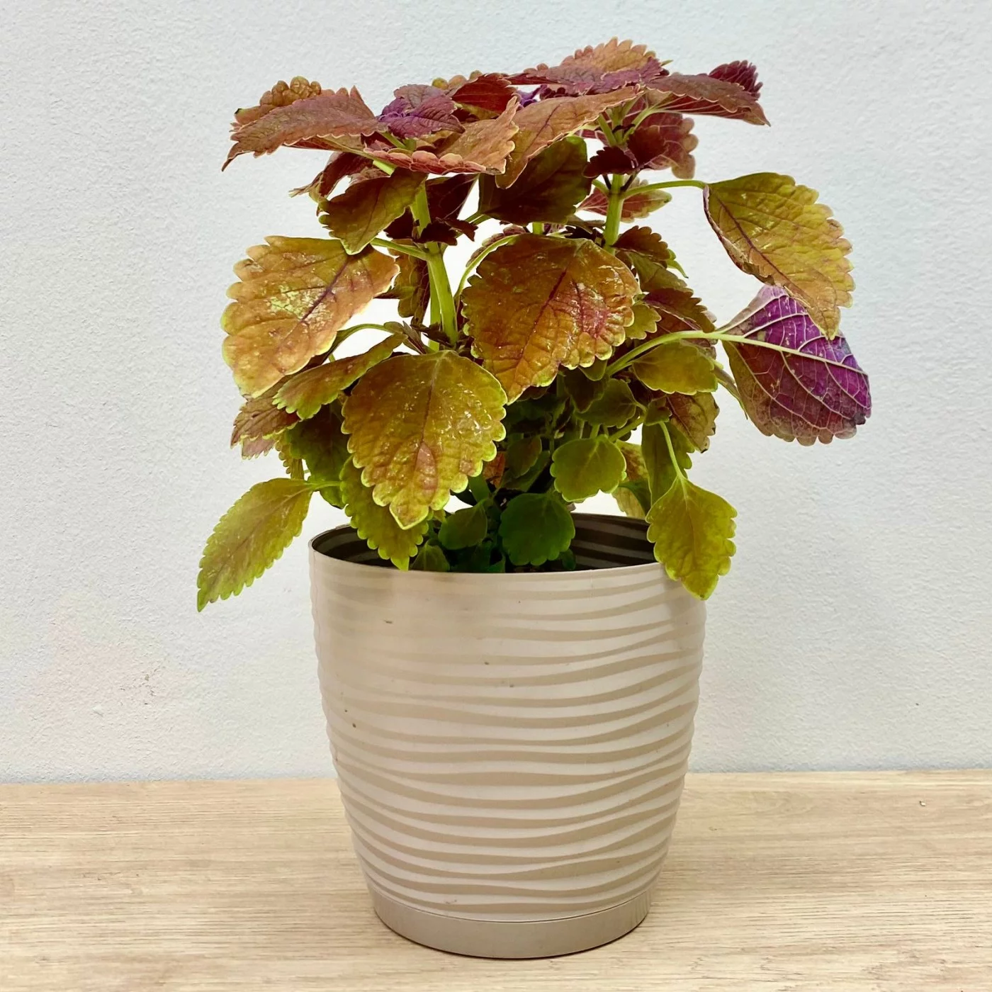 Колеус иногда путают с кротоном. По красочности он может даже превосходить кротон, но стоит не в пример дешевле. У него есть ещё одно преимущество: он не требователен, не то что капризный кротон. Существует невероятное множество гибридов. Это кустистое растение с сочными стеблями необходимо регулярно прищипывать, чтобы стебли не оголялись снизу.
