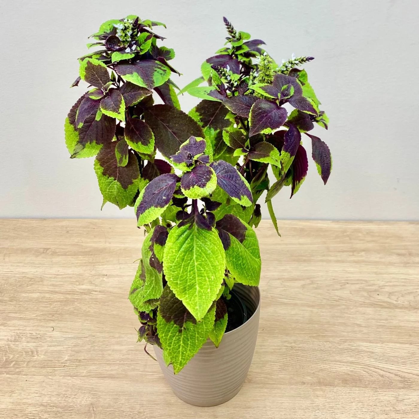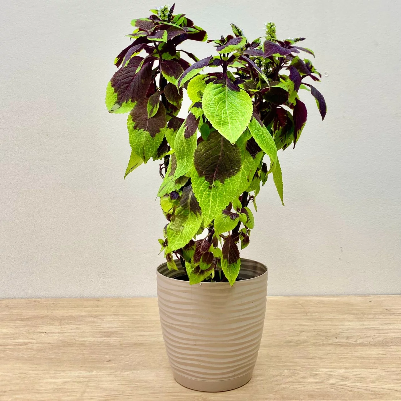 Колеус иногда путают с кротоном. По красочности он может даже превосходить кротон, но стоит не в пример дешевле. У него есть ещё одно преимущество: он не требователен, не то что капризный кротон. Существует невероятное множество гибридов. Это кустистое растение с сочными стеблями необходимо регулярно прищипывать, чтобы стебли не оголялись снизу.
