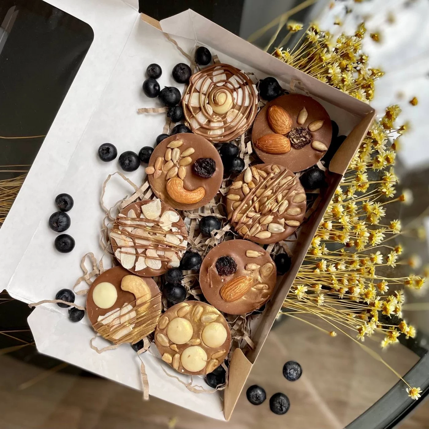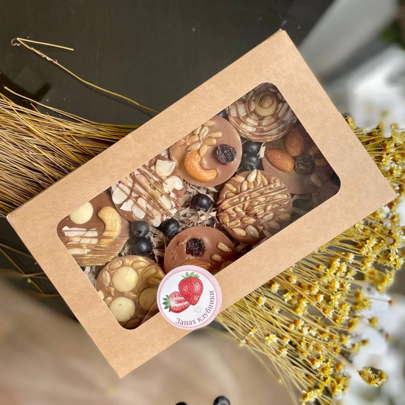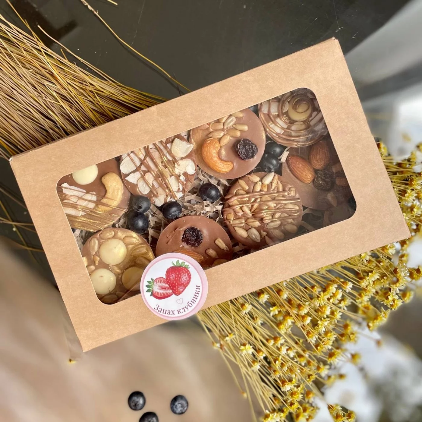 Набор из кооллет бельгийского молочного шоколада в сочетании с орешками и голубикой, любимым десертом вашей любимой. Такой набор можно подарить учителю и воспитателю. Дарите вкусные и красивые подарки.