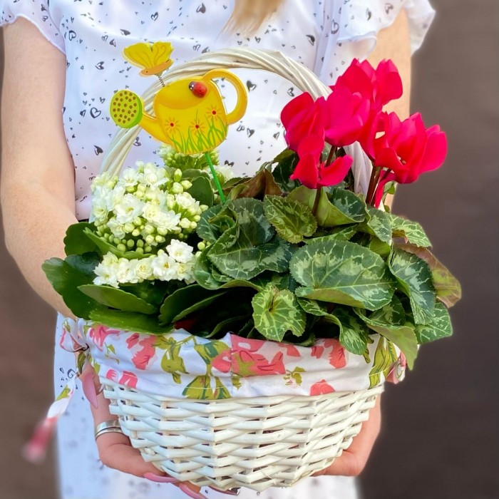 Композиция с цикламеном и каланхоэ в корзине