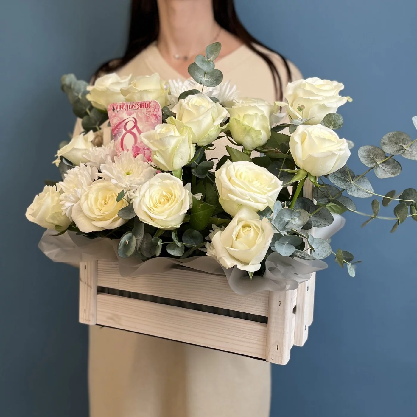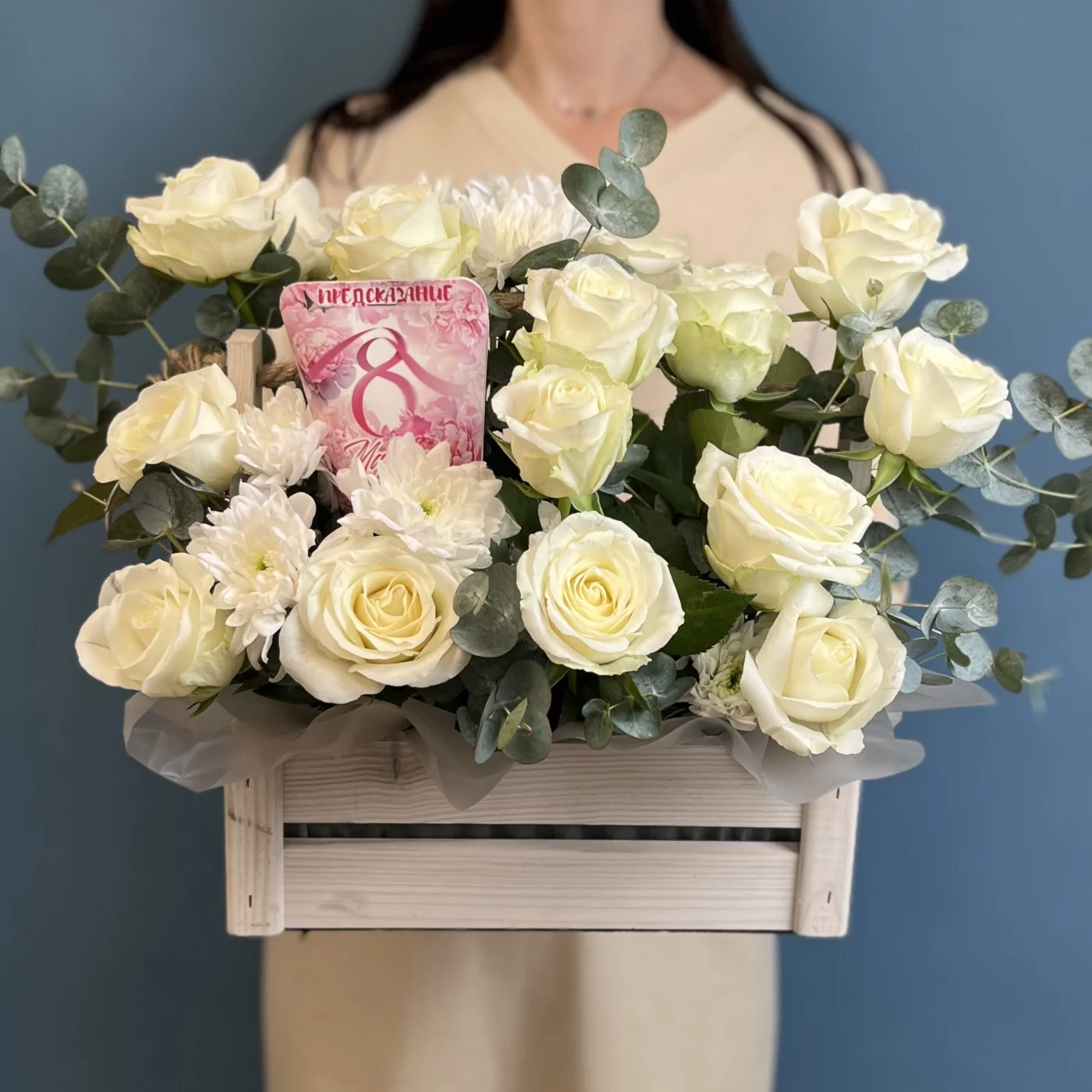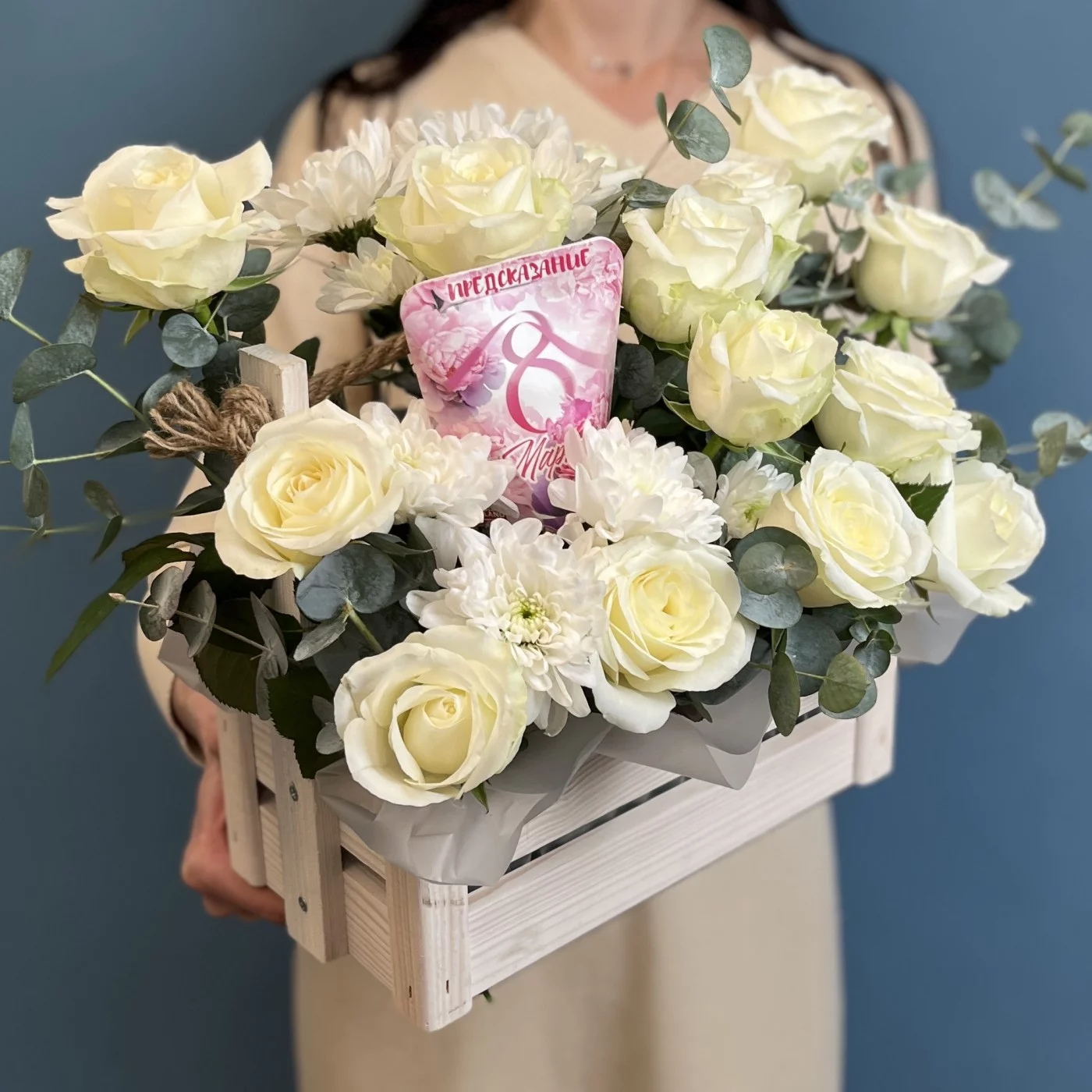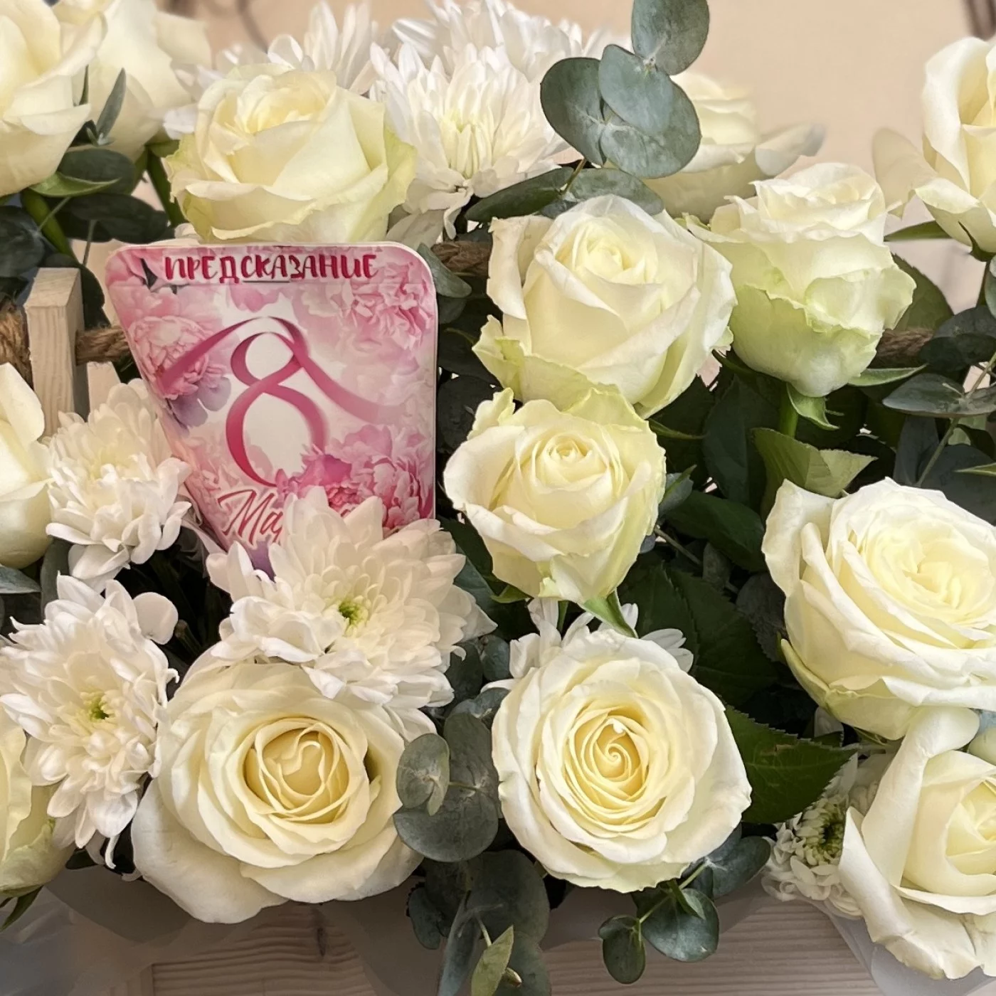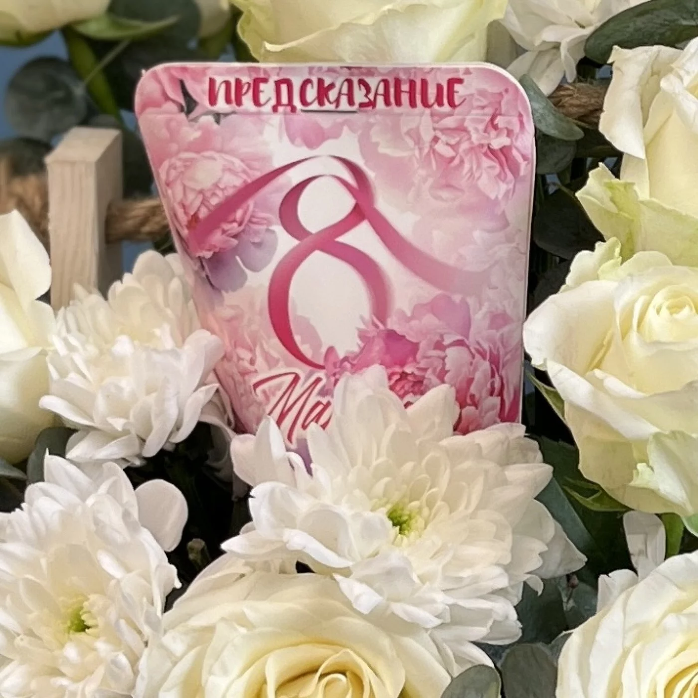 Композиция 8 марта Белые розы с предсказанием - это символ любви, нежности и заботы.