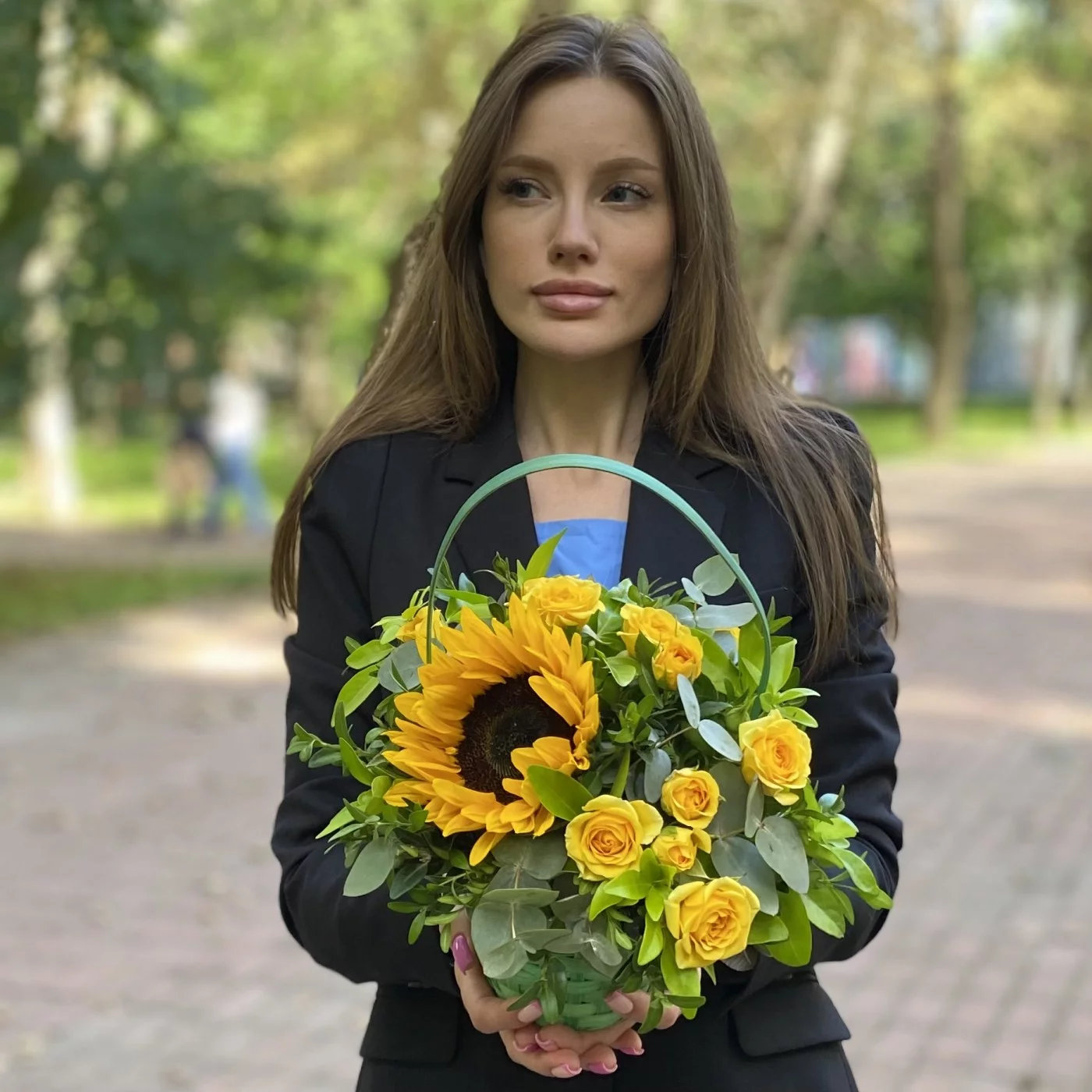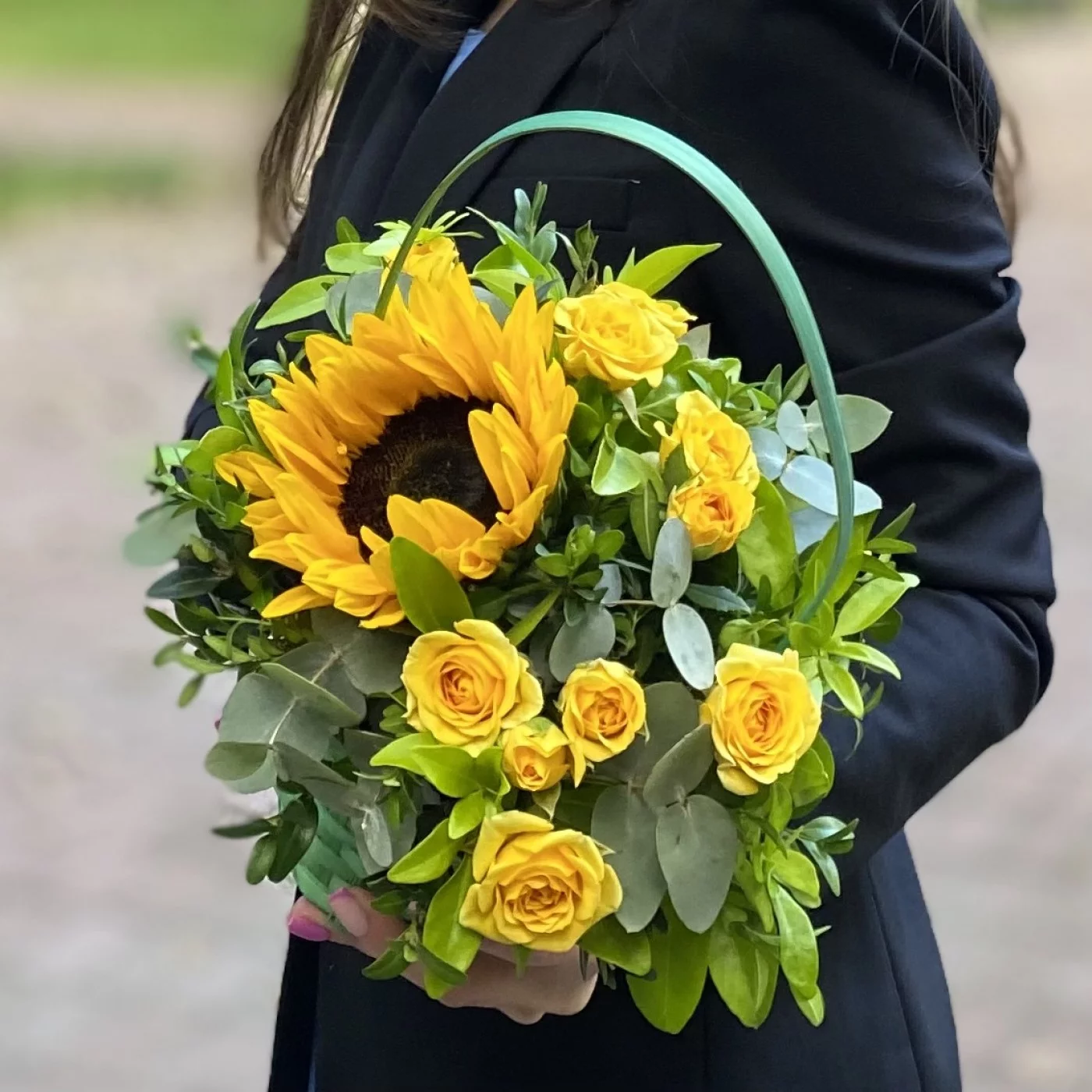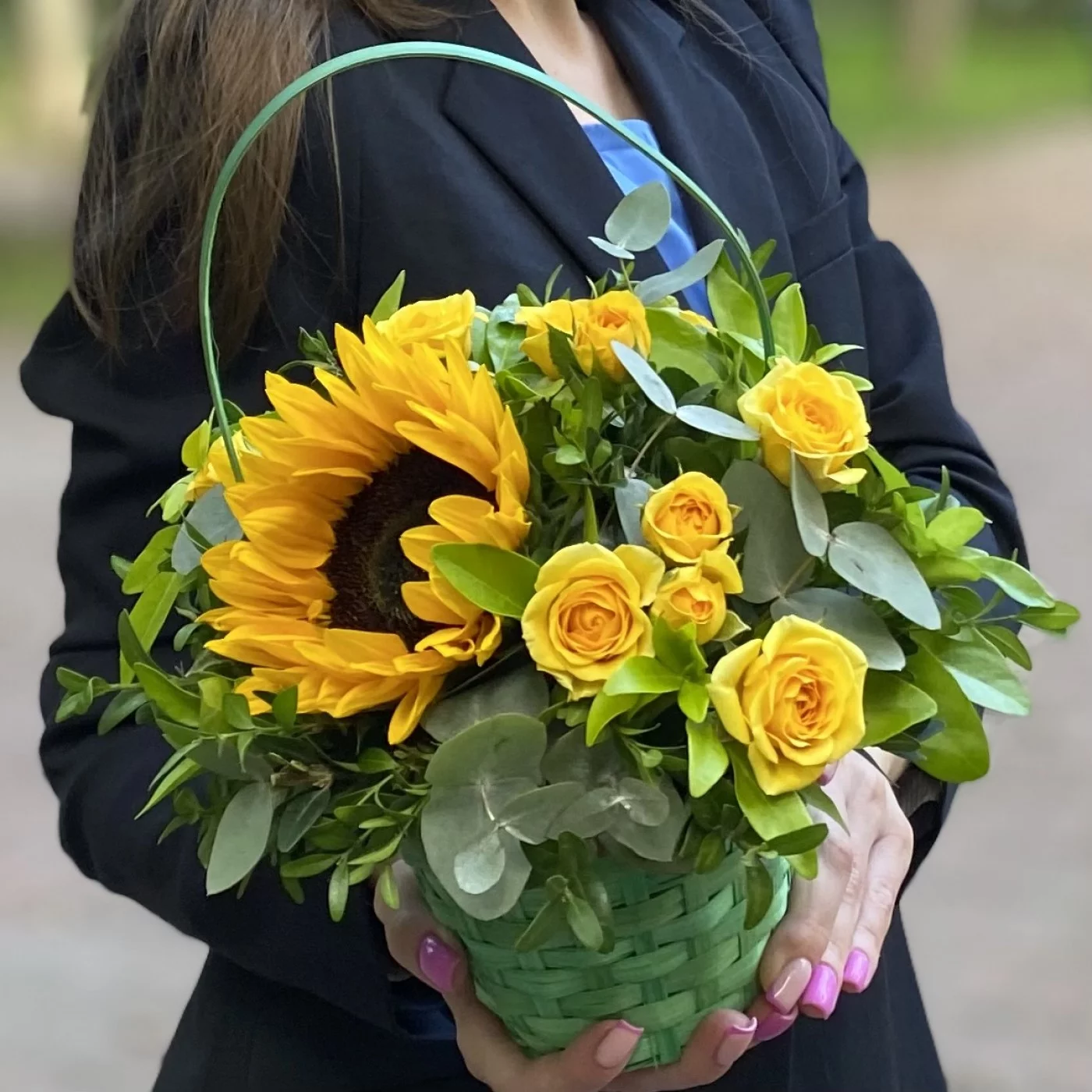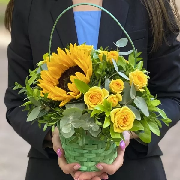 Корзиночка с подсолнухом и кустовой розой в желтых тонах, отлично подойдет в качестве поздравления учителя на 1 сентября.