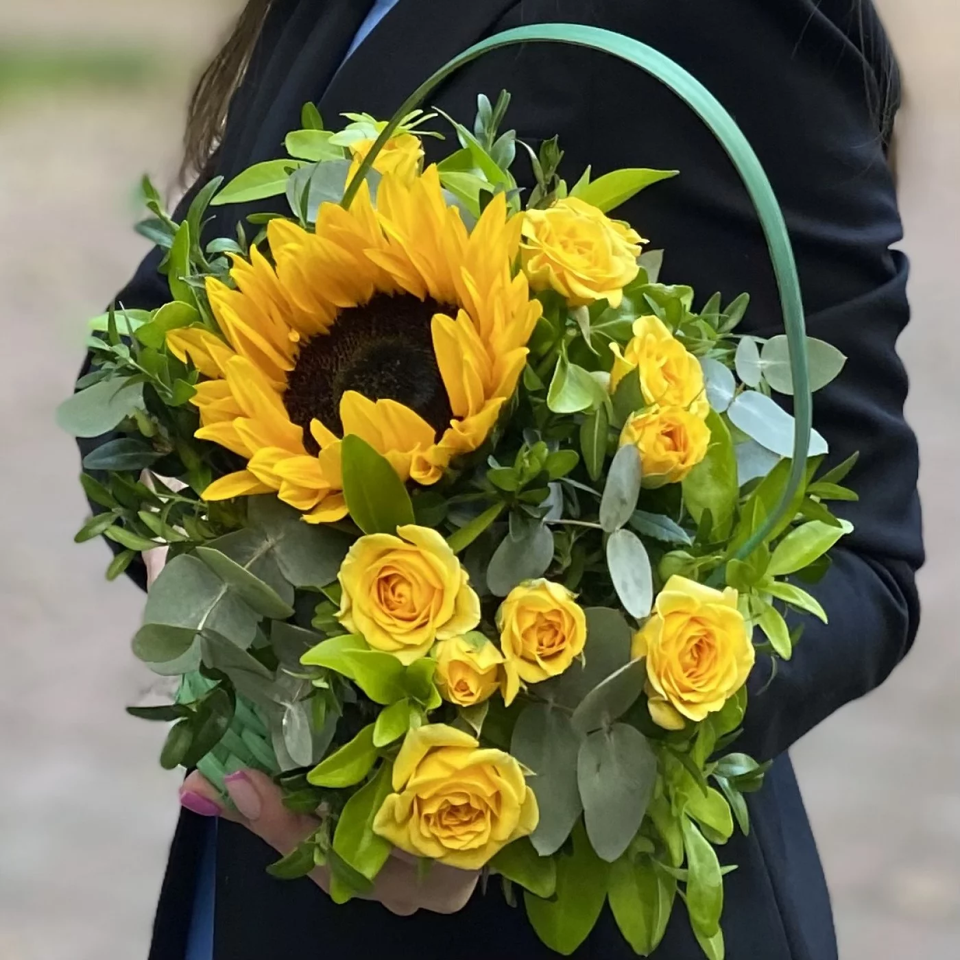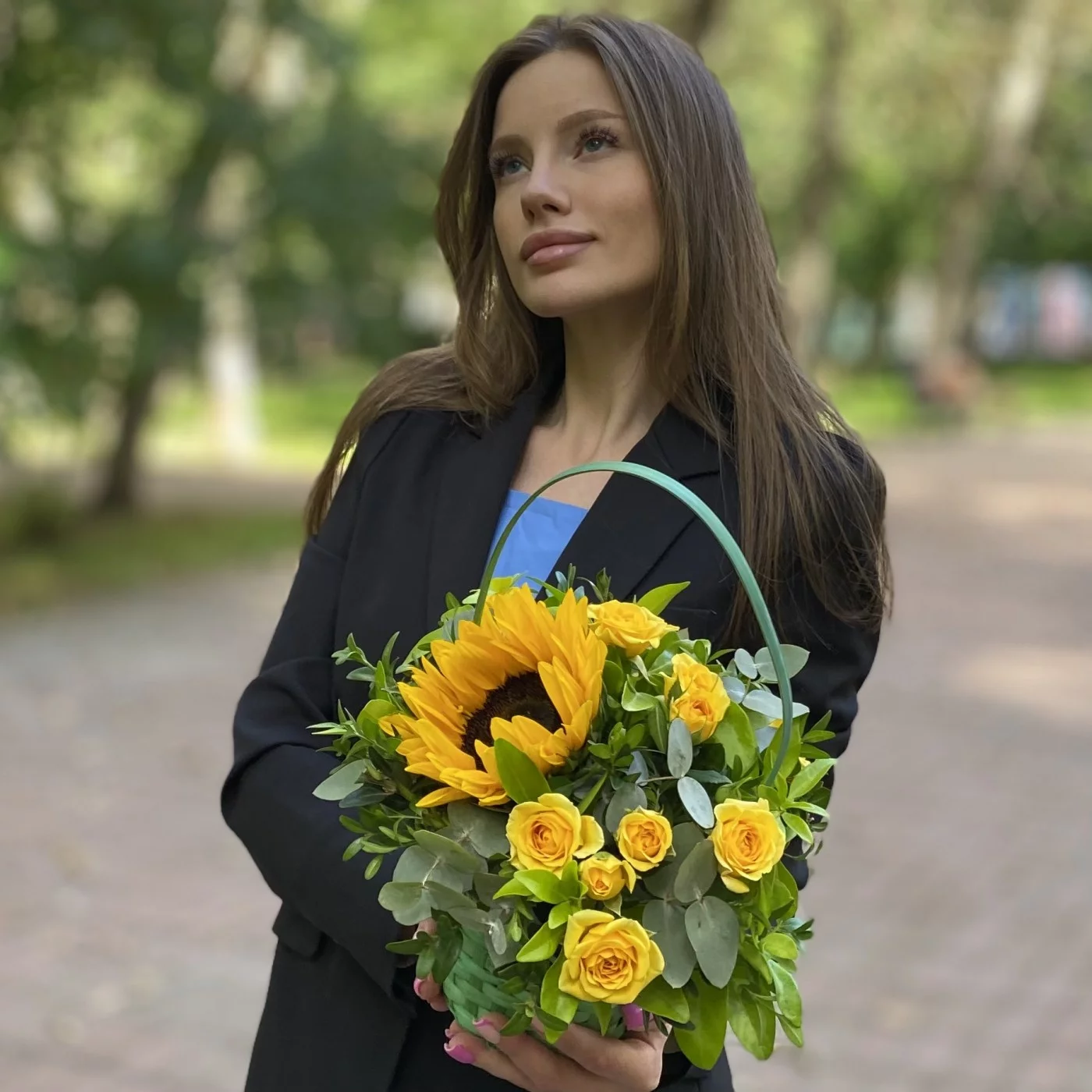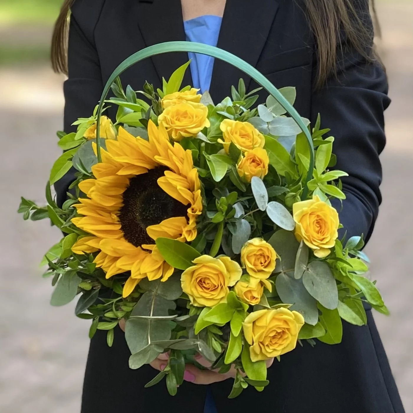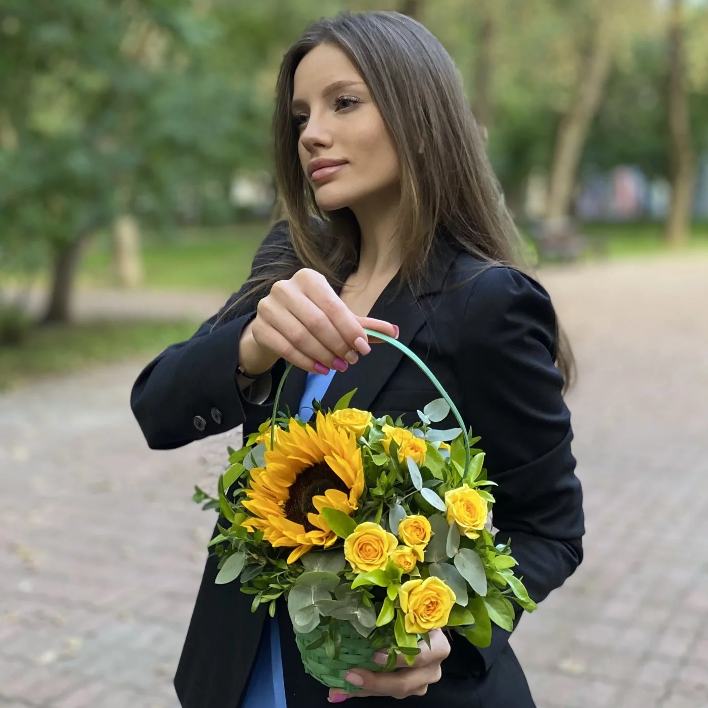 Корзиночка с подсолнухом и кустовой розой в желтых тонах, отлично подойдет в качестве поздравления учителя на 1 сентября.