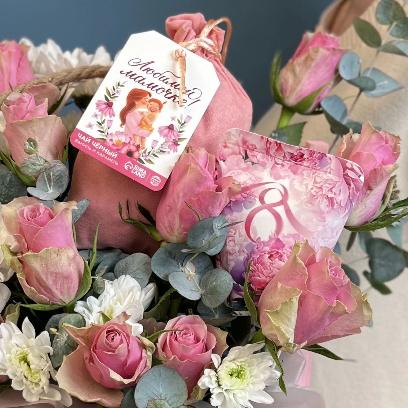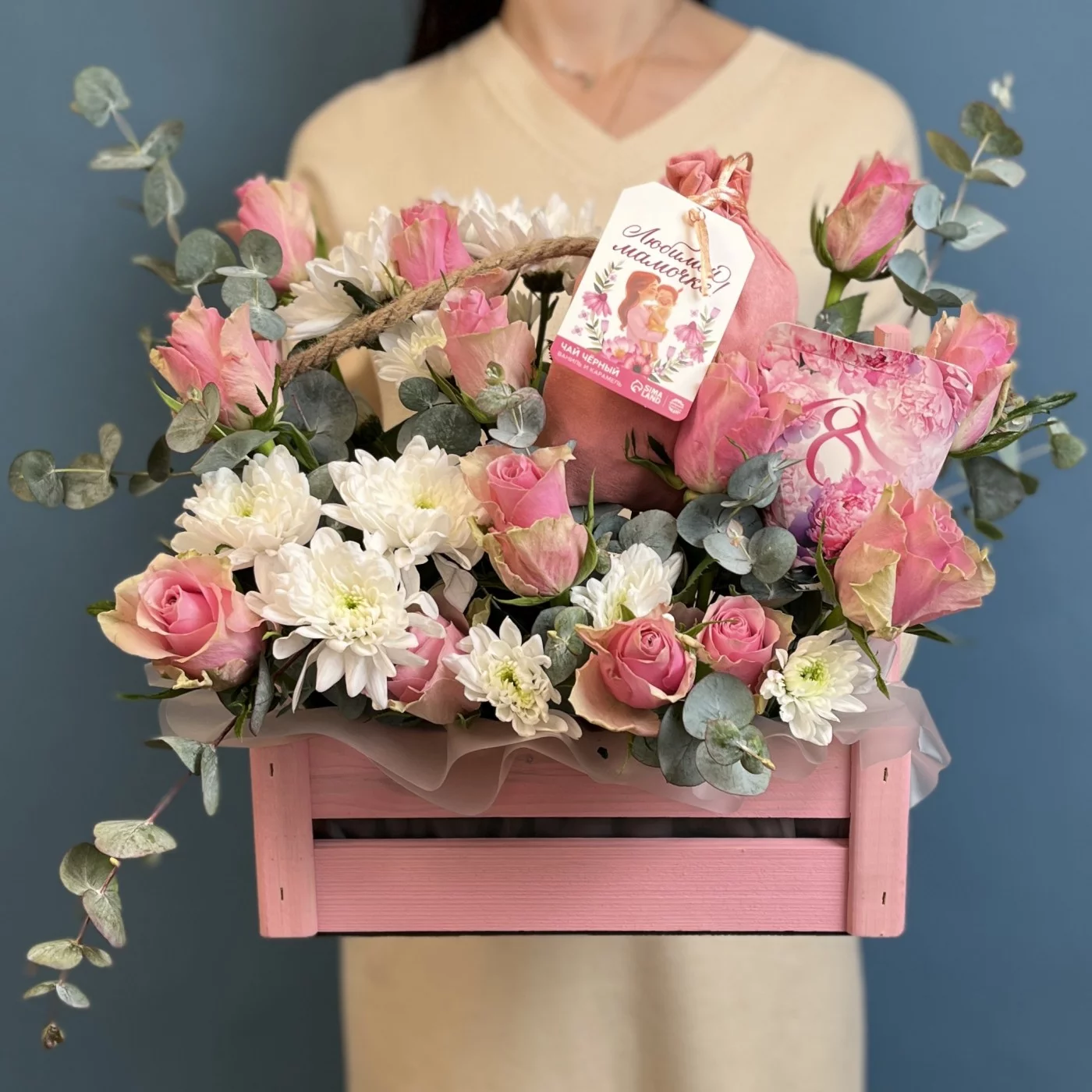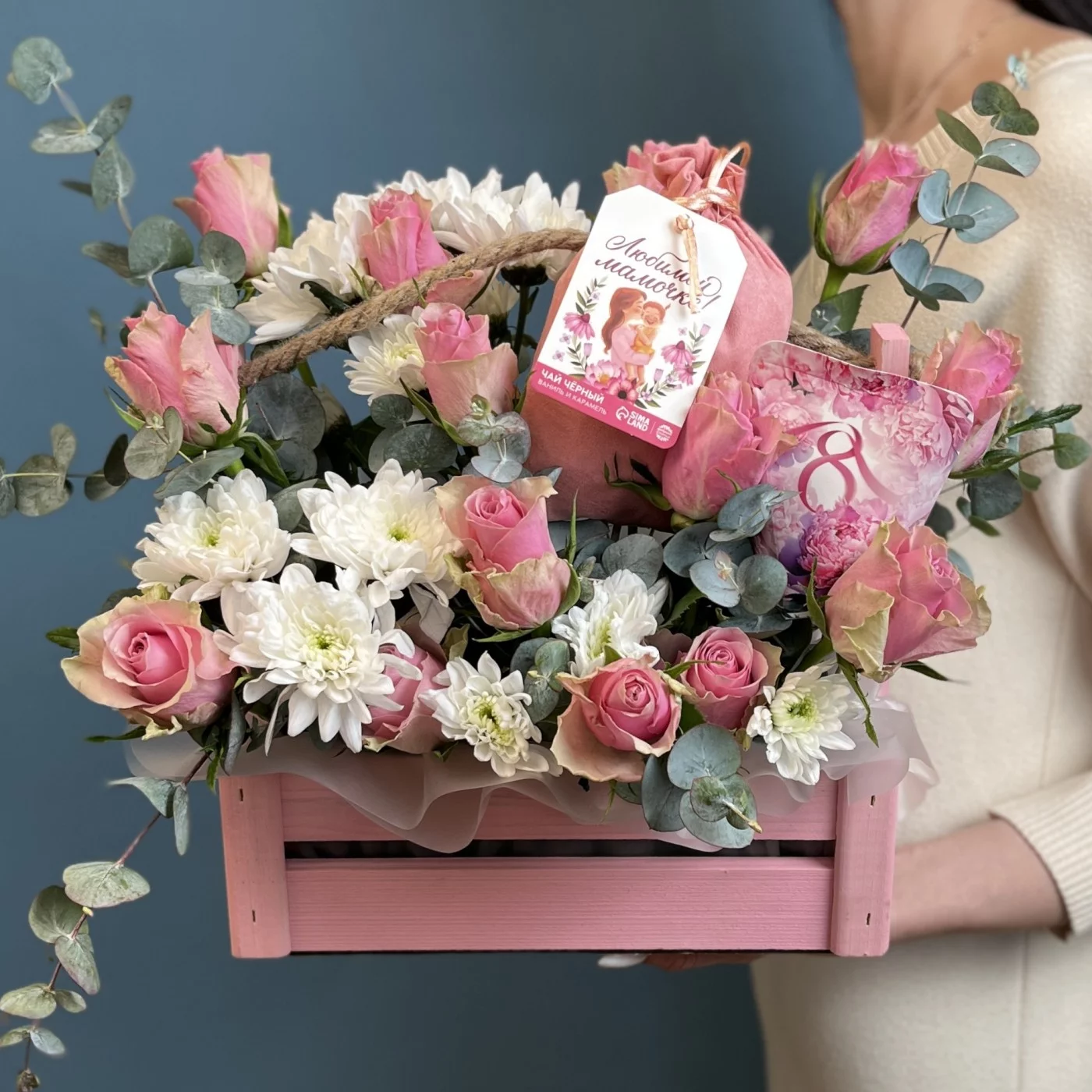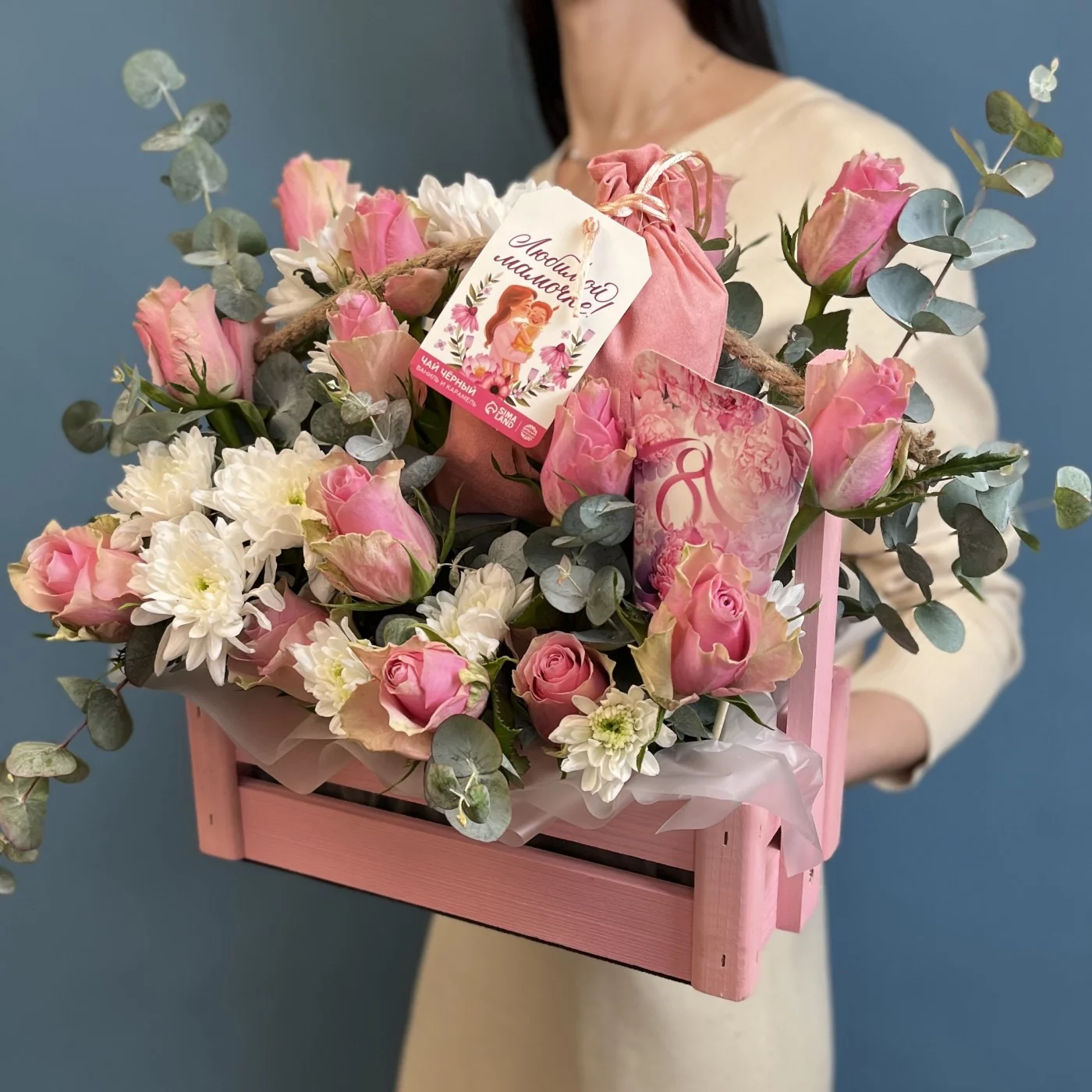 Композиция с розовыми розами Любимая мамочка — это символ любви и уважения, который оставит незабываемые впечатления и станет прекрасным дополнением к празднику 8 марта.