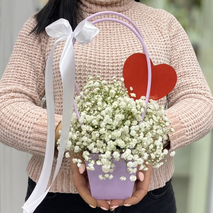 Композиция с гипсофилой в сумочке, порадуйте любимого человека воздушным букетом.