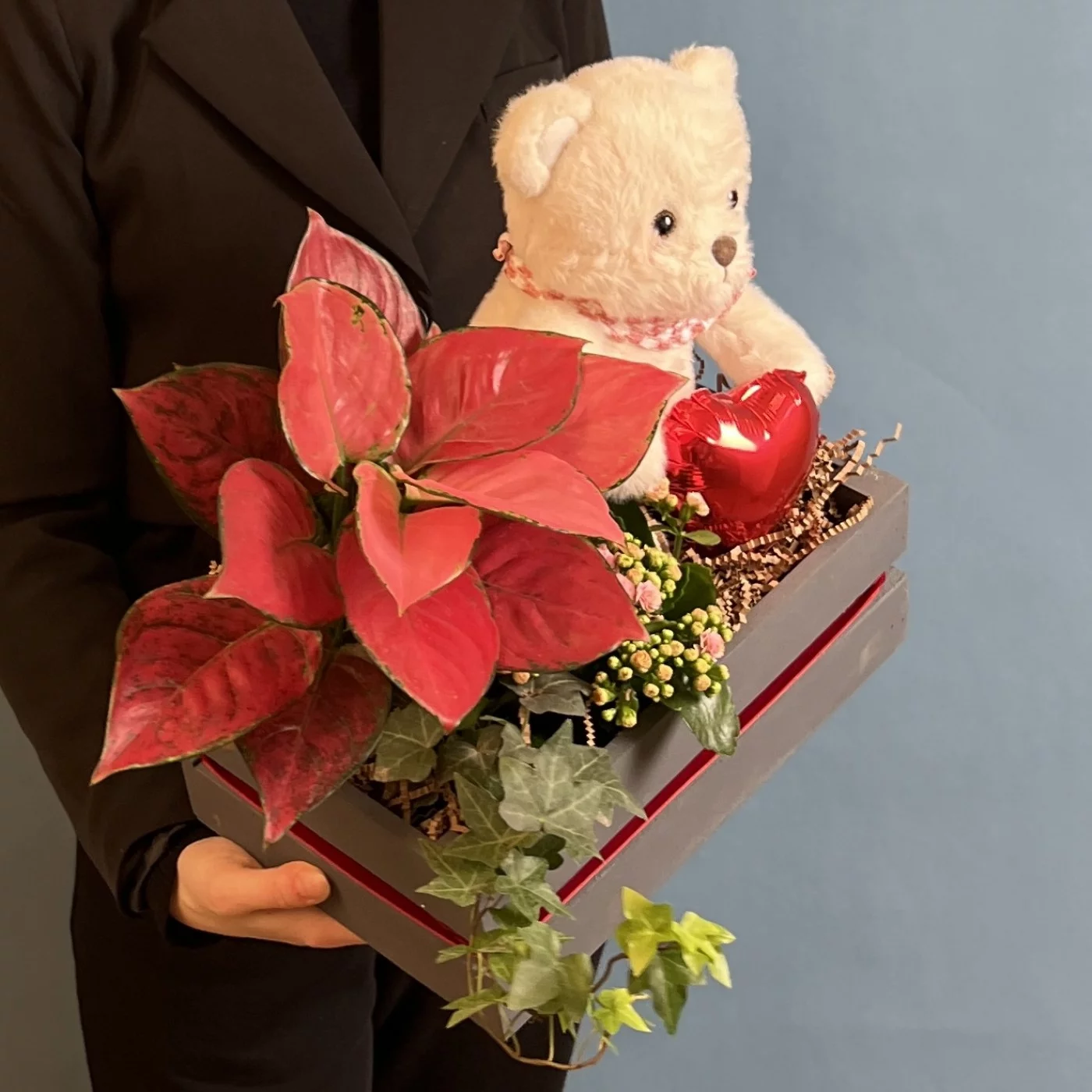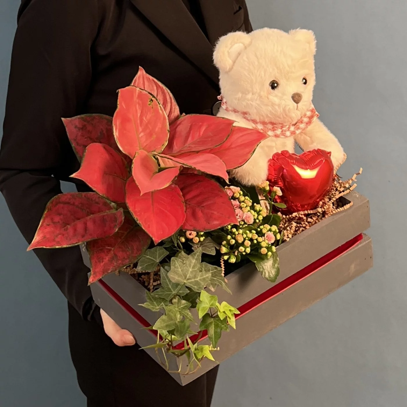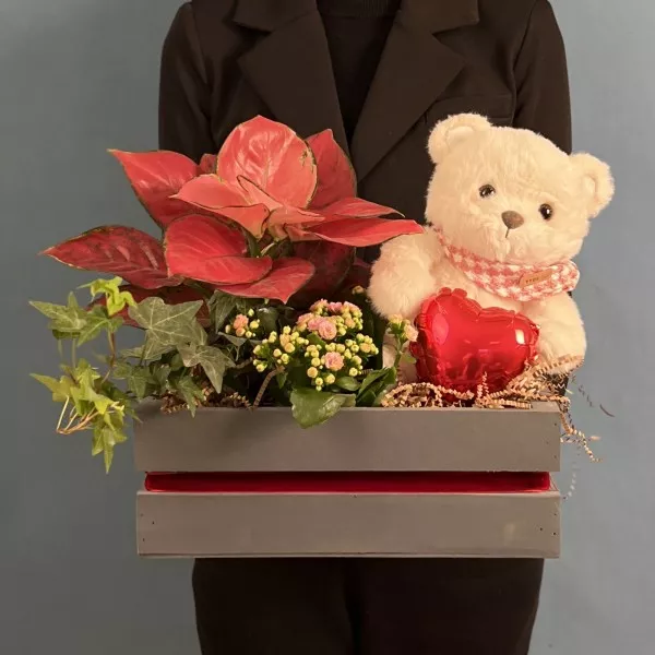 Состав композиции: аглаонема, хедера, каланхоэ, шар сердце микро, мишка с шарфом, наполнитель бумажный, лента бархат, ящик.