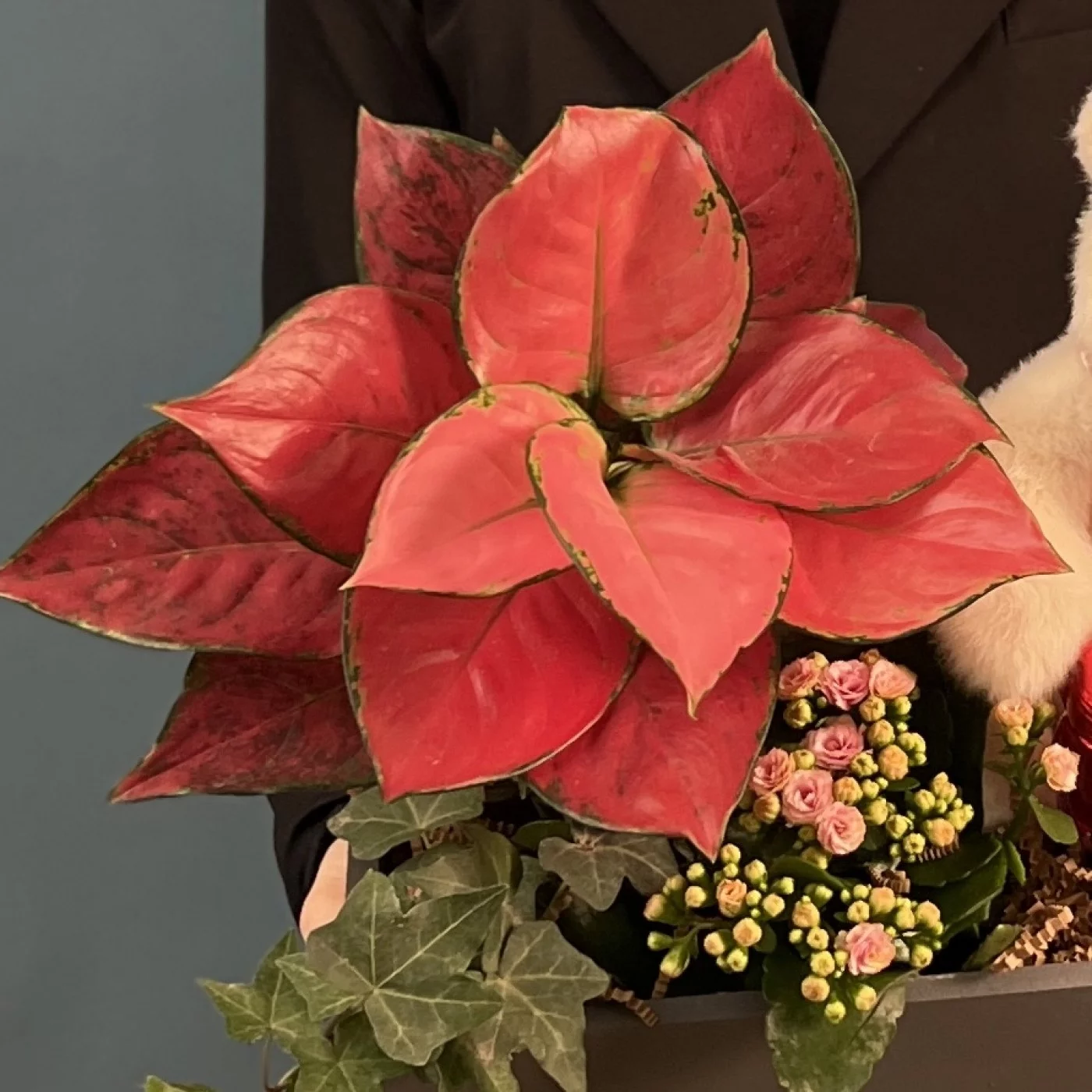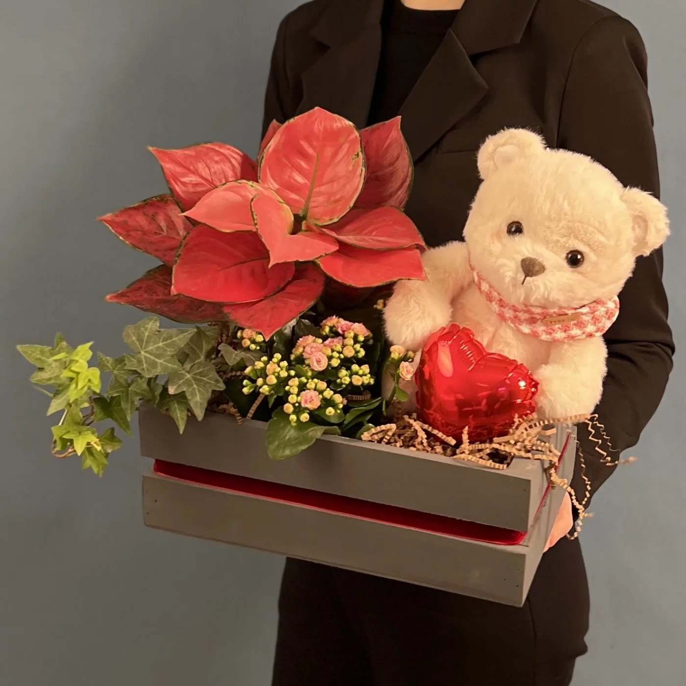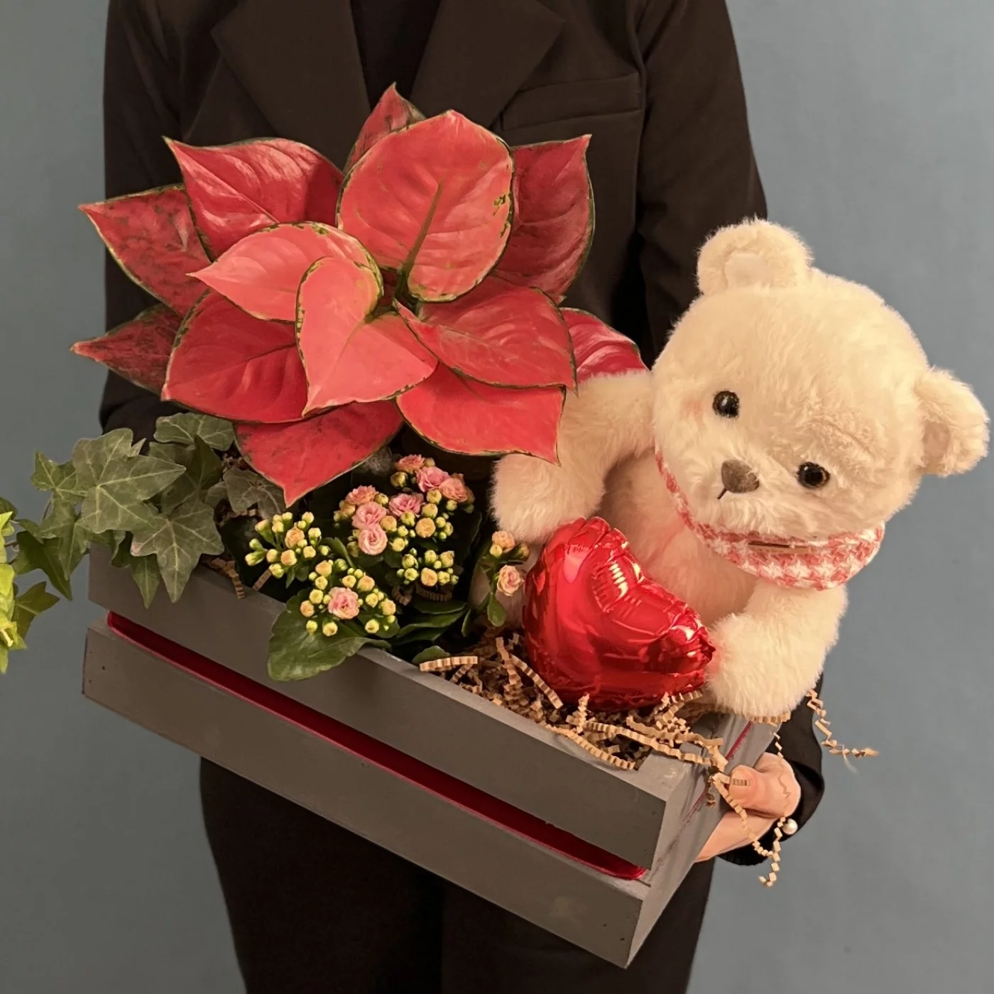 Состав композиции: аглаонема, хедера, каланхоэ, шар сердце микро, мишка с шарфом, наполнитель бумажный, лента бархат, ящик.