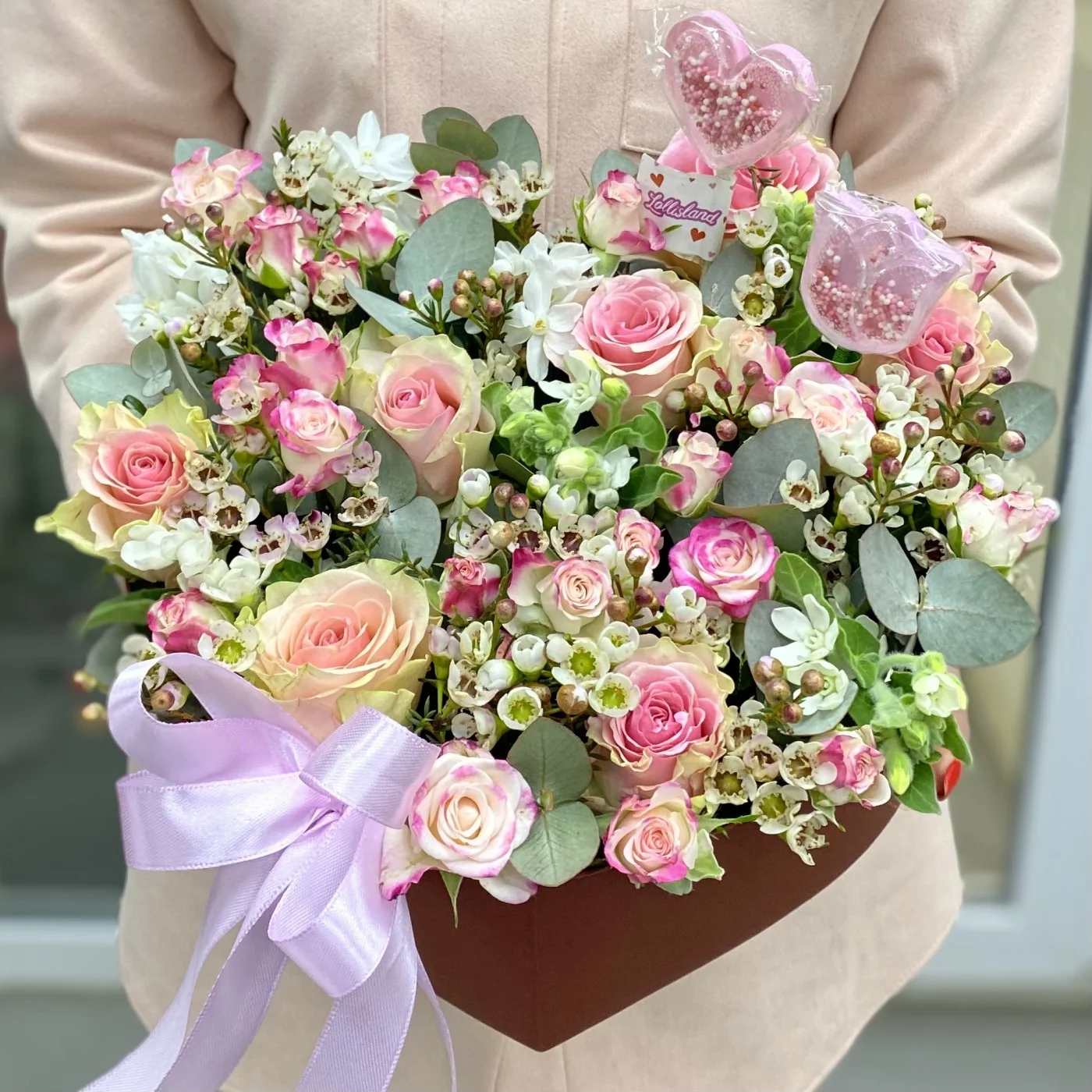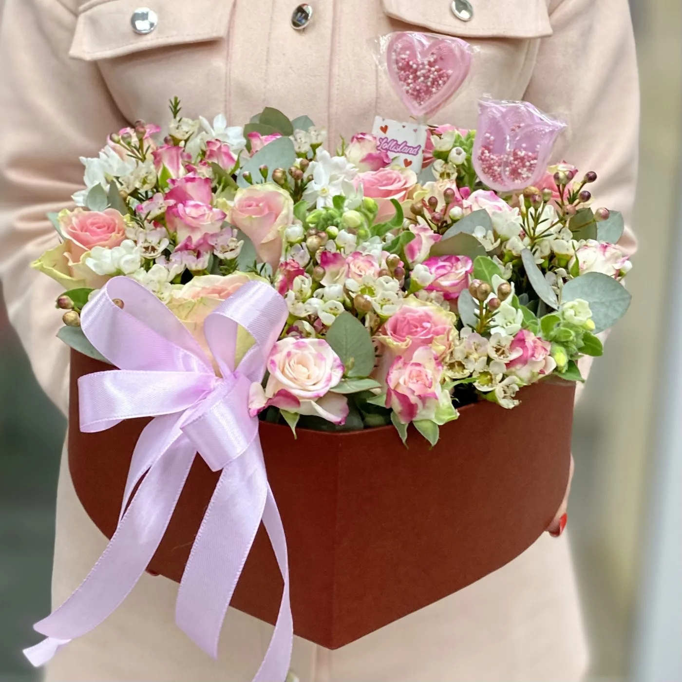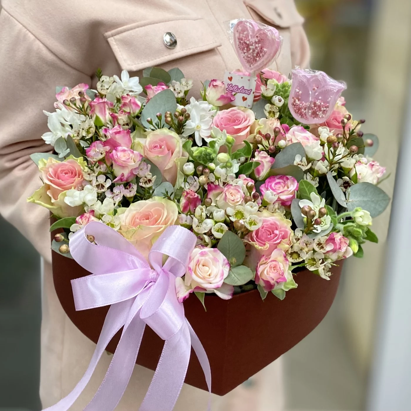 Композиция в форме сердца наполненная сочетанием цветов нежнейших оттенков, сухоцветами и сладостями.