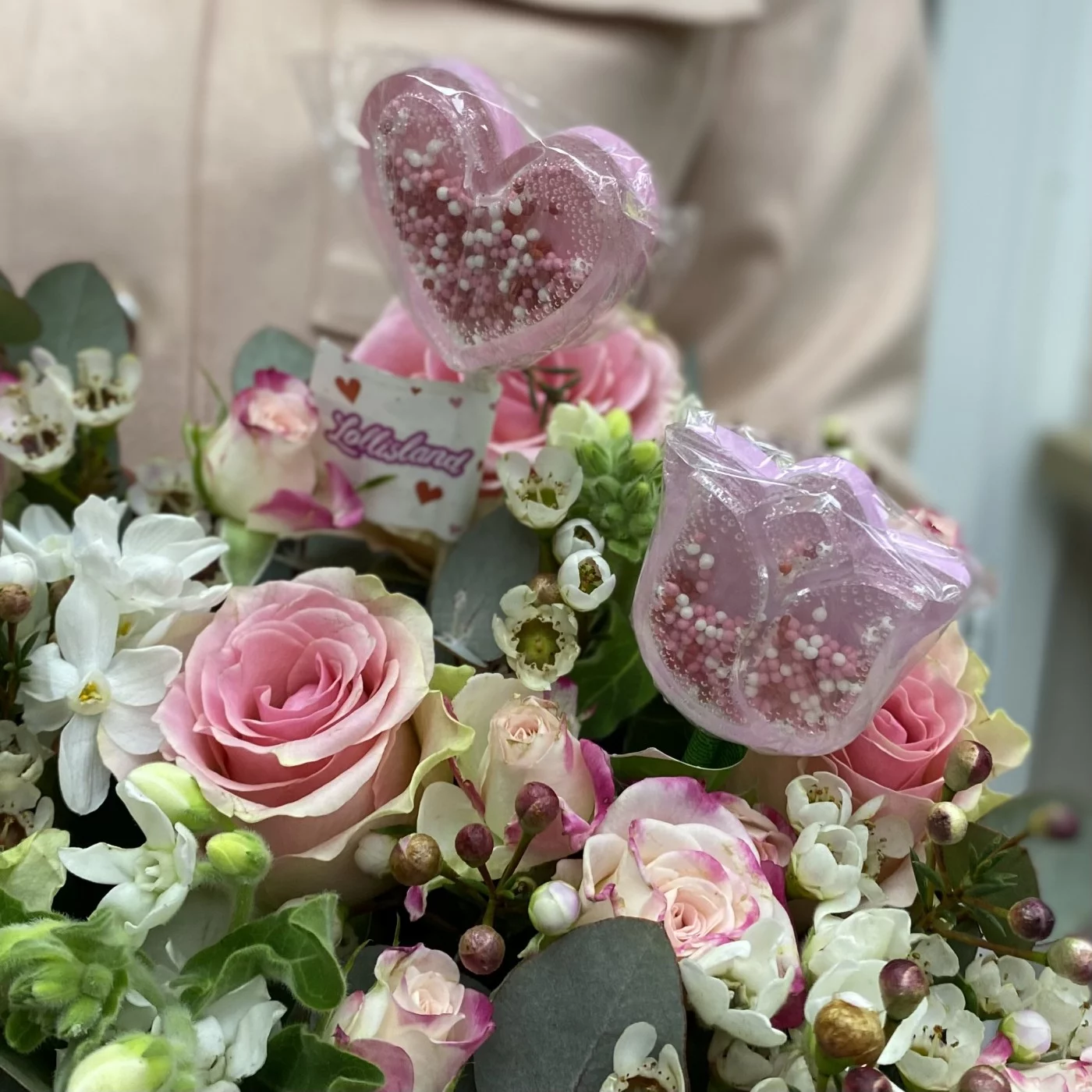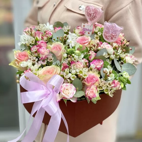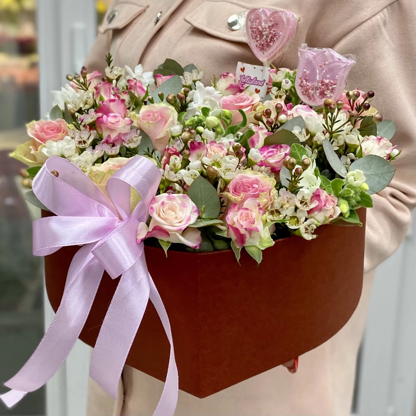 Композиция в форме сердца наполненная сочетанием цветов нежнейших оттенков, сухоцветами и сладостями.