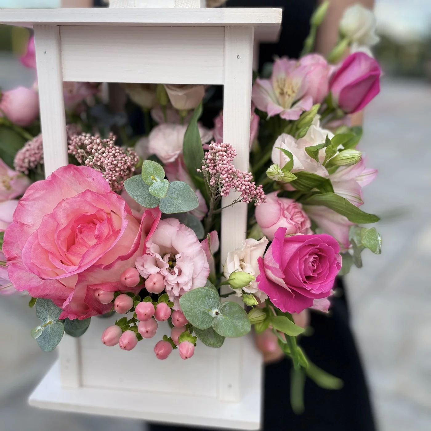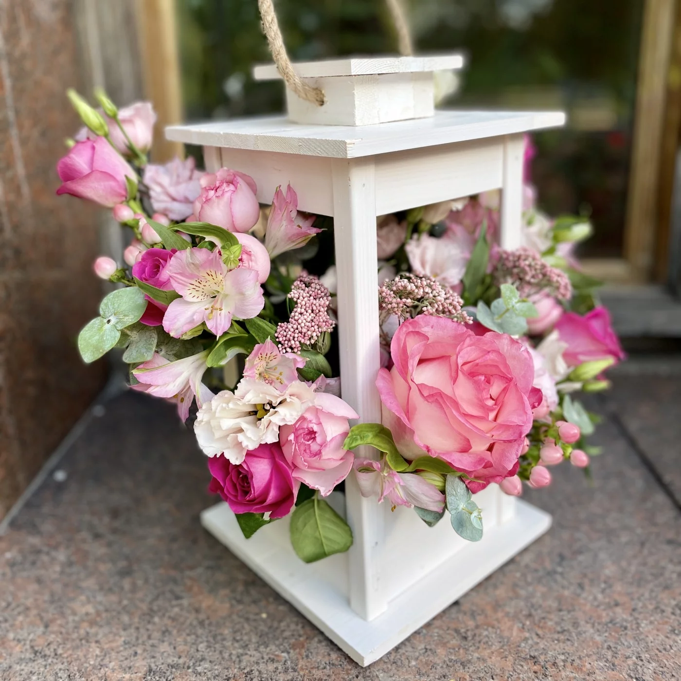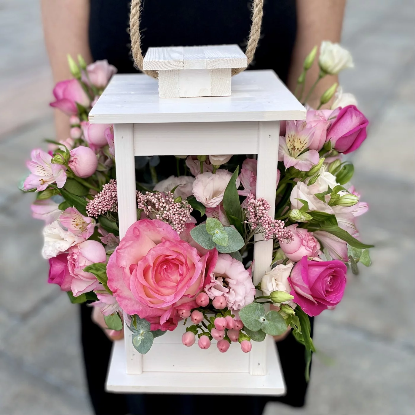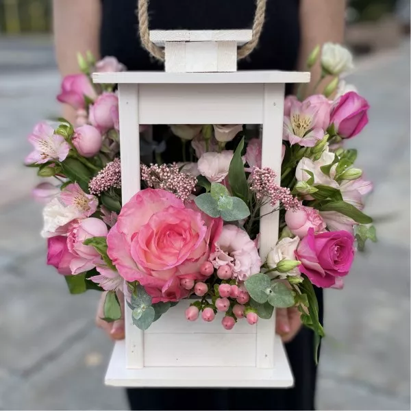 Нежная и ароматная композиция из пионовидных роз и эустом украшена розовыми ягодами гипериума, прекрасный подарок для девушек, стильное украшение пространства. Композиция в деревянном фонаре ручной работы — эксклюзивный подарок, красиво впишется в любой интерьер, а получатель непременно оценит практичность, ведь фонарь в дальнейшем можно использовать для декорирования интерьера, например, поставив в него электросвечу или композицию из сухоцветов.