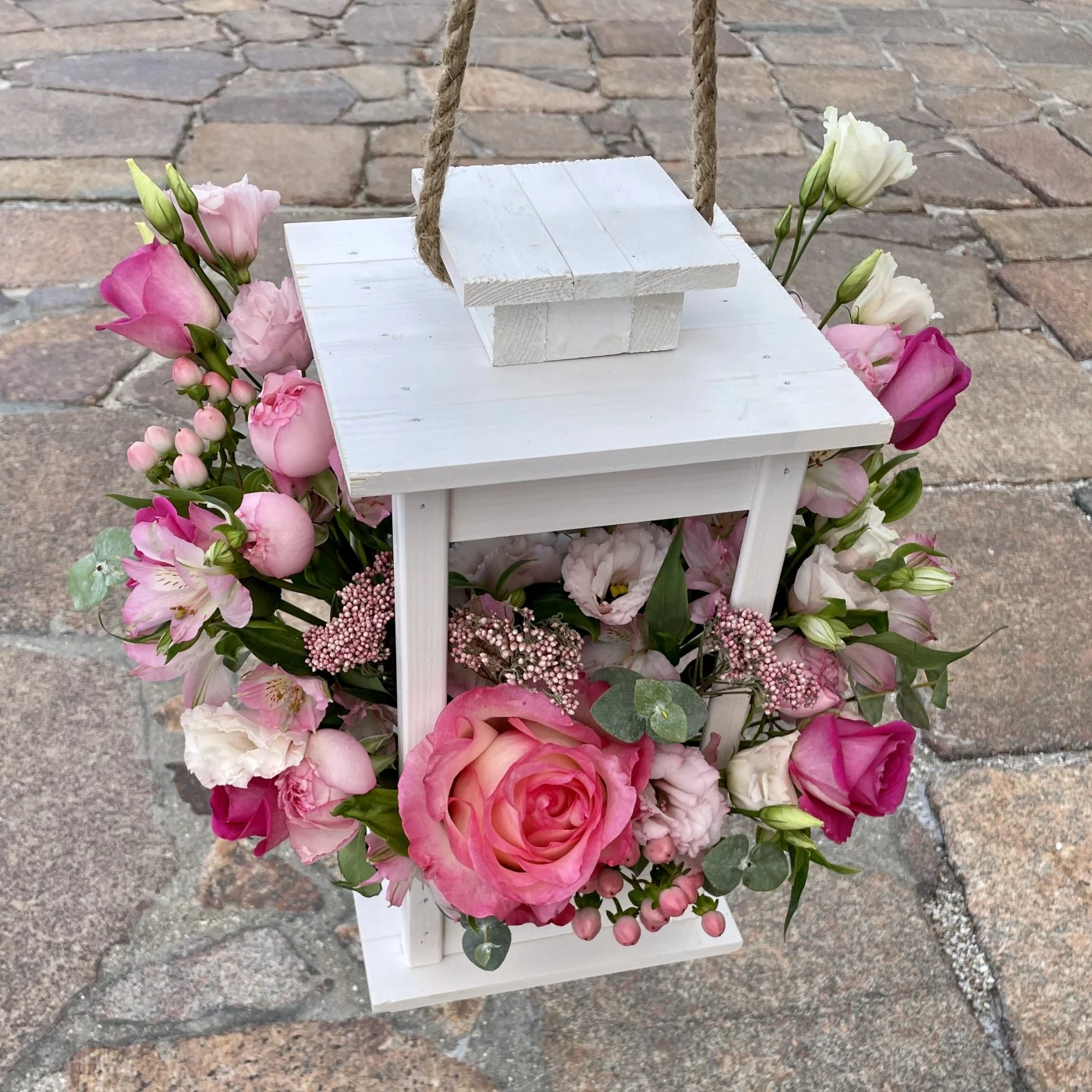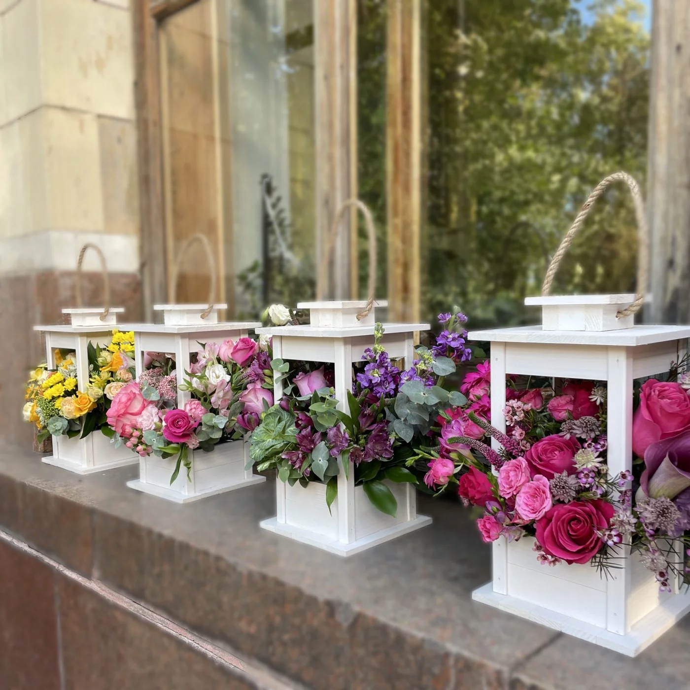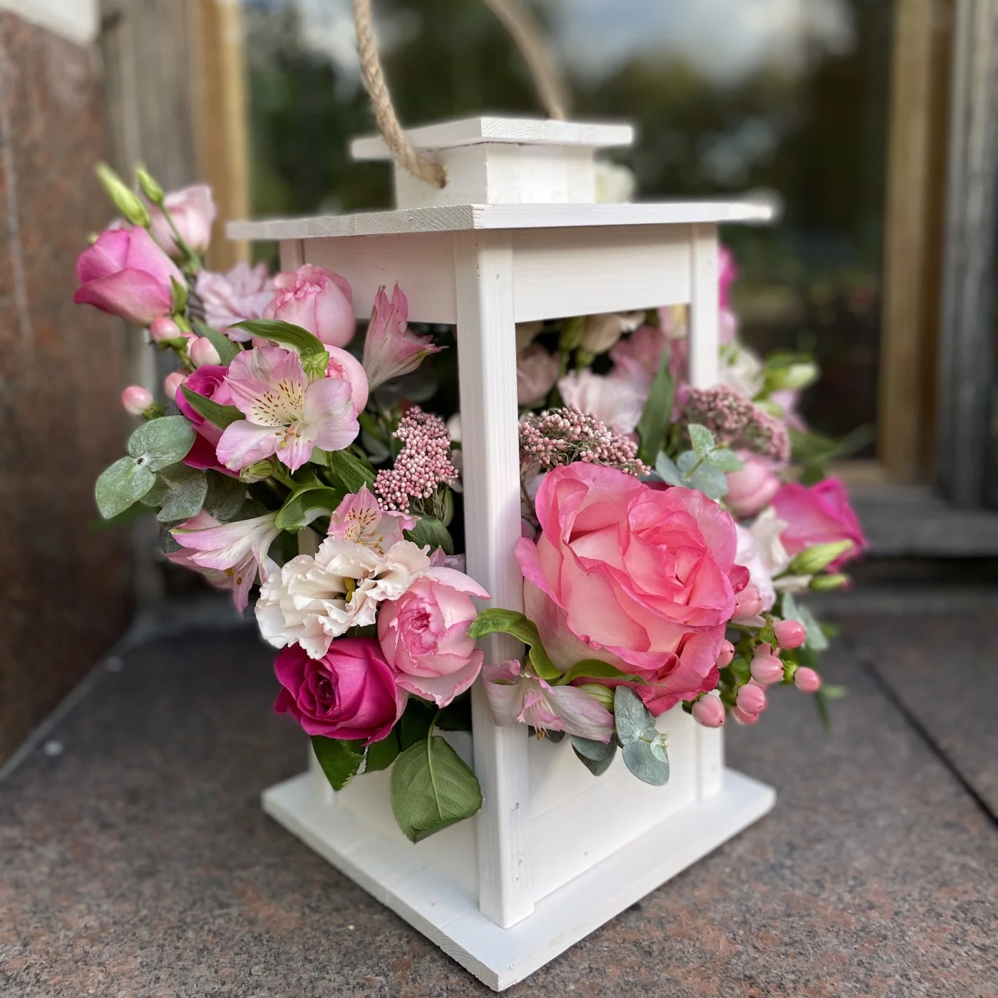 Нежная и ароматная композиция из пионовидных роз и эустом украшена розовыми ягодами гипериума, прекрасный подарок для девушек, стильное украшение пространства. Композиция в деревянном фонаре ручной работы — эксклюзивный подарок, красиво впишется в любой интерьер, а получатель непременно оценит практичность, ведь фонарь в дальнейшем можно использовать для декорирования интерьера, например, поставив в него электросвечу или композицию из сухоцветов.