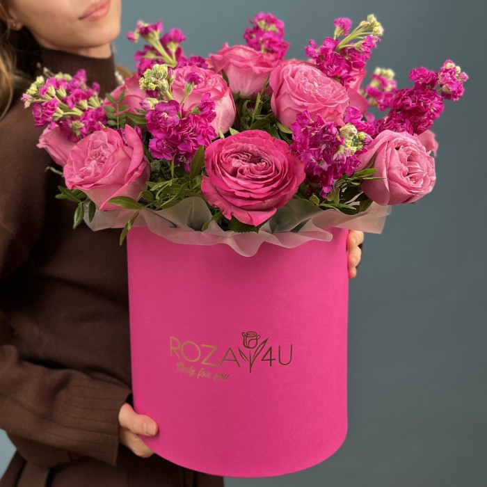 Композиция в коробке с маттиолой и пионовидной розой сорта Малинка — это замечательный выбор для любого торжества или в качестве подарка.