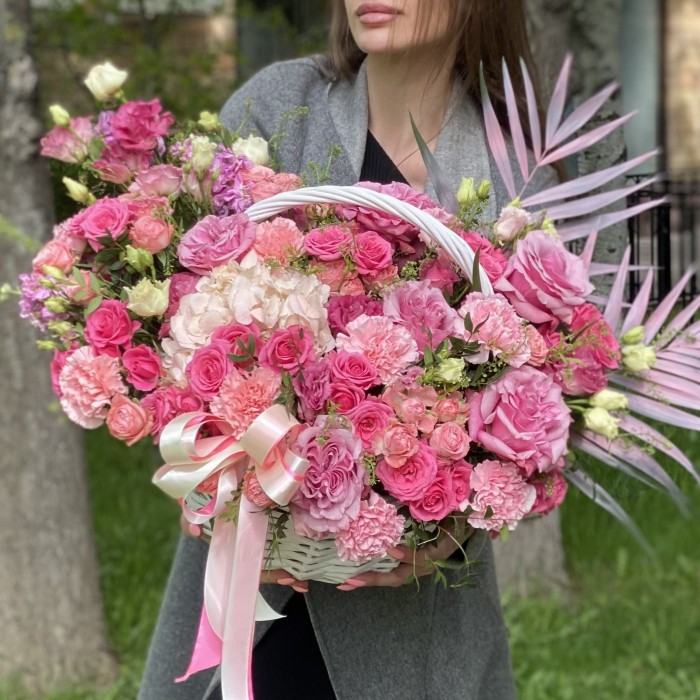 Роскошная корзина в розовых тонах с гортензией и розами - отличный подарок для любимой женщины.