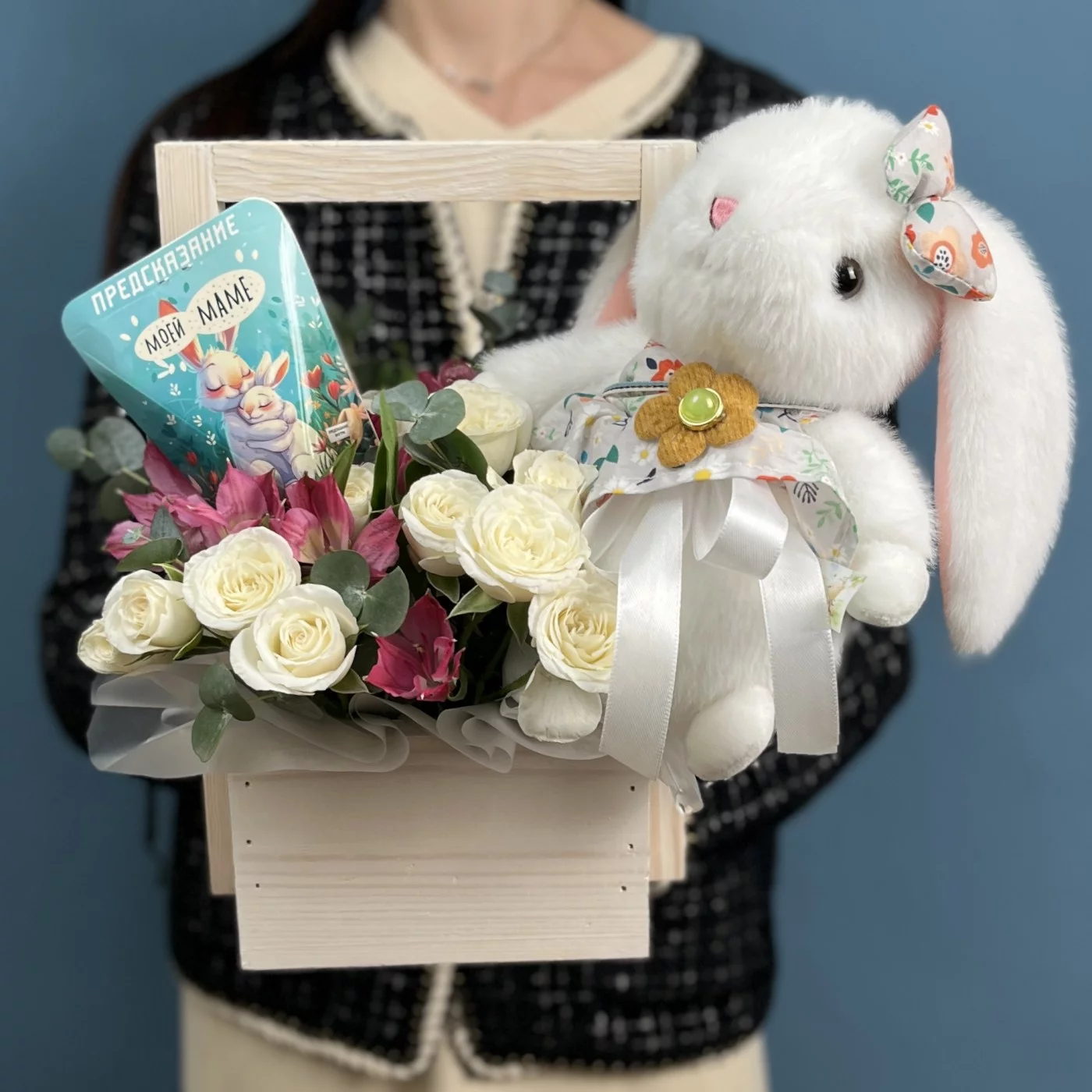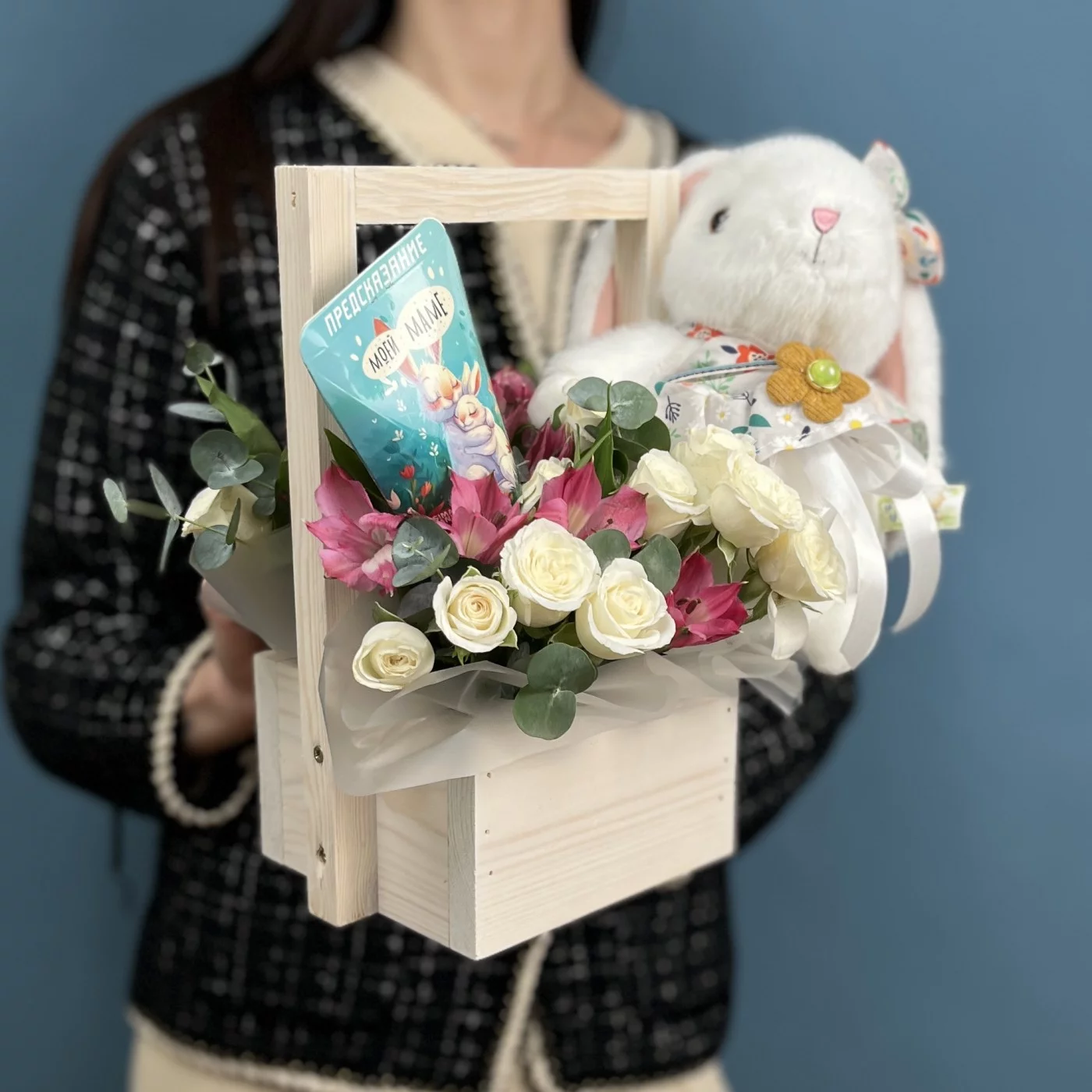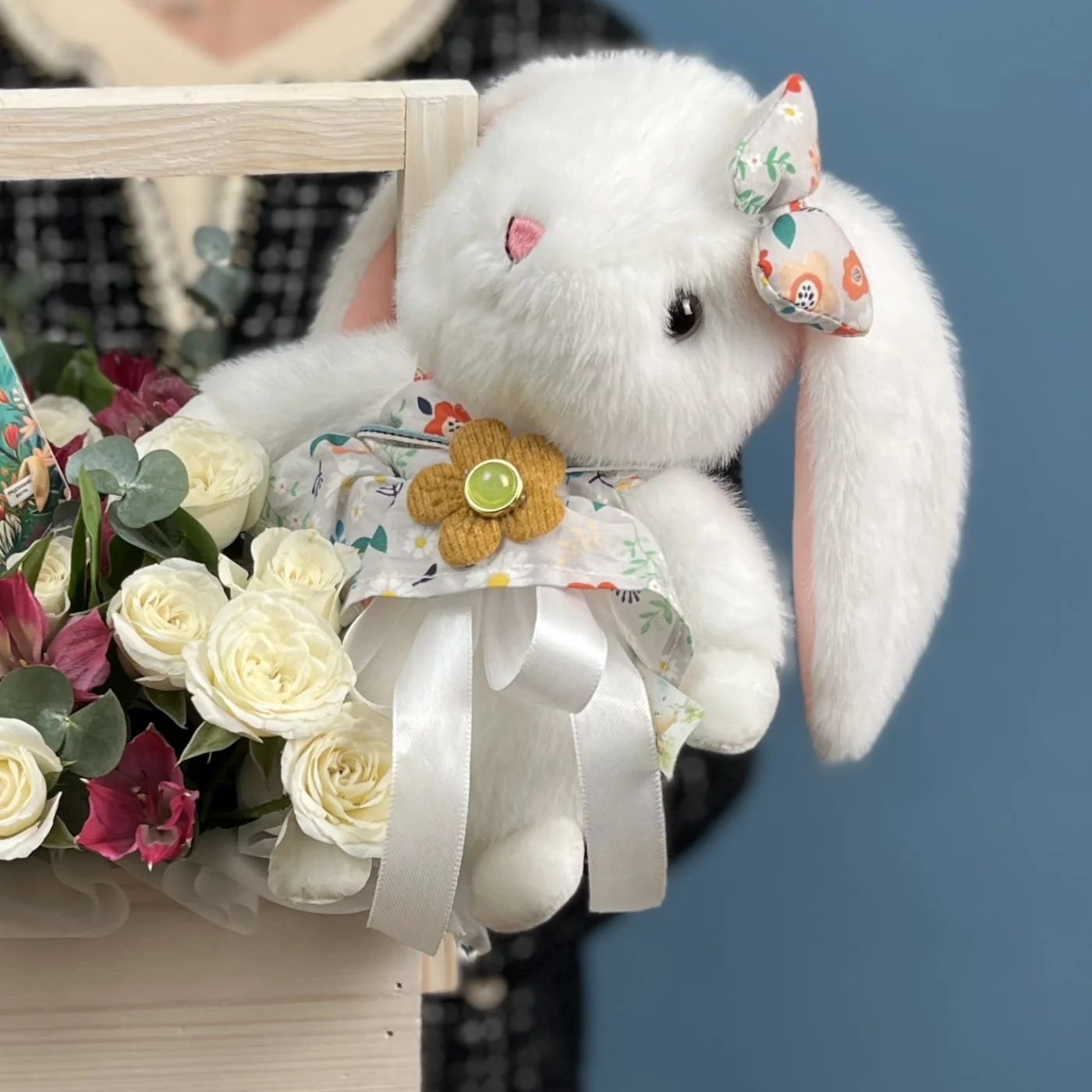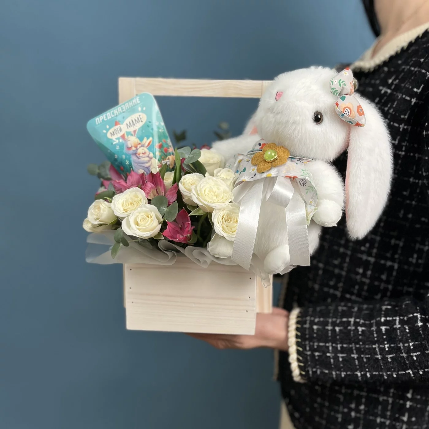 Эта очаровательная композиция с зайчиком и цветами в деревянном кашпо станет прекрасным подарком добавляя уют и радость в любой интерьер.