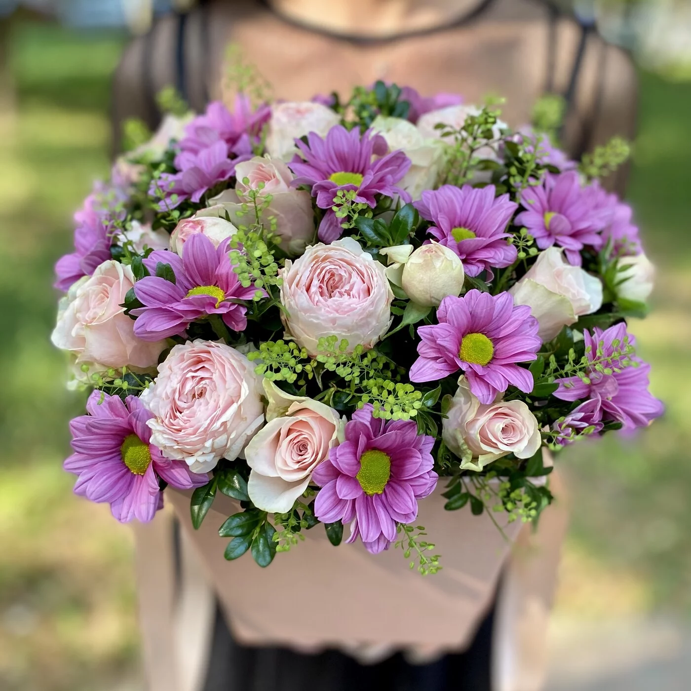 Нежная композиция роз и хризантем