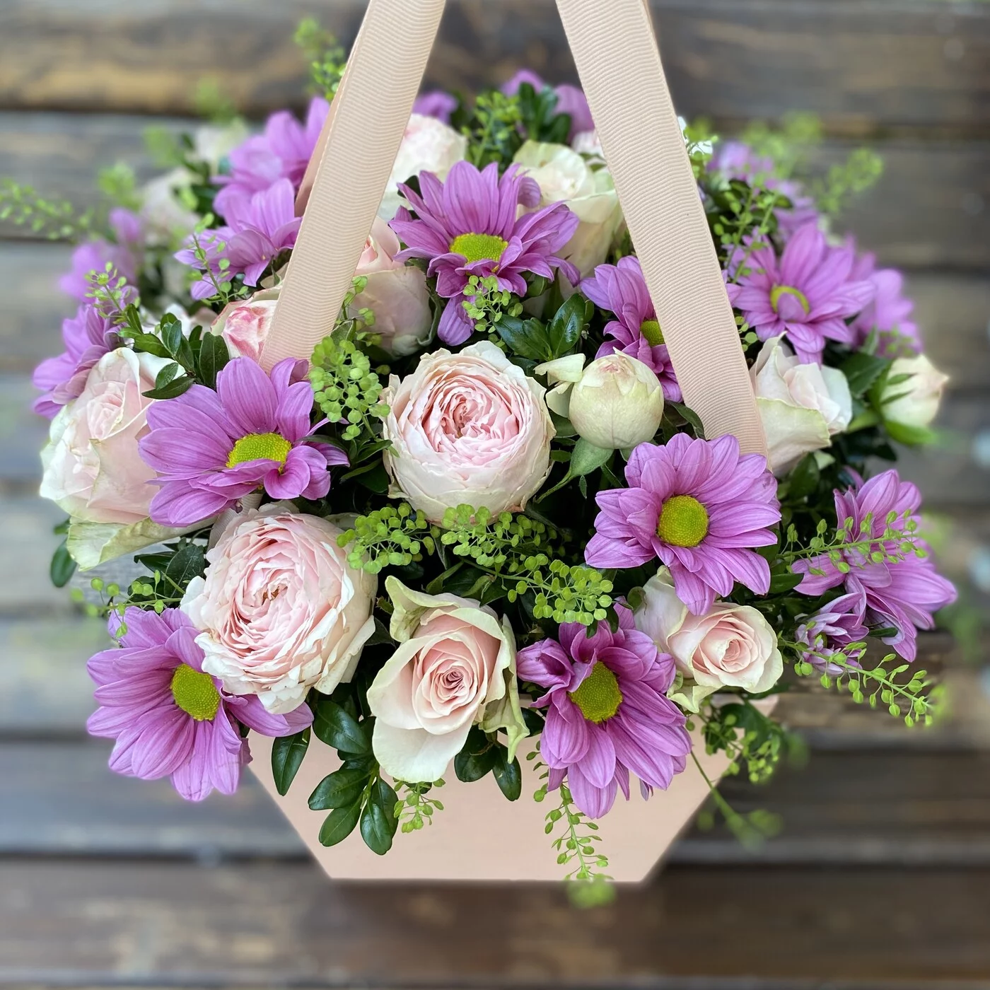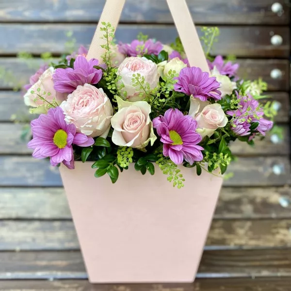 Нежная композиция в коробке с удобными ручками для транспортировки и переноски. Такую композицию вы можете преподнести на свидание или подарить в знак внимания.