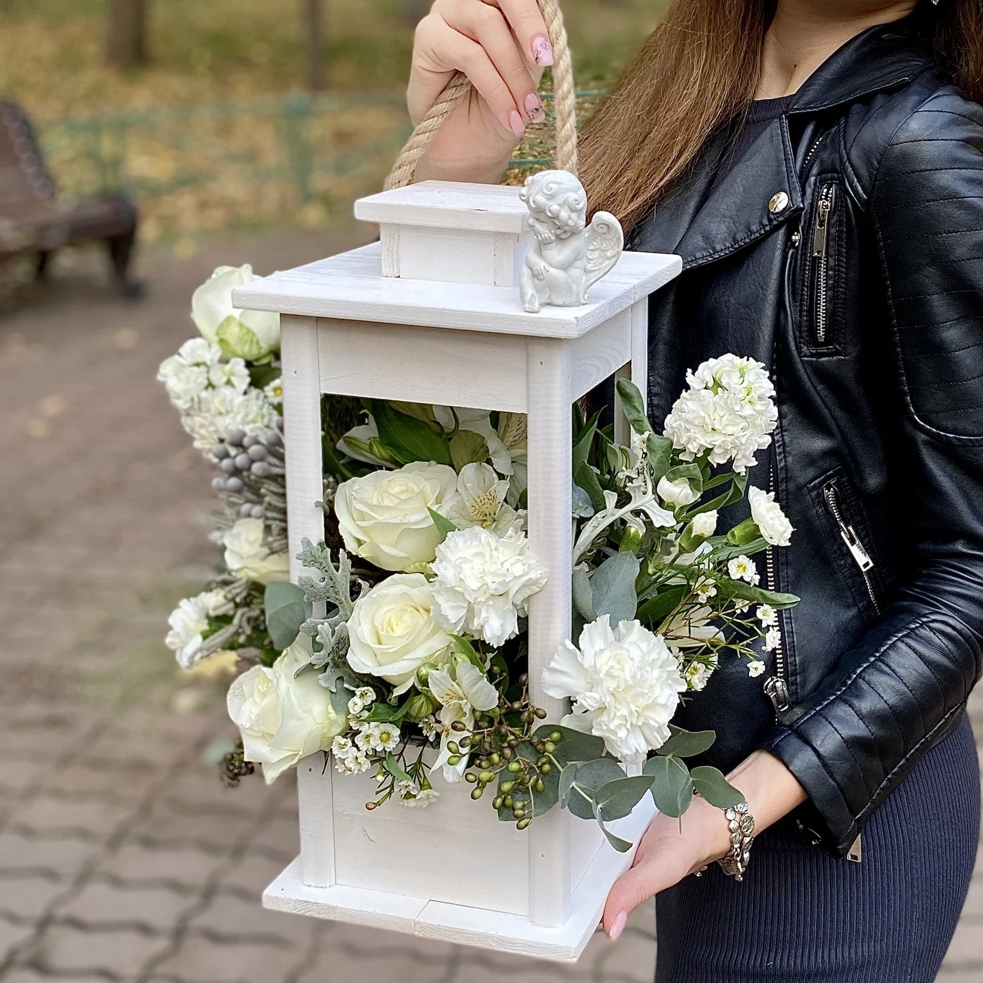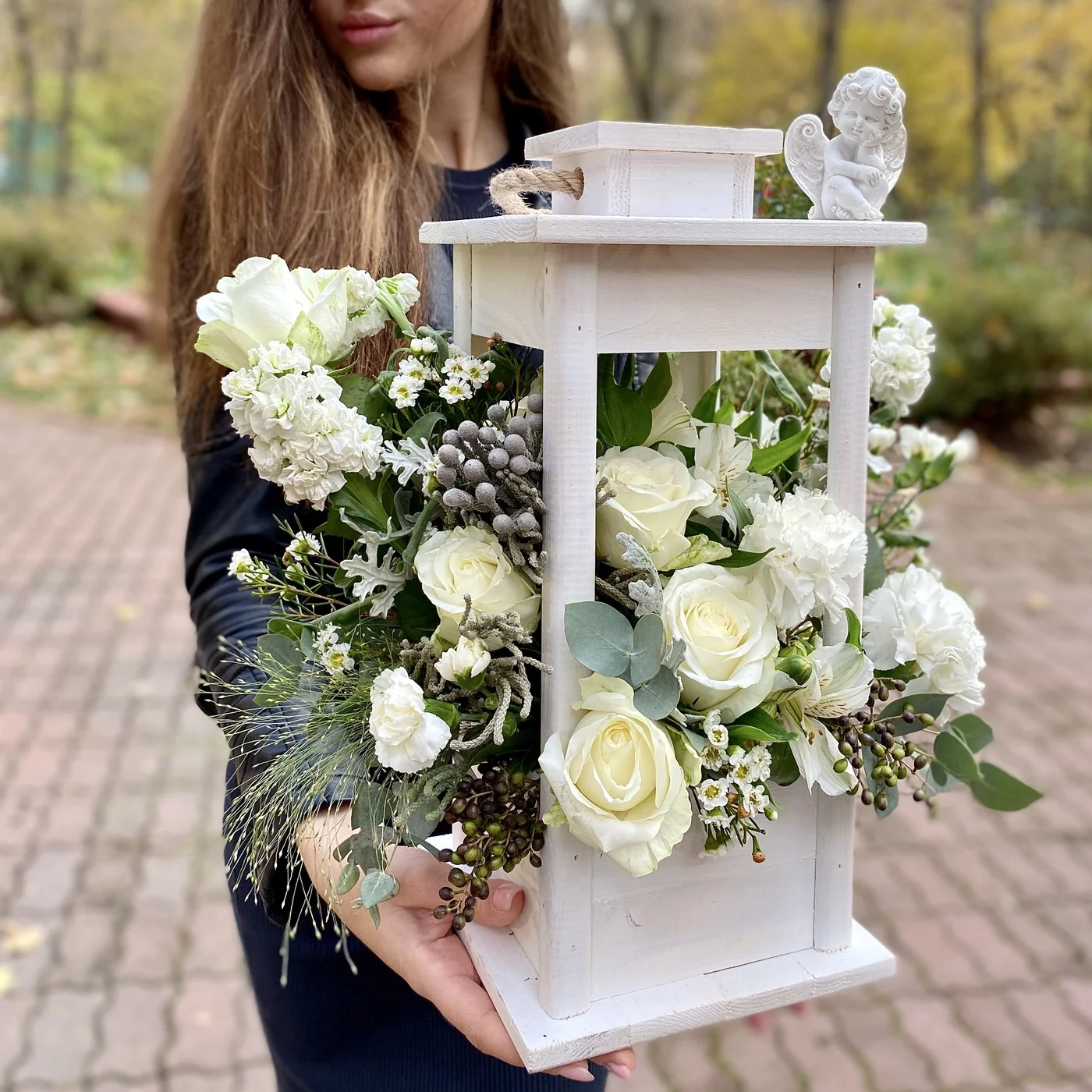 Состав композиции: роза – 8 шт, гвоздика – 2 шт., альстромерия – 2 шт., маттиола – 3 шт, бруния – 1 шт, шамелациум – 2 шт, гвоздика кустовая – 2 шт, эвкалипт, декор Ангел, фонарь.