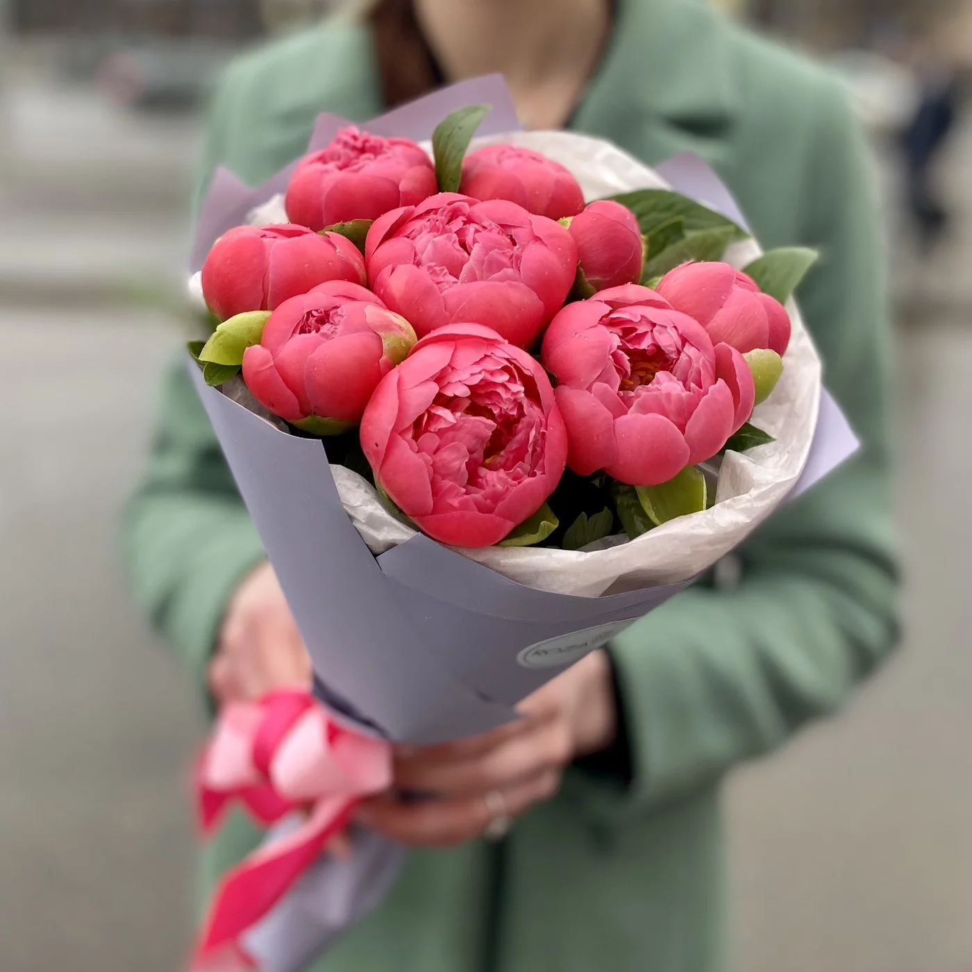 Яркие ароматные пионы кораллового цвета прекрасно сочетаются с матовой упаковкой нежно-сиреневого цвета, дополненной бумагой тишью.