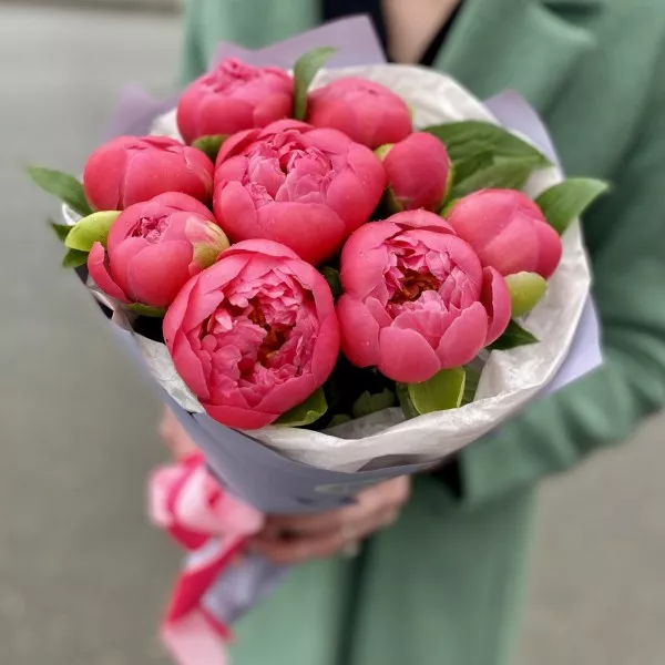 Букет из девяти коралловых пионов