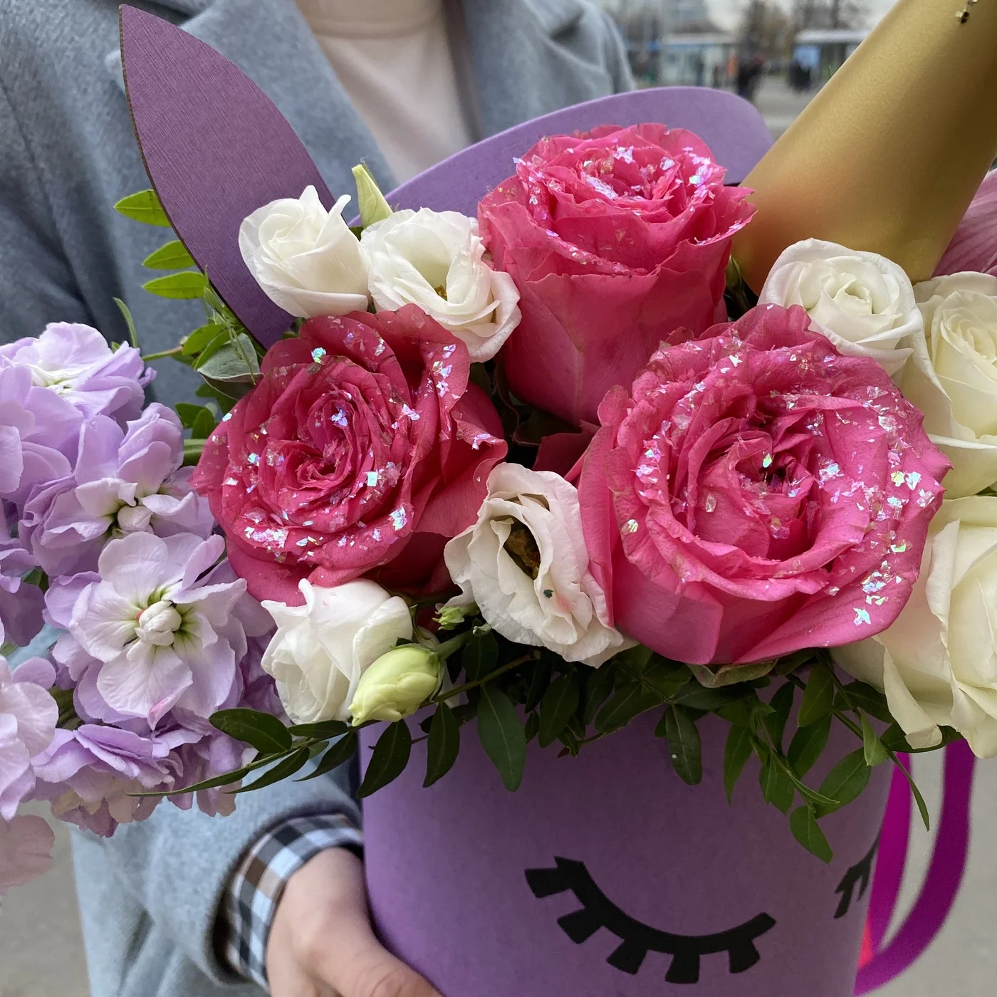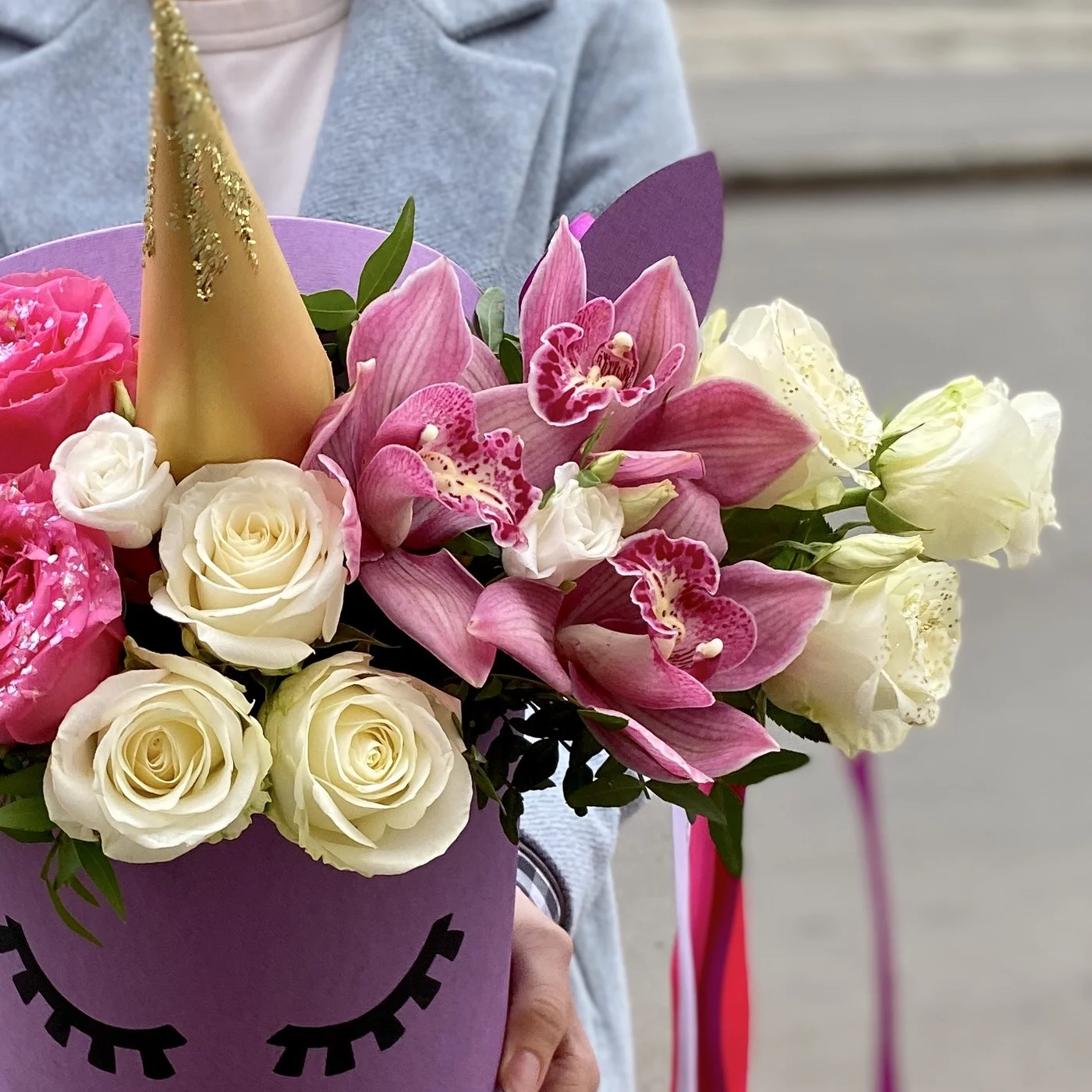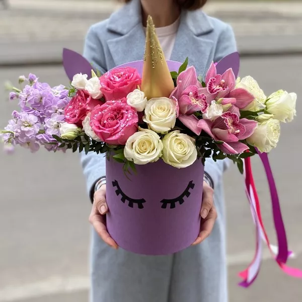 Нежная, одновременно с этим яркая, фактурная композиция из необыкновенных орхидеи, роз, эустомы и ароматной маттиолы в коробке, станет приятным и незабываемым подарком на День Рождения или просто комплиментом, для ребенка, молодой девушки или маме.