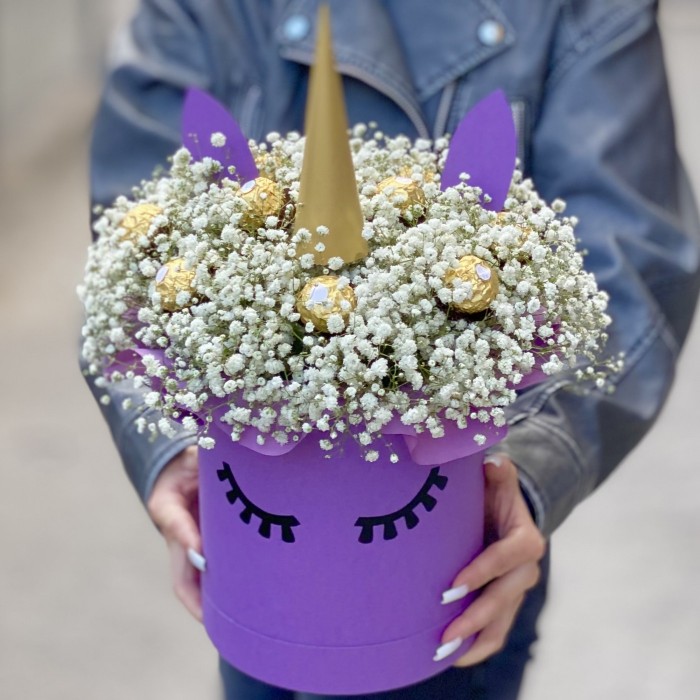 Милая коробка в виде единорога с гипсофилой. Эту композицию можно подарить и взрослым и детям на радостное событие.