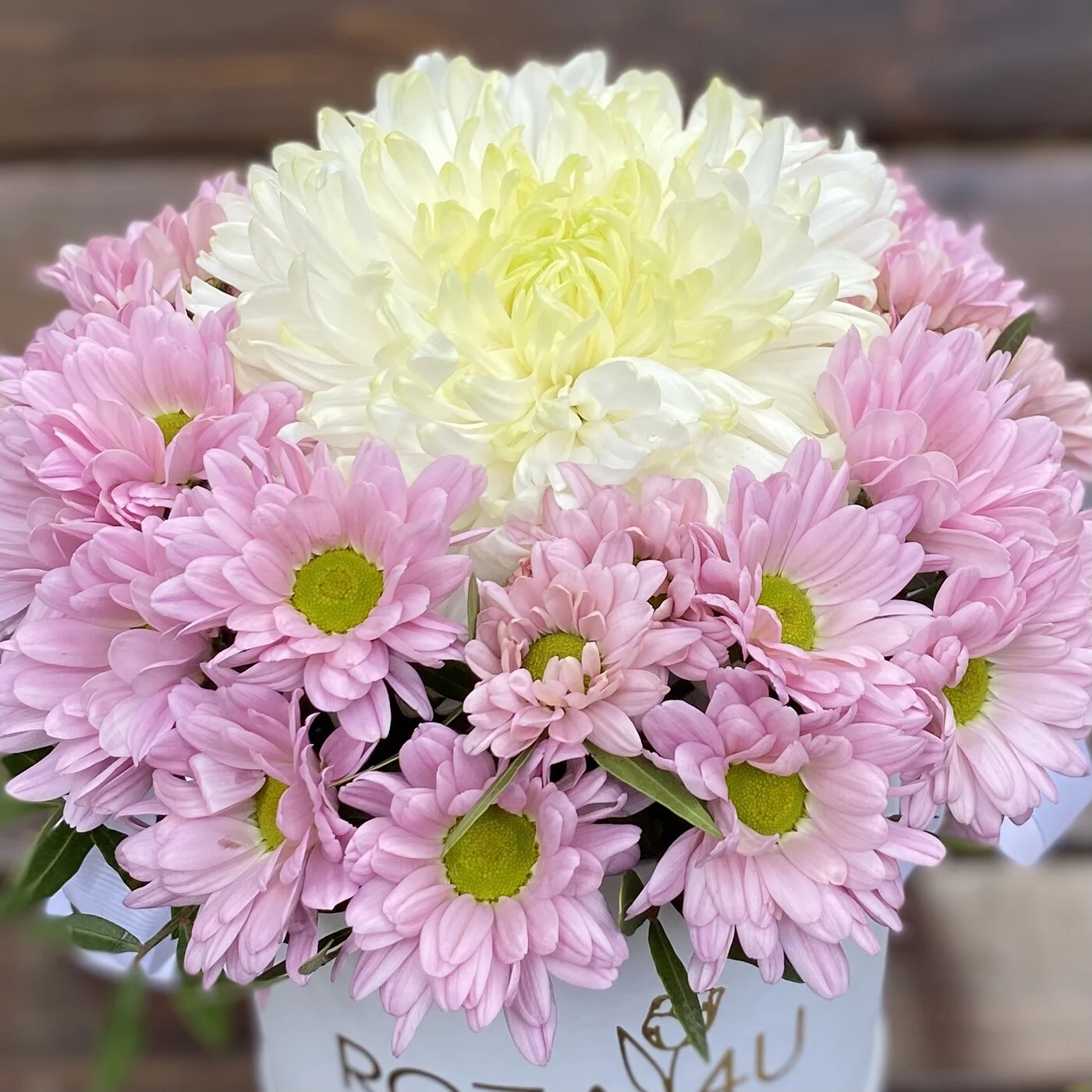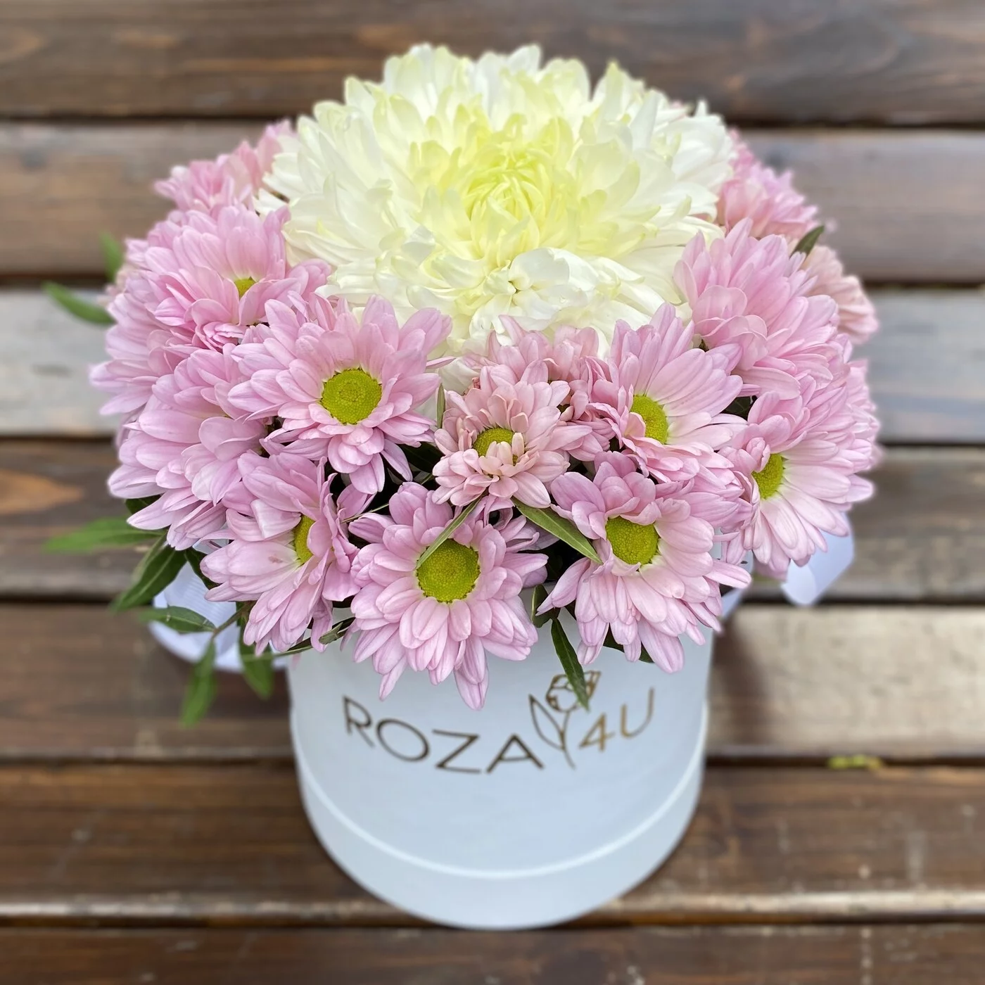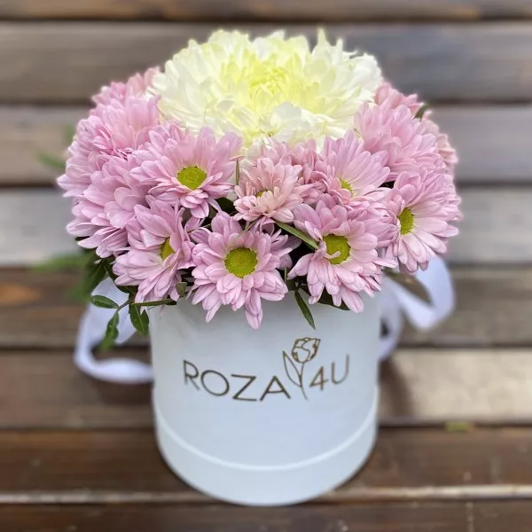 Небольшая, легкая композиция в коробке с ручками. Розовые ромашковые хризантемы смотрятся очень нежно и минималистично. Коробка удобная для переноски. Такую композицию можно вручить ребенку или купить ее для подарка учителю на первое сентября или на выпускной в детский садик.