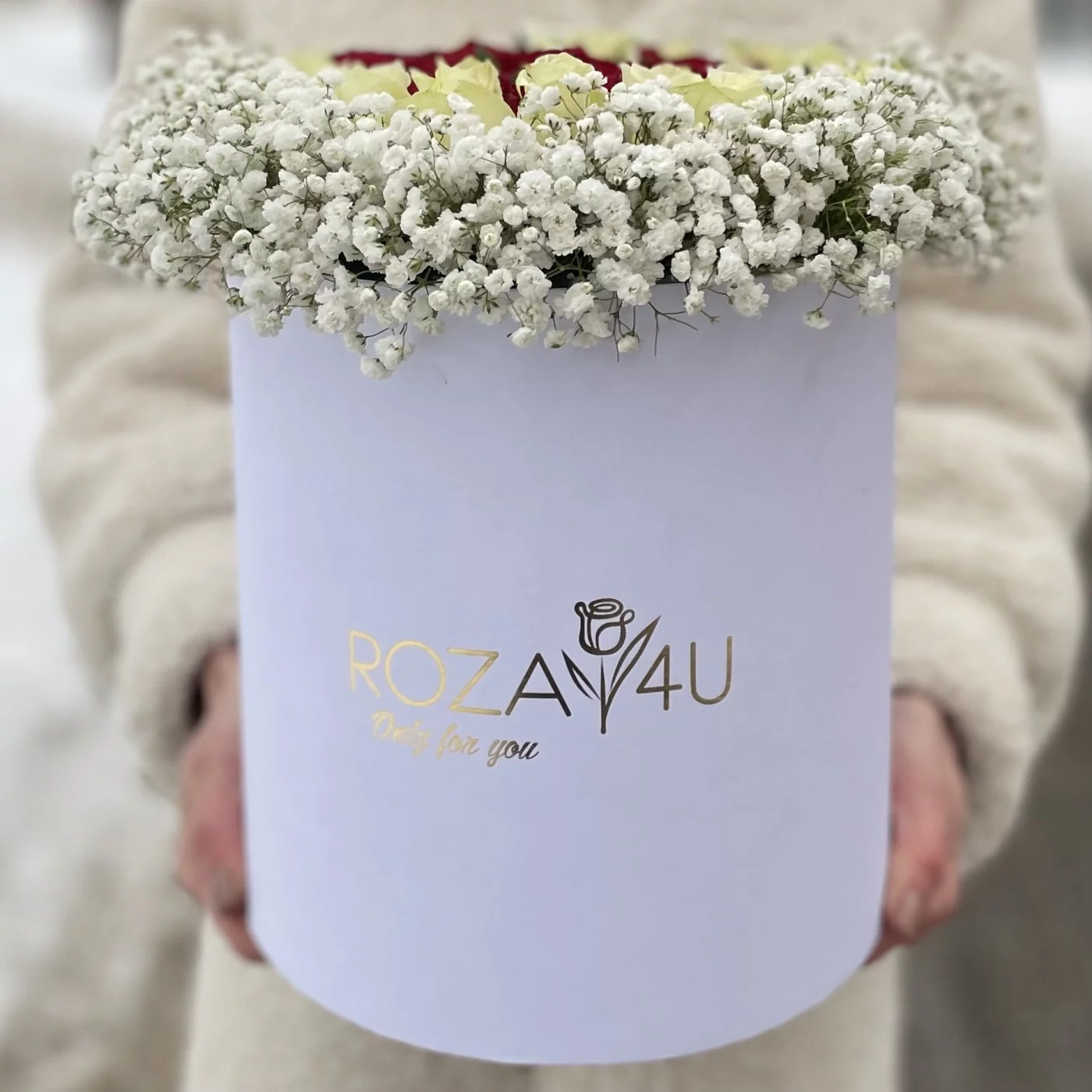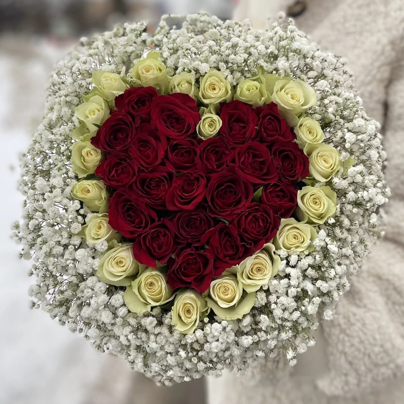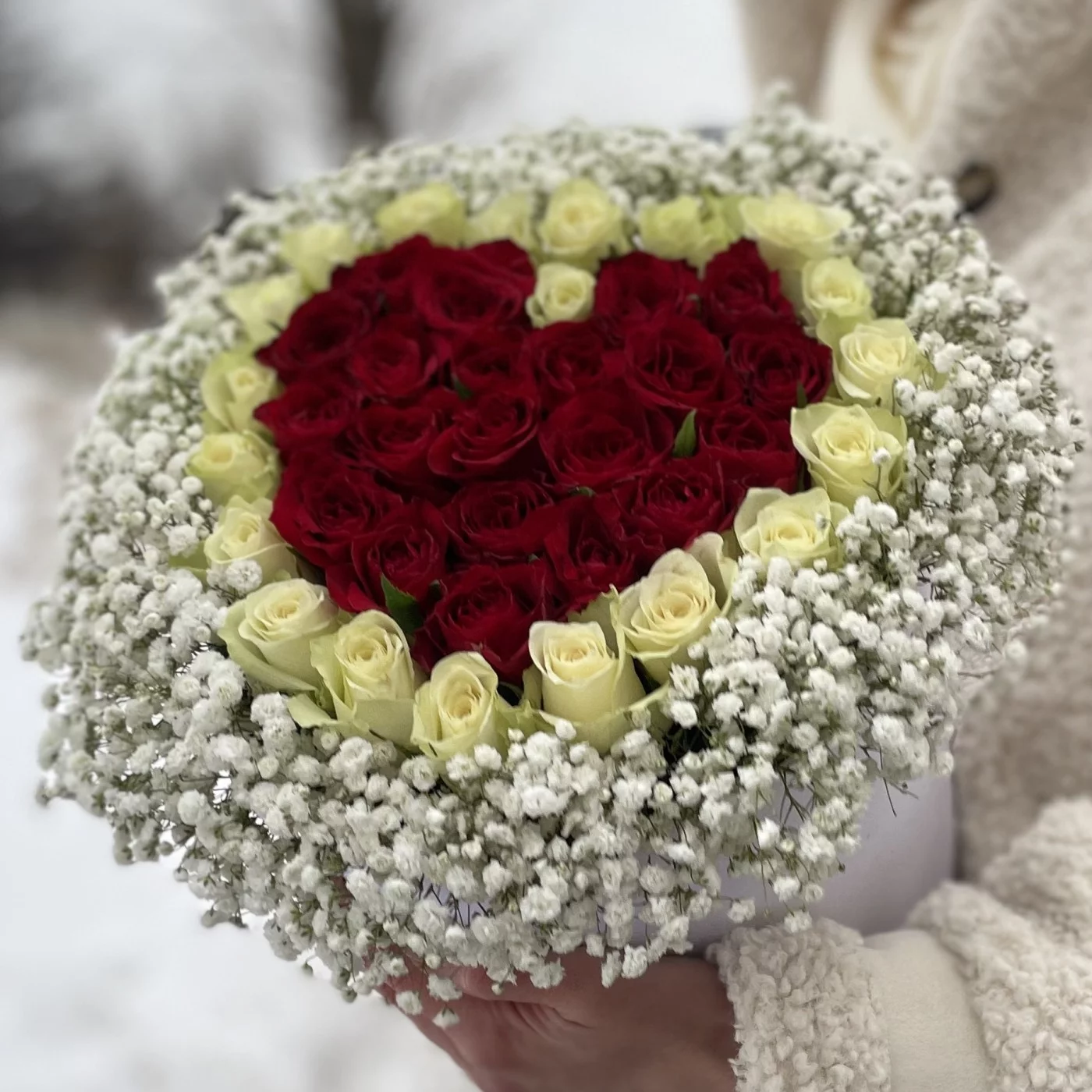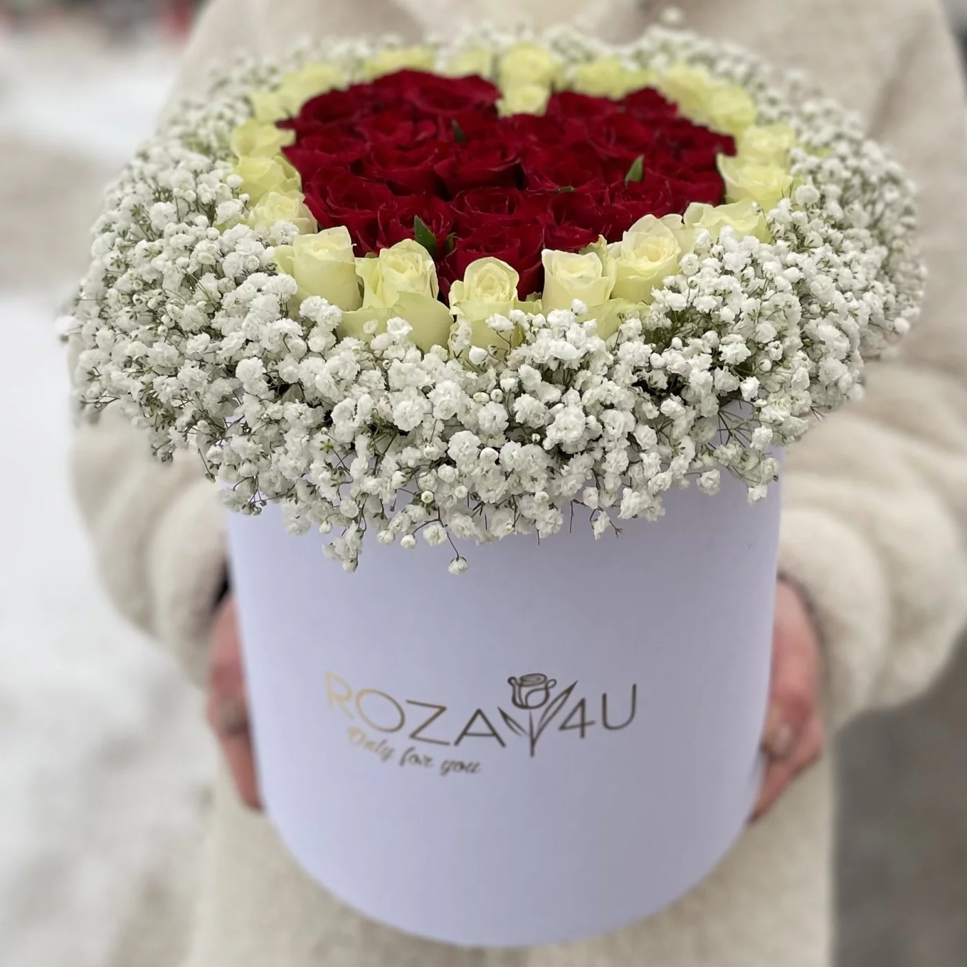 Коробка из красных и белых роз в форме сердца с гипсофилой. Прекрасный подарок для признания в любви. Очень актуально прислать своей любимой к празднику 14 февраля.