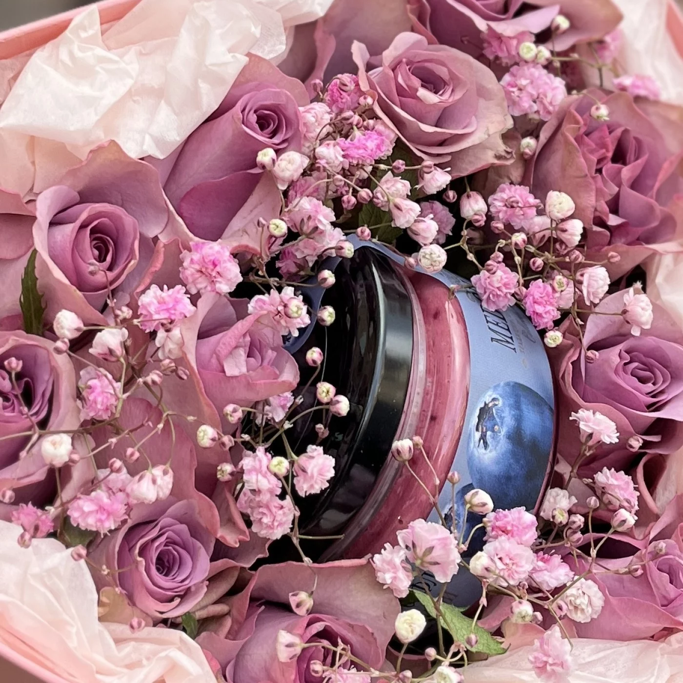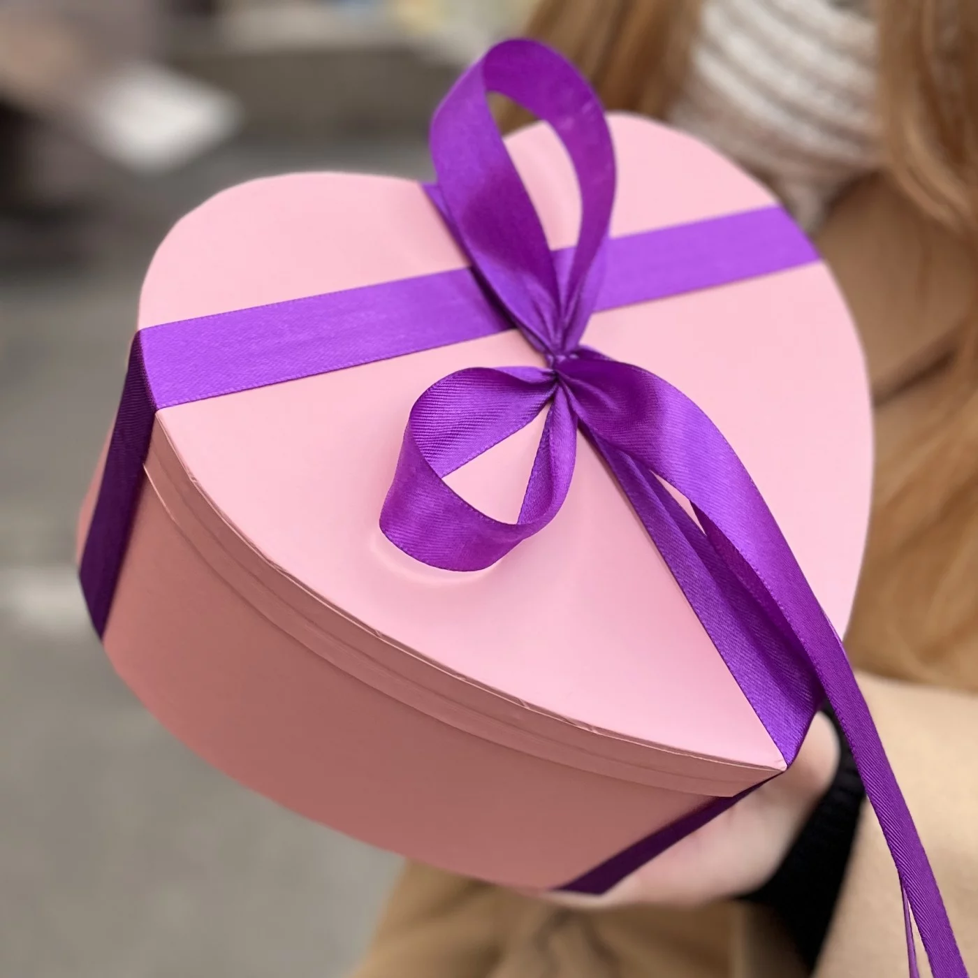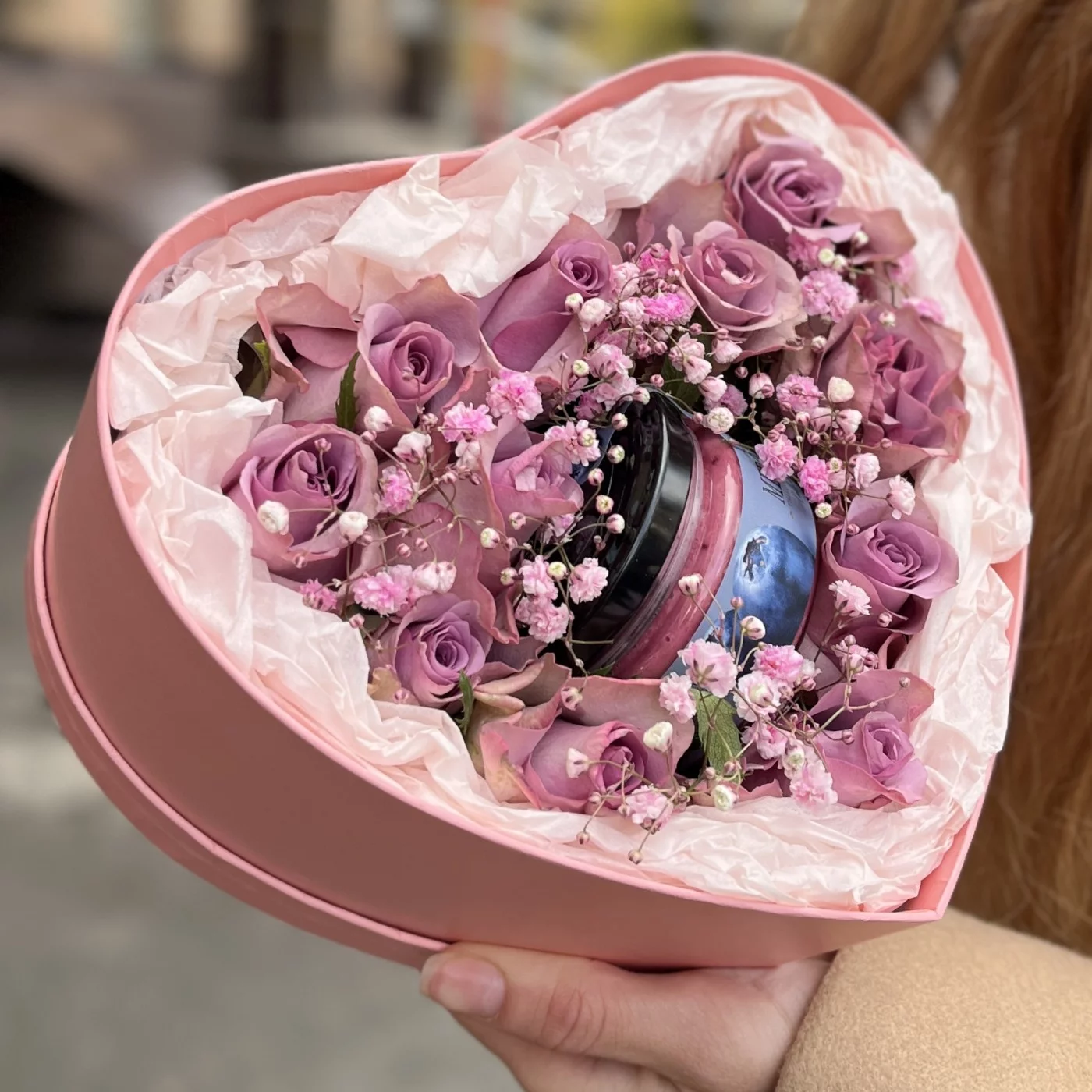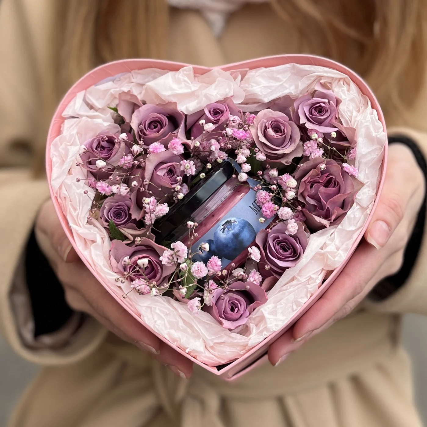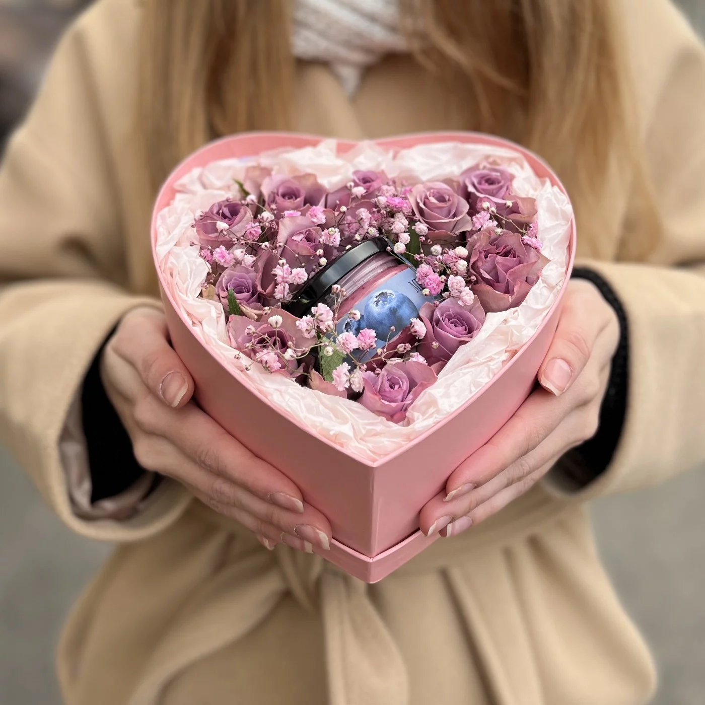 Романтичный подарок для любимой, коробка Сердце с сиреневыми розами, гипсофилой и медом.