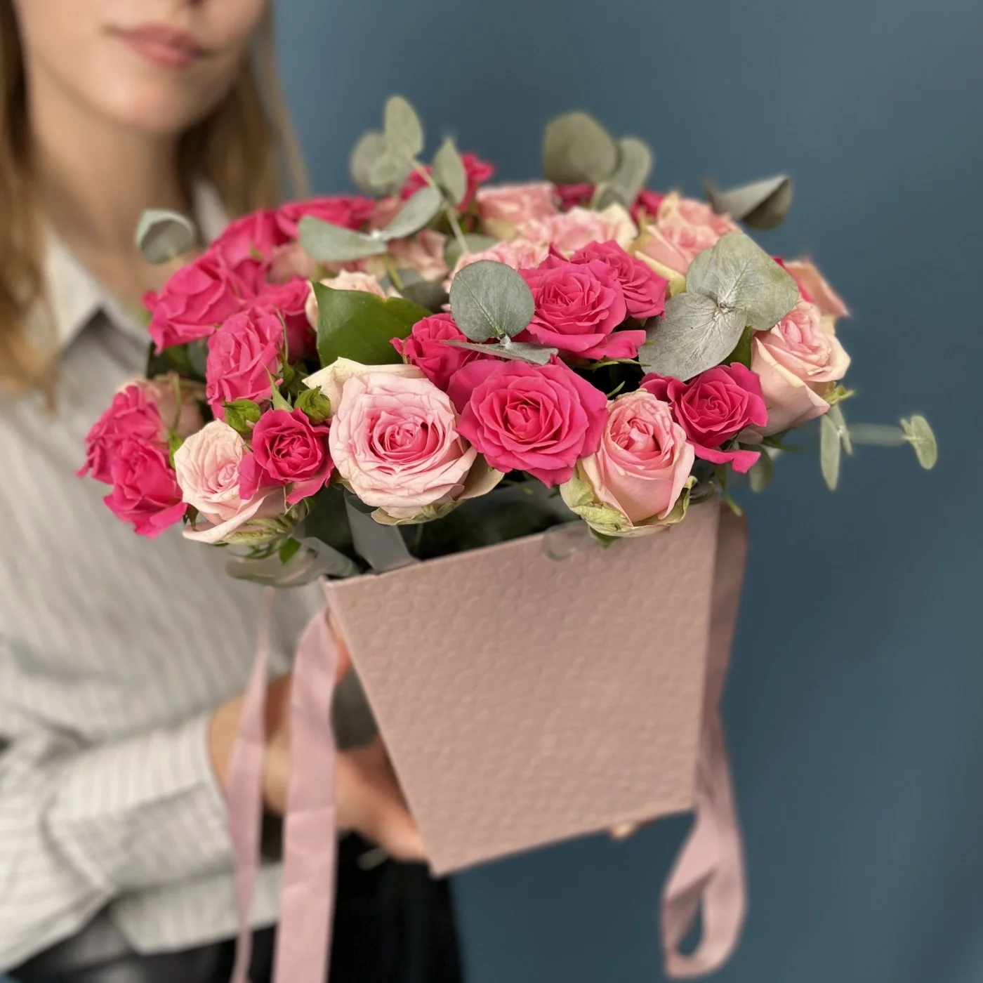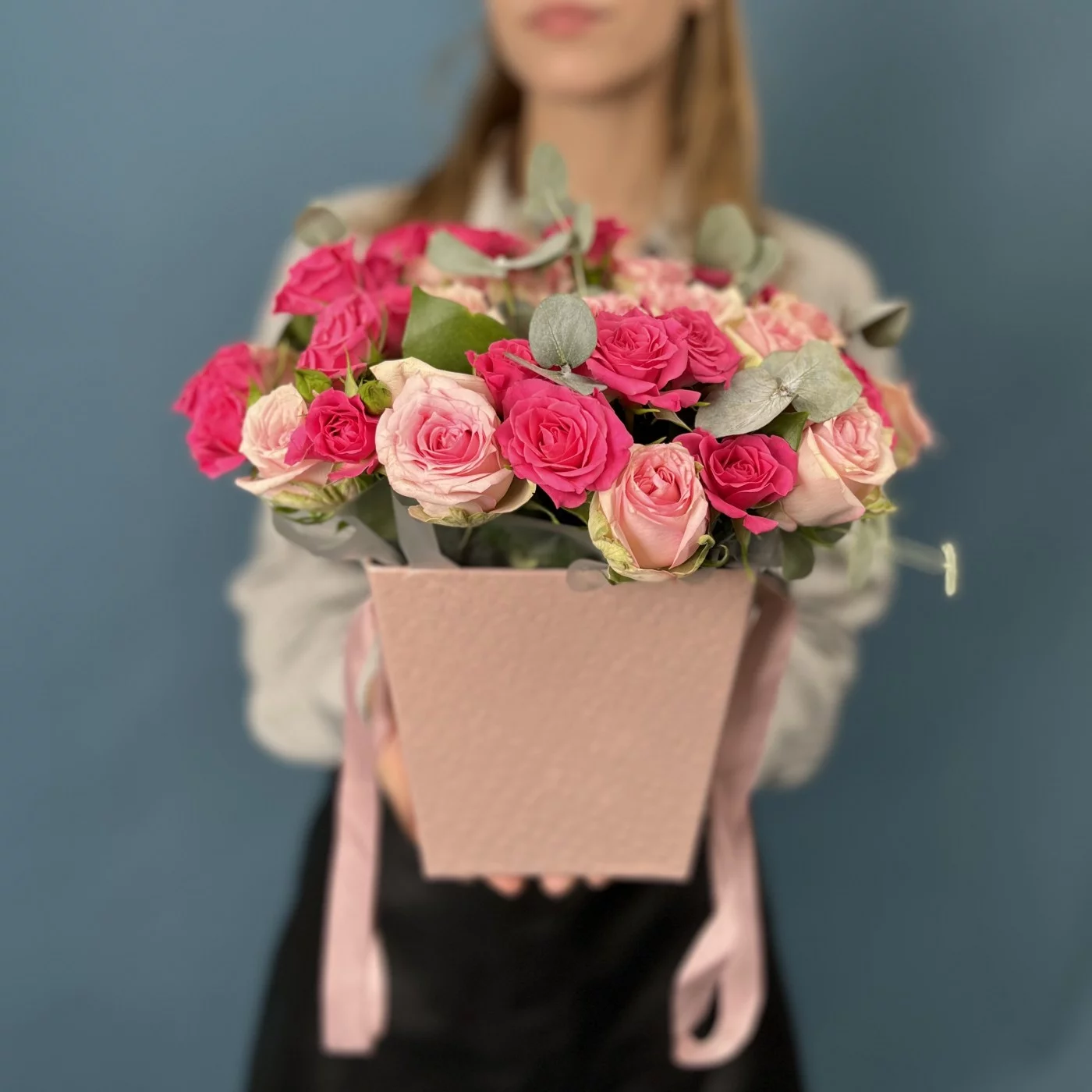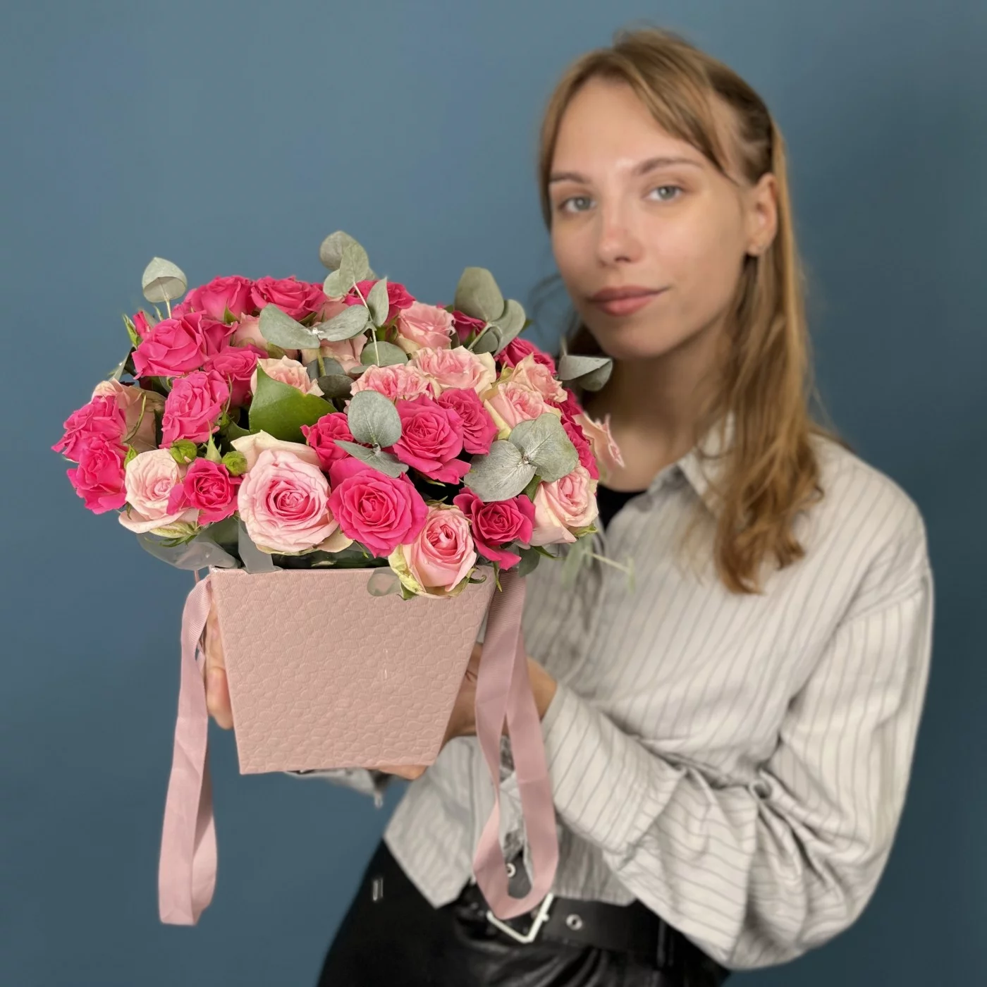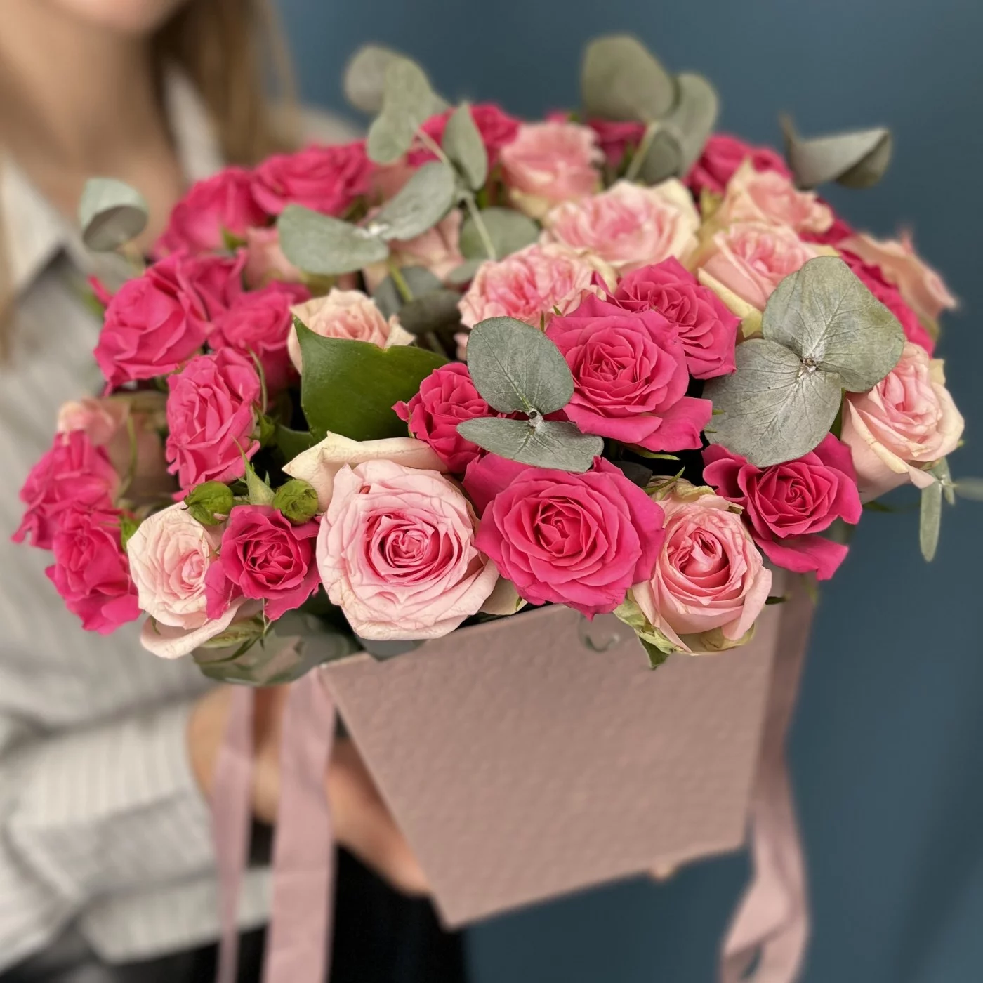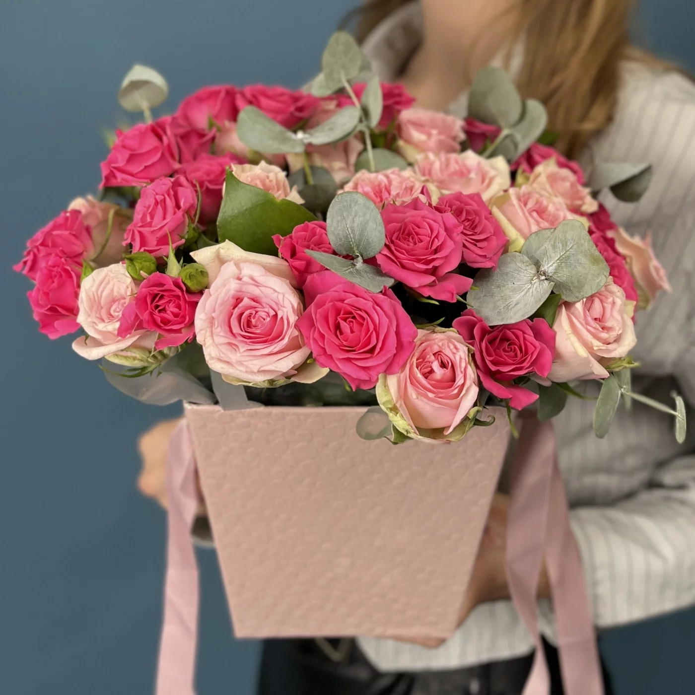 Коробка малиновых роз Глория с нежной розовой розой Судоку — это изысканный букет, объединяющий яркую насыщенность малиновых роз и оригинальный дизайн.