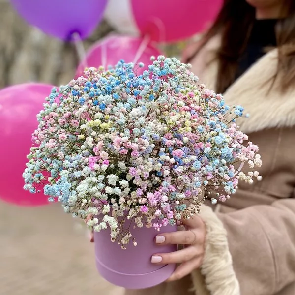 Облачко радужной гипсофилы в шляпной коробке – милый комплимент для любимой девушки, сестренки или коллеги.
