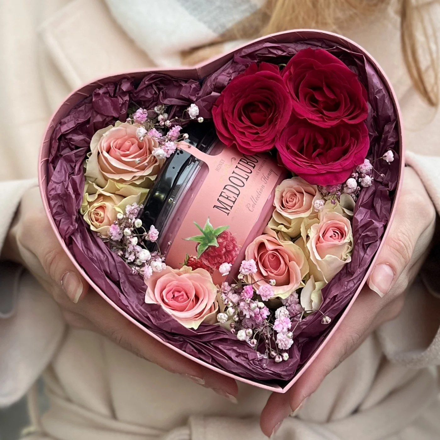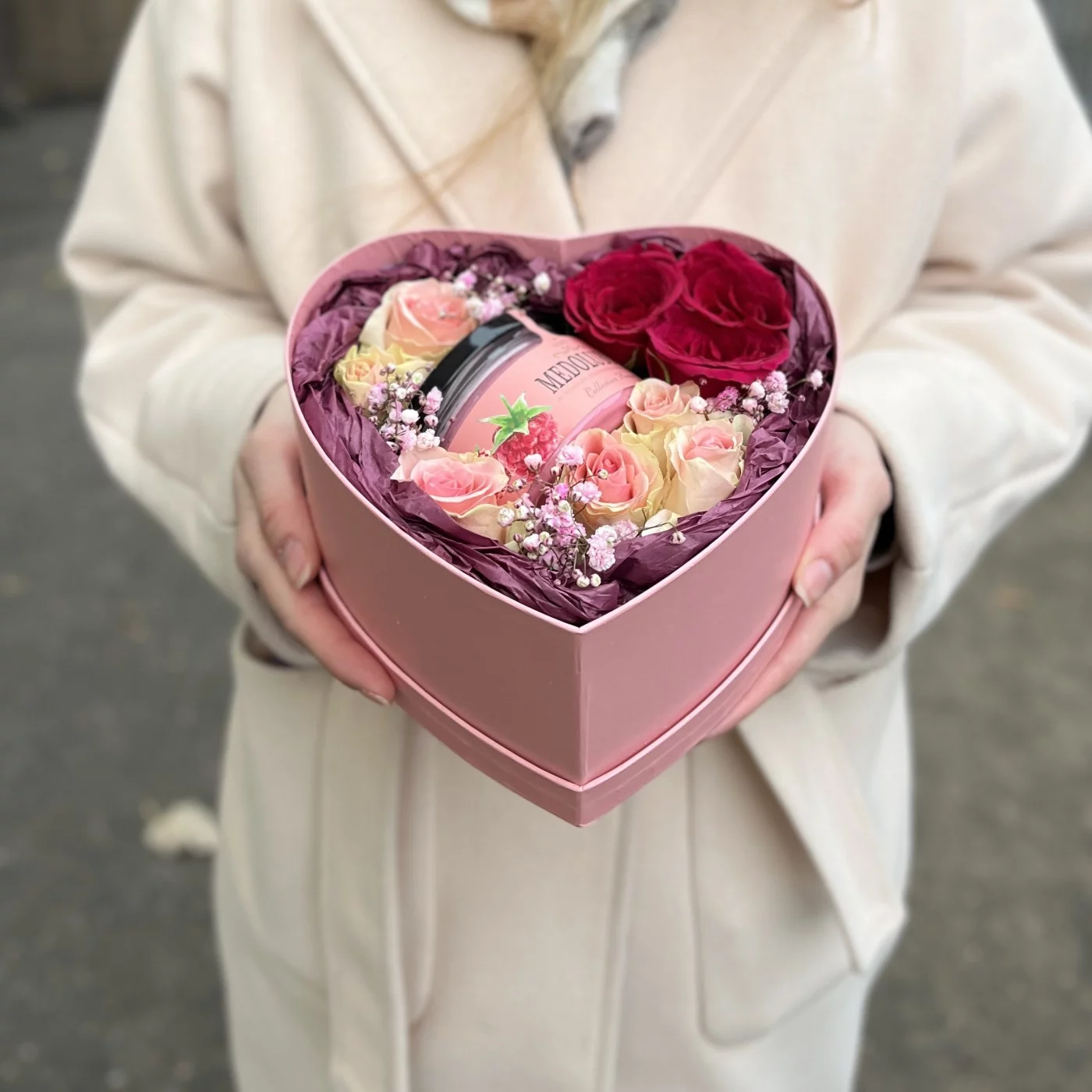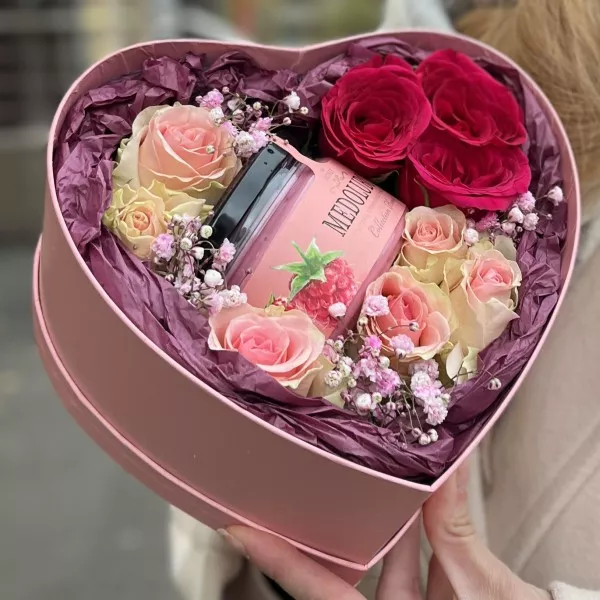 Коробка в форме сердца обеспечивает сохранность Вашего подарка и сохраняет аромат свежих цветов.
