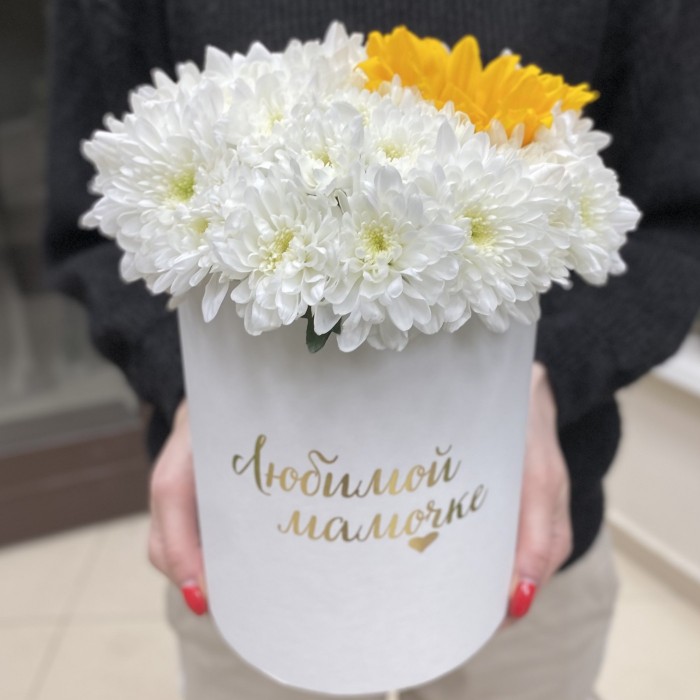 Букет из хризантем в шляпной коробке Любимой Мамочке станет оригинальным подарком в День Матери.