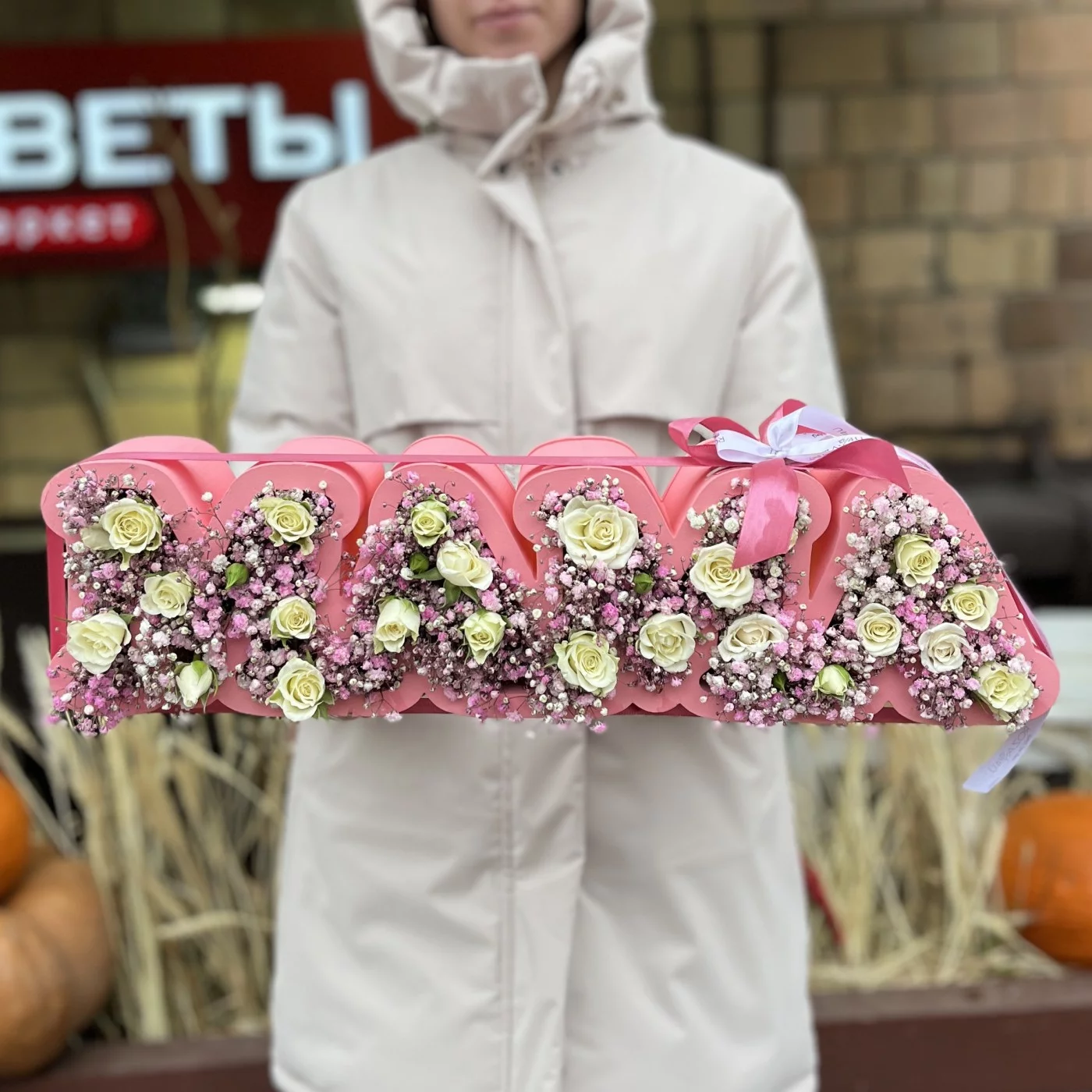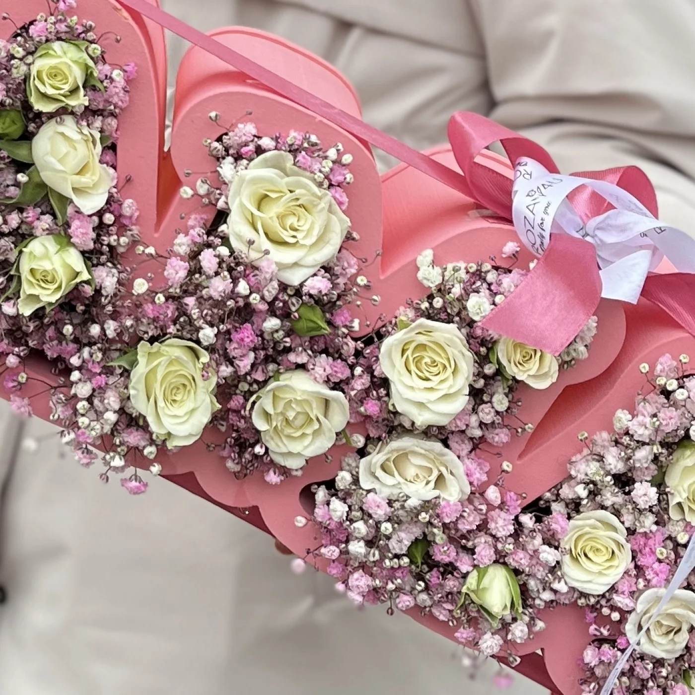 Коробка с надписью Мама розовой гипсофилой и кустовой розой