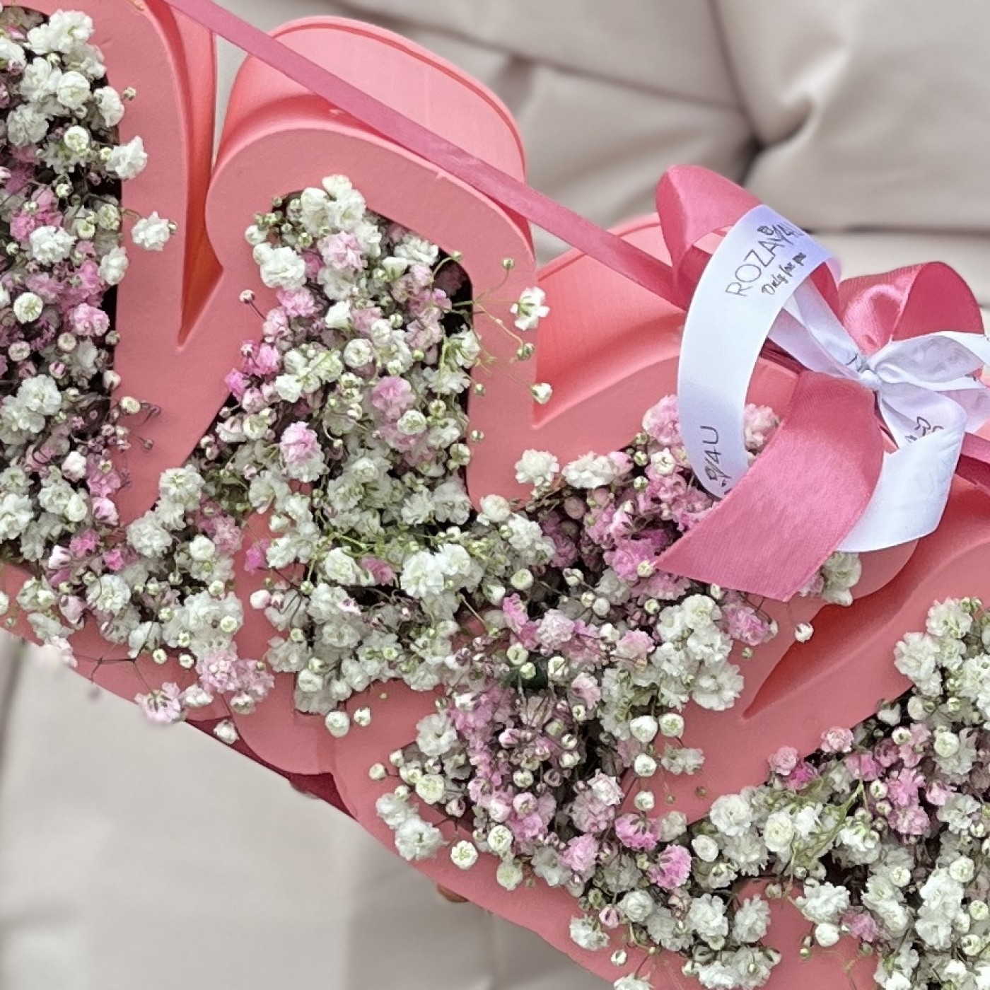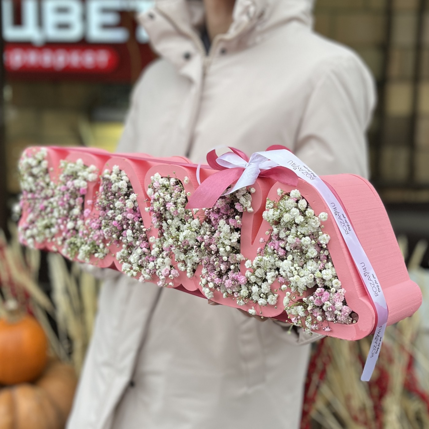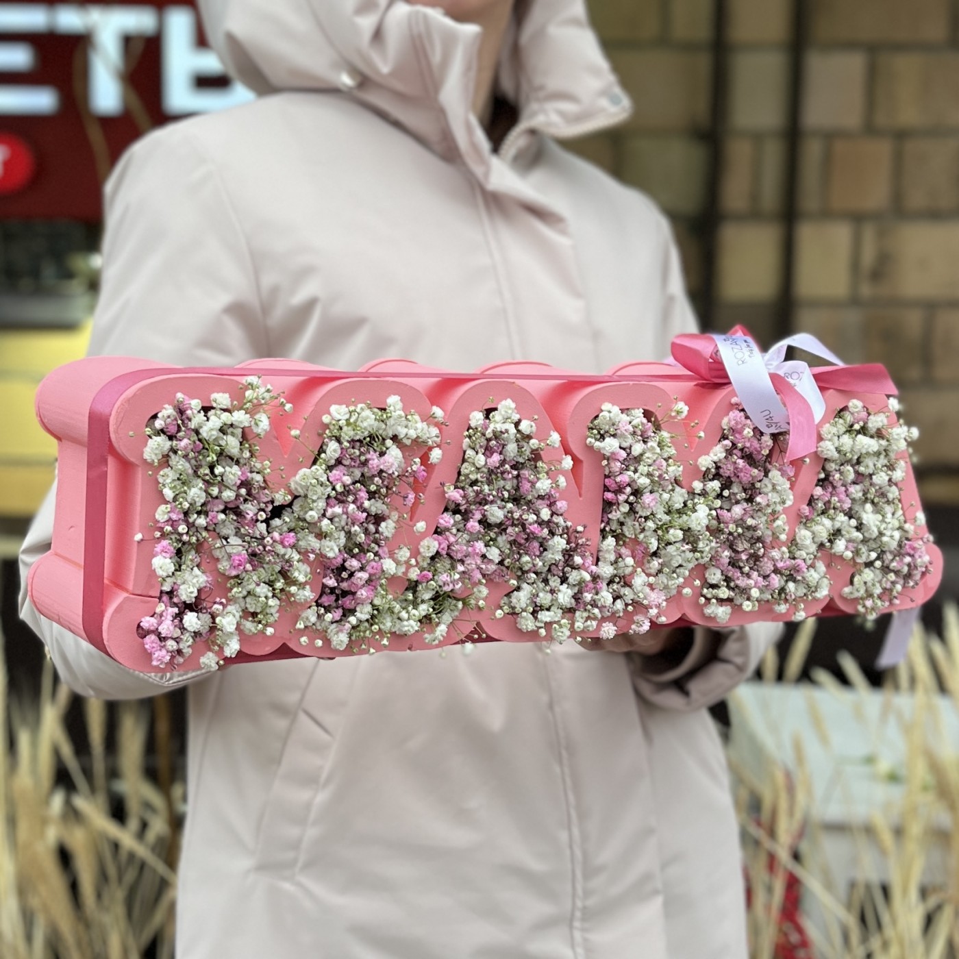 Коробка с надписью Мама и розовой и белой гипсофилой