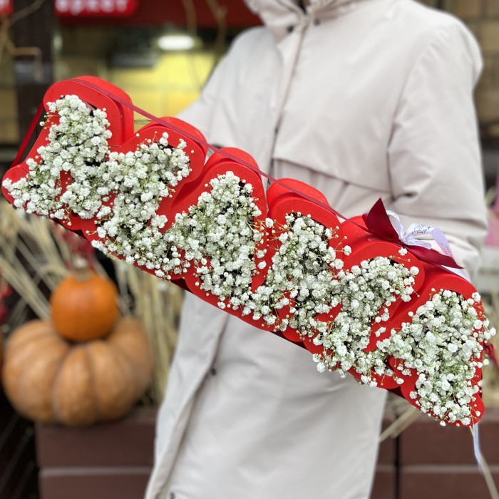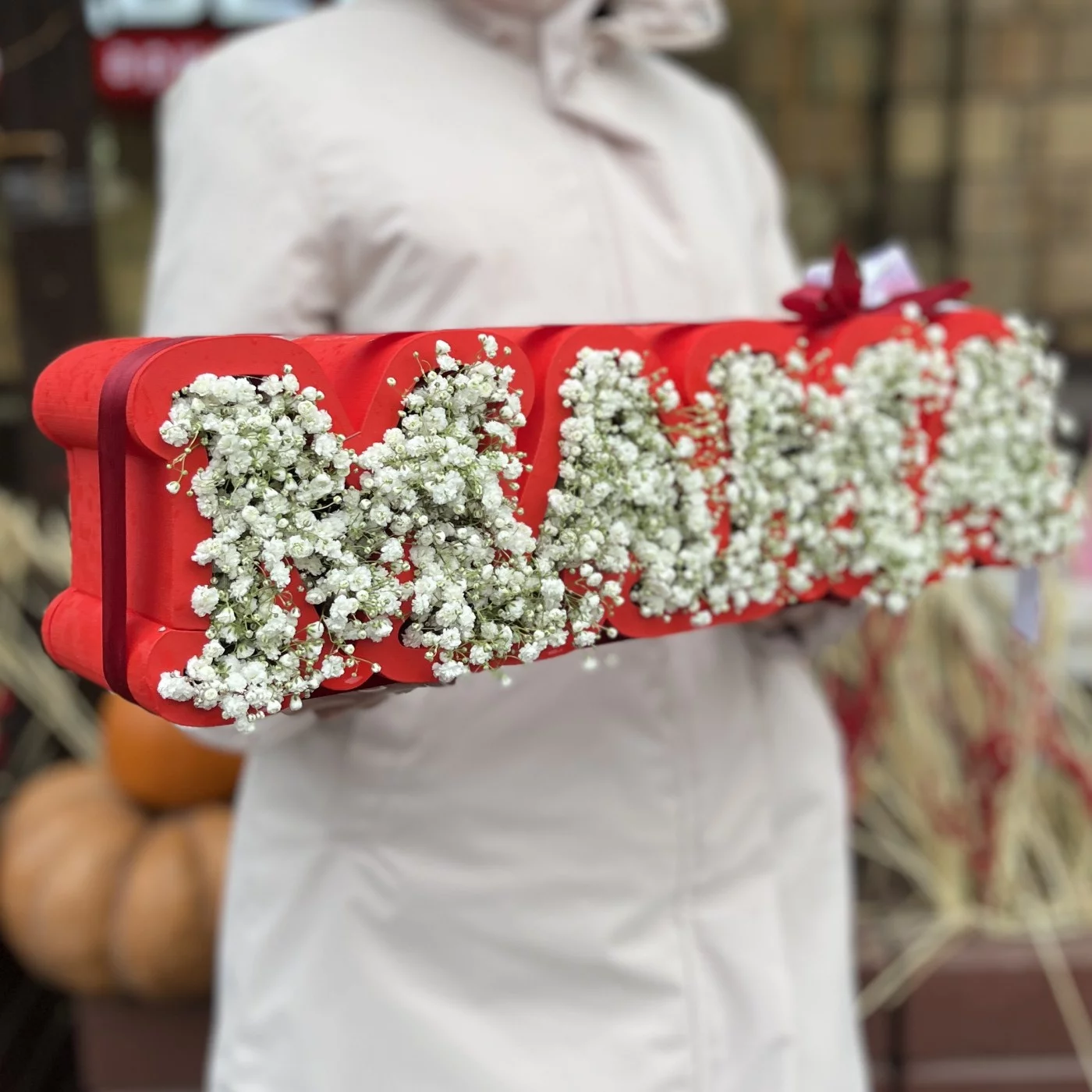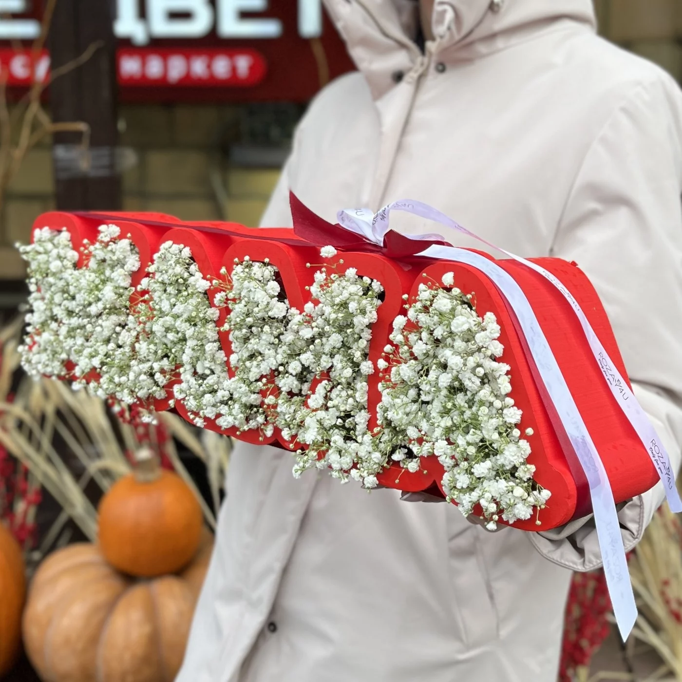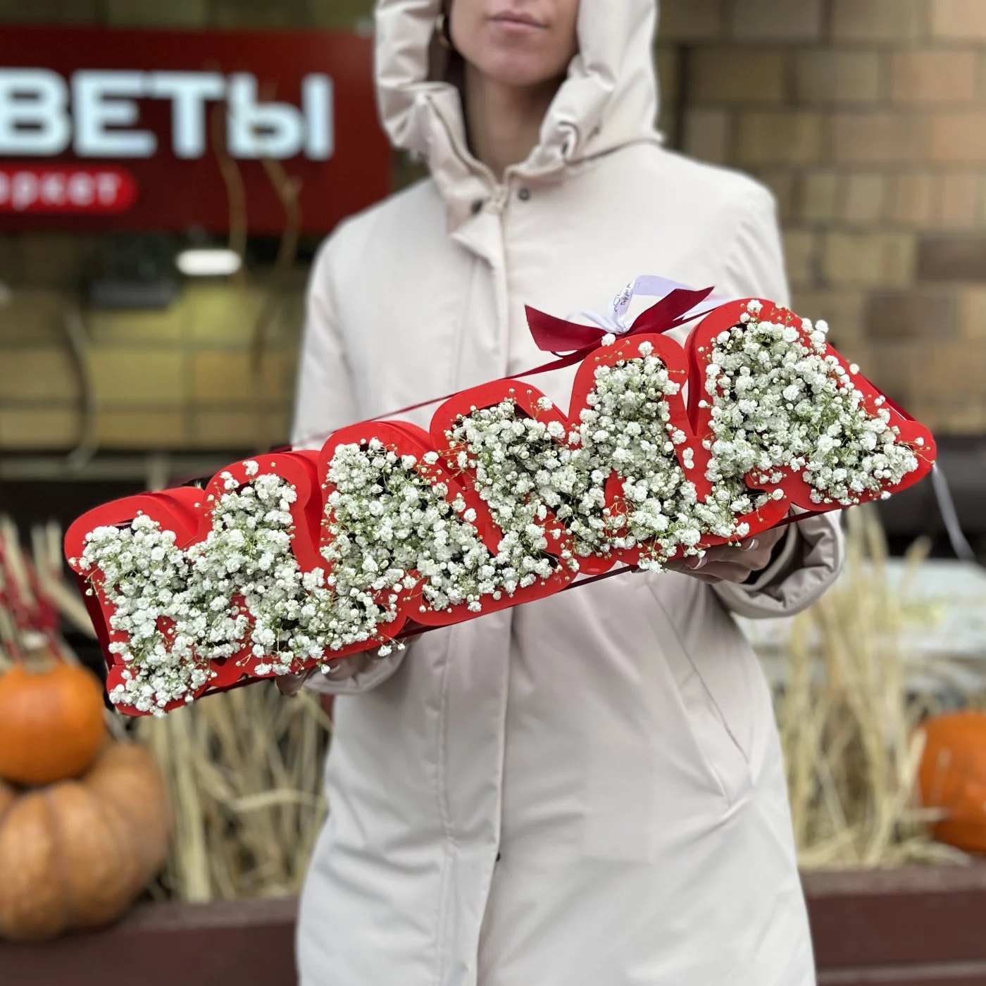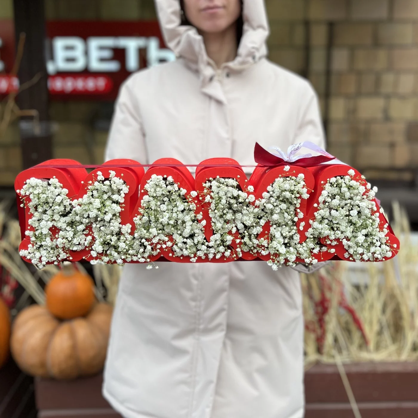 Коробка в виде надписи Мама с белыми гипсофилами, станет очень приятным подарком для вашей мамочки. Композицию актуально подарить на день матери или день рождения.