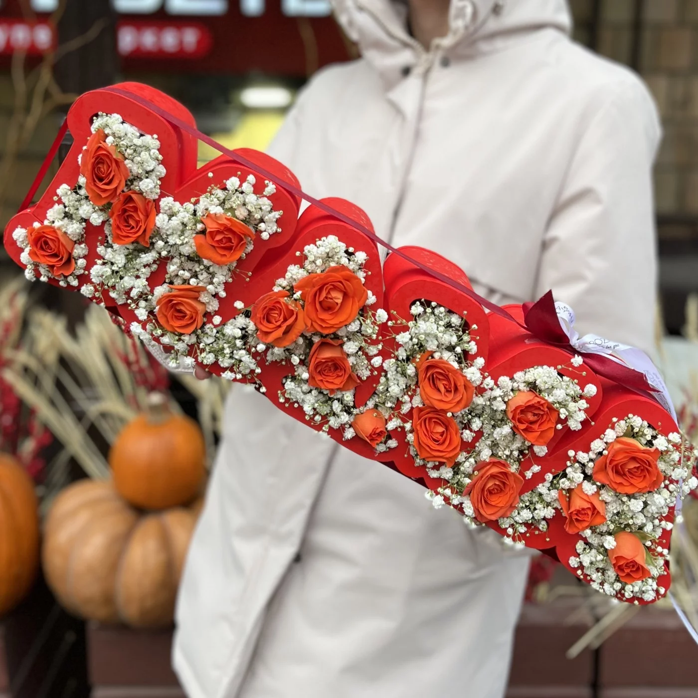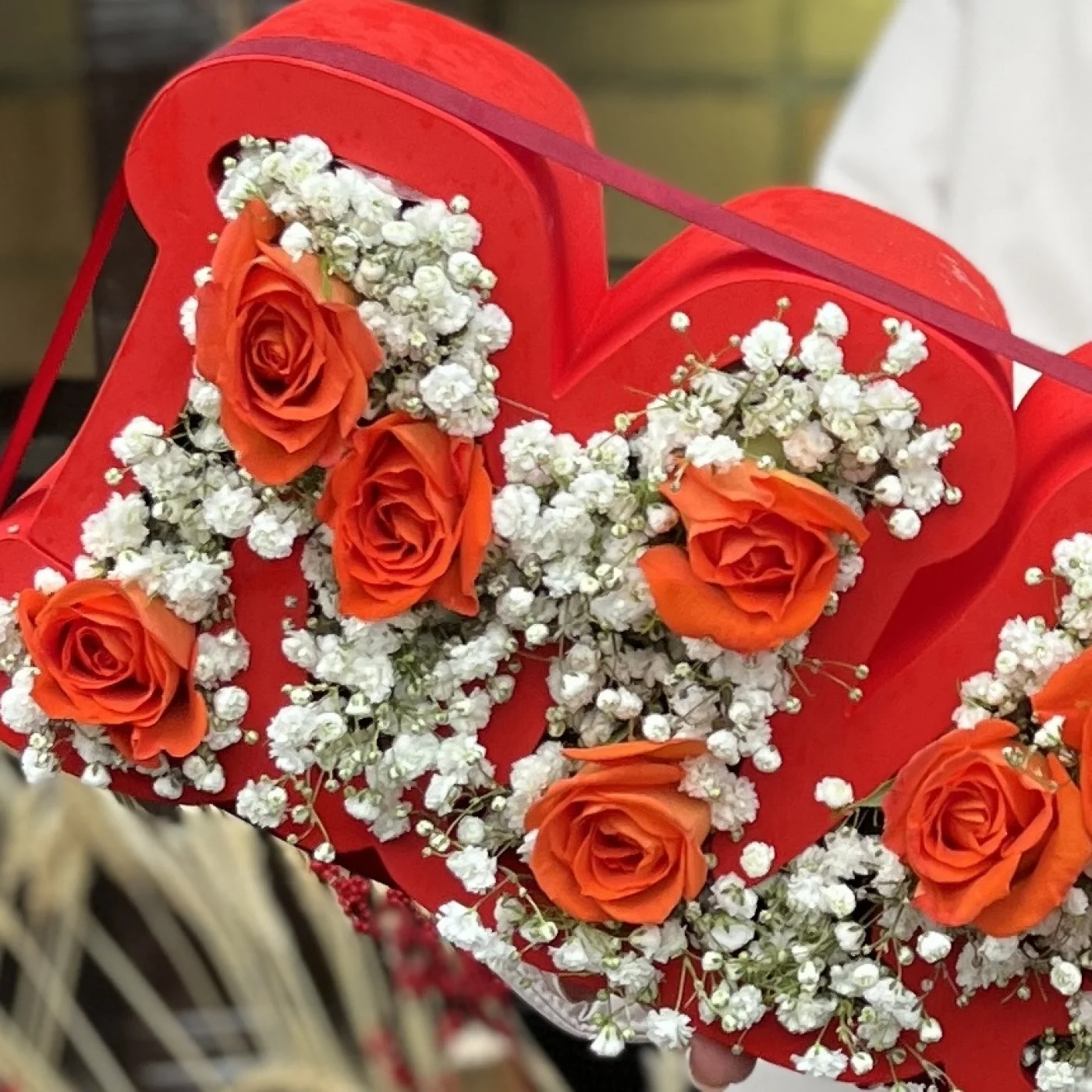 Коробка Мама с гипсофилой и оранжевыми кустовыми розами