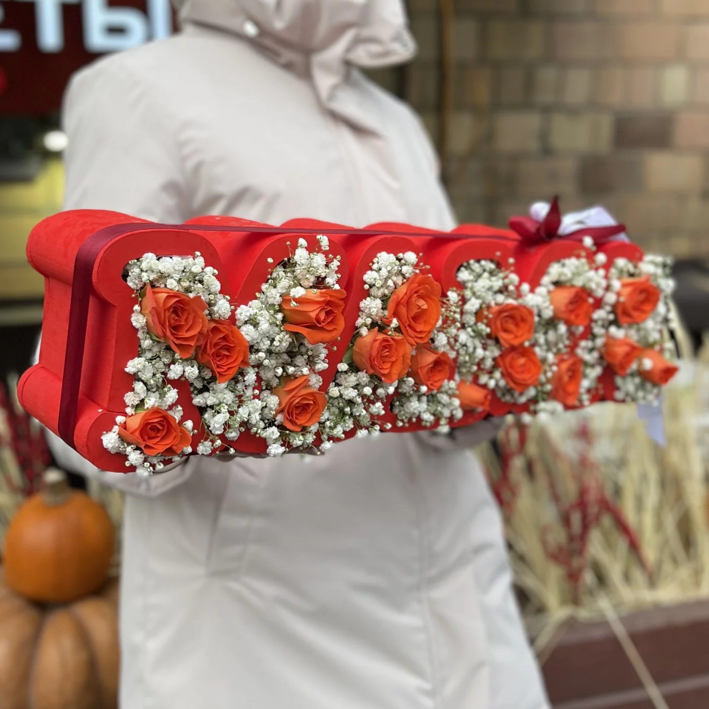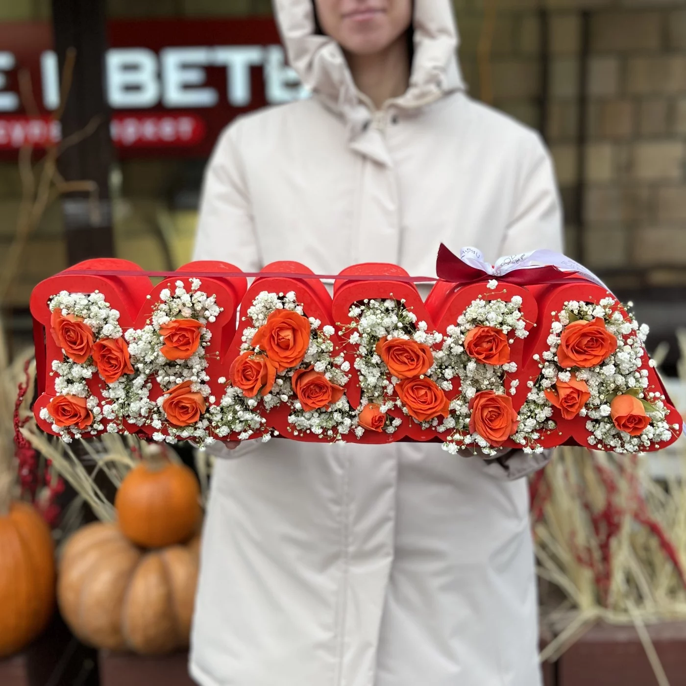 Коробка с надписью Мама с гипсофилой и оранжевыми кустовыми розами, станет очень приятным подарком для вашей мамочки. Композицию актуально подарить на день матери или день рождения.