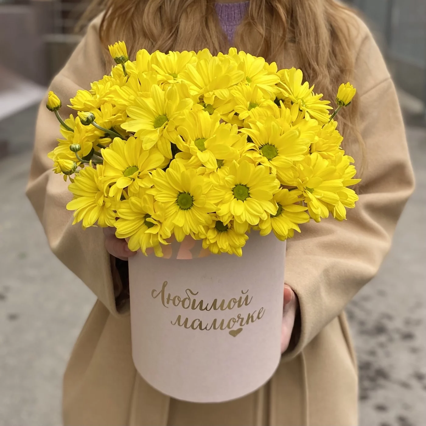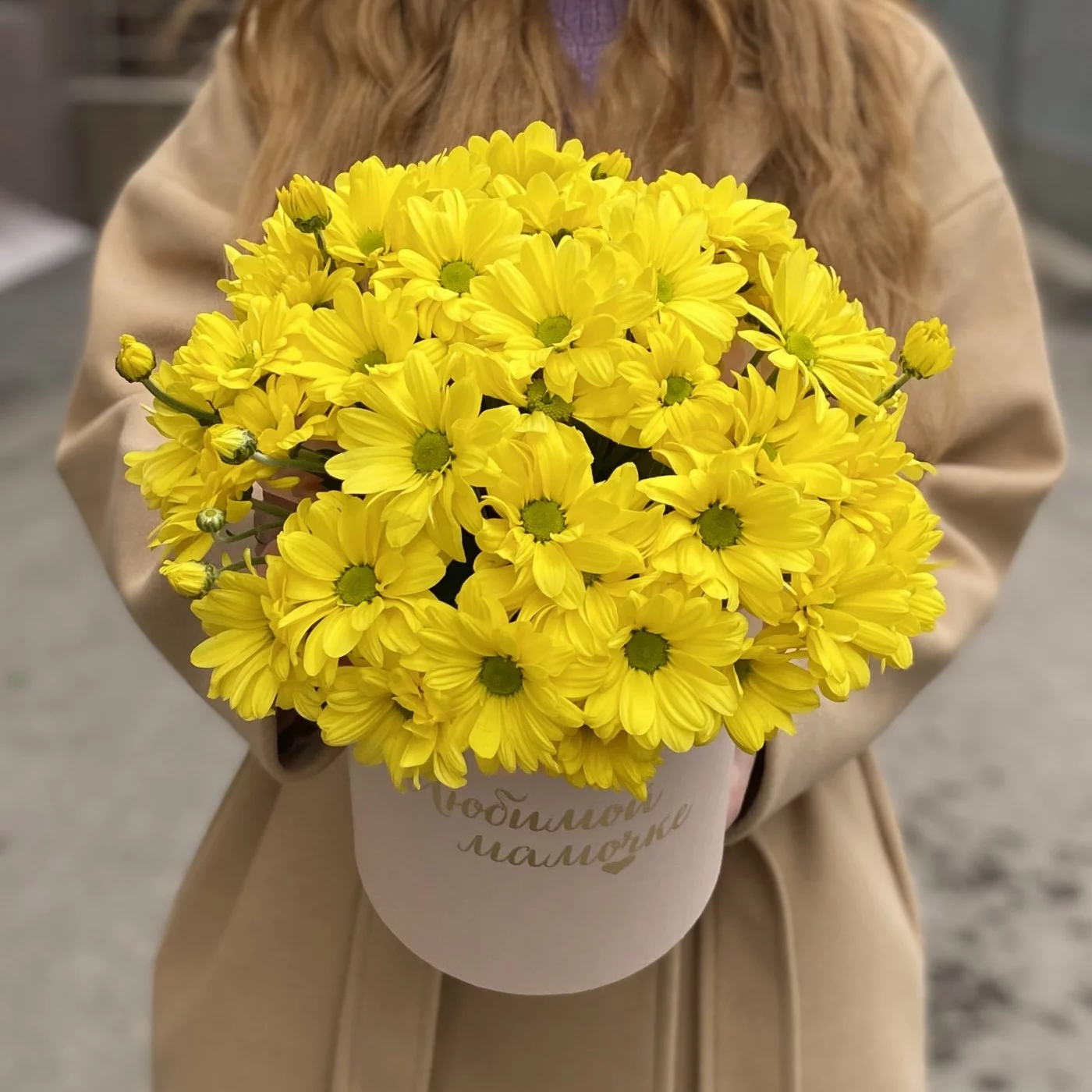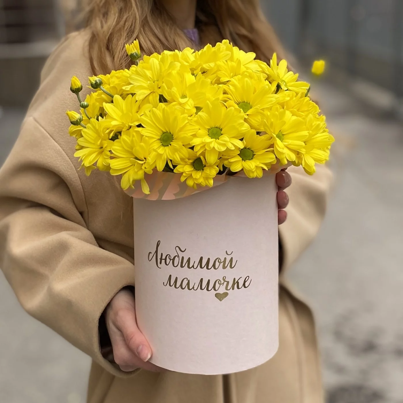 Желтые хризантемы в шляпной коробке Любимой Мамочке станет оригинальным подарком в День Матери.