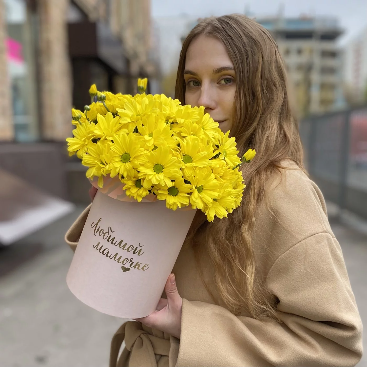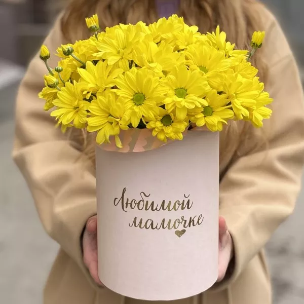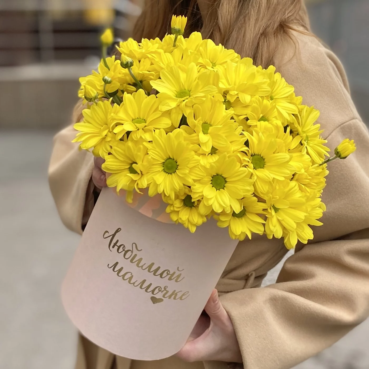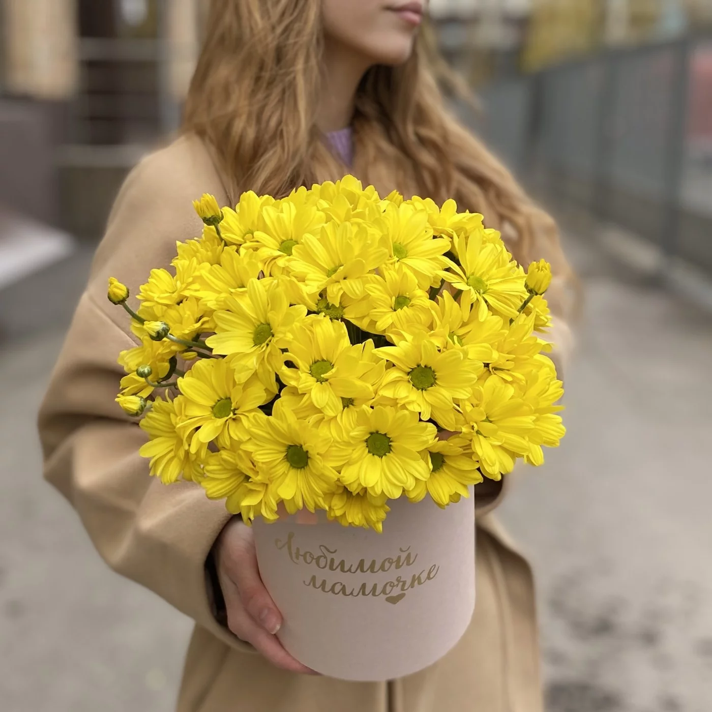Желтые хризантемы в шляпной коробке Любимой Мамочке станет оригинальным подарком в День Матери.
