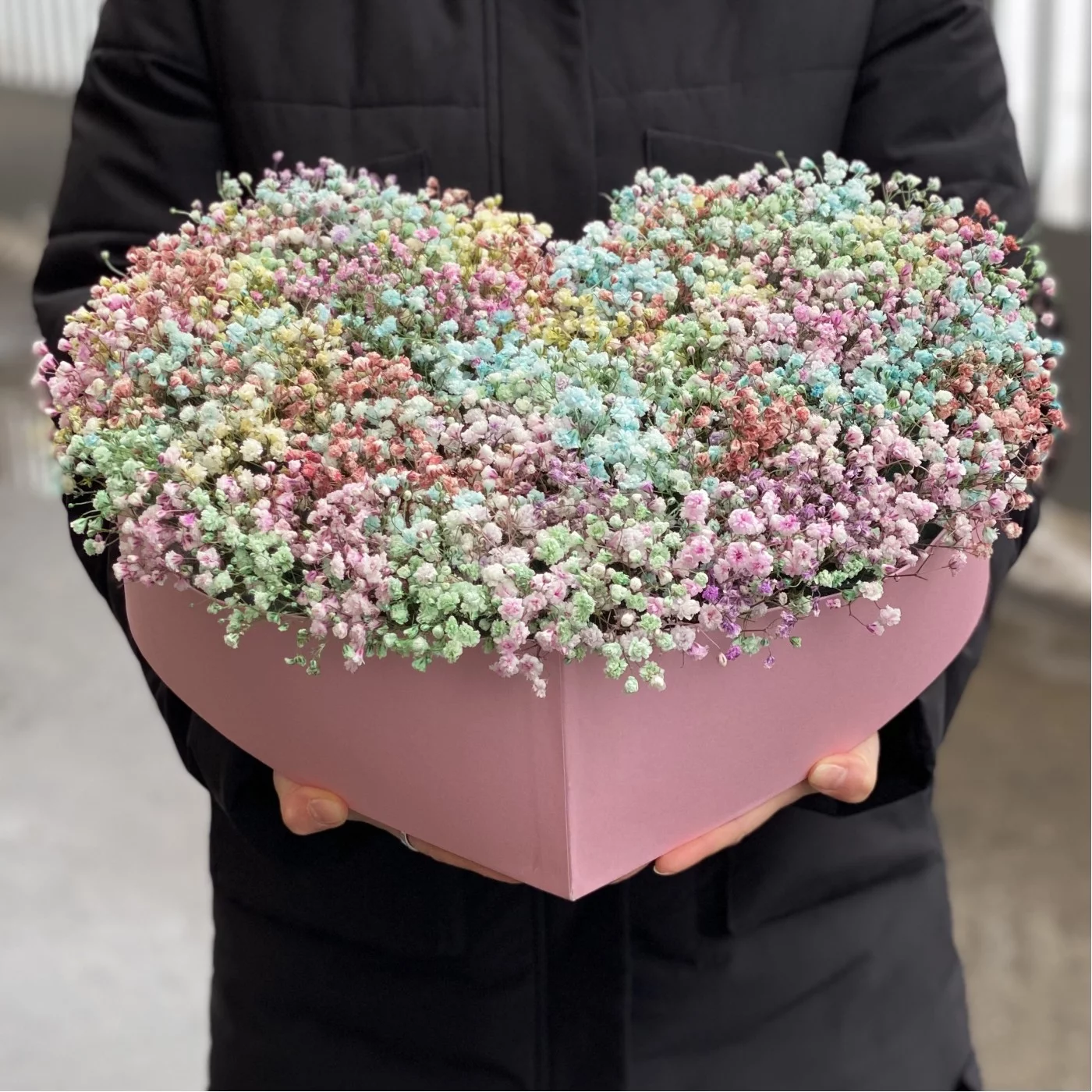 Облако из радужной гипсофилы в коробке в форме сердца. Прекрасный подарок для любимой.