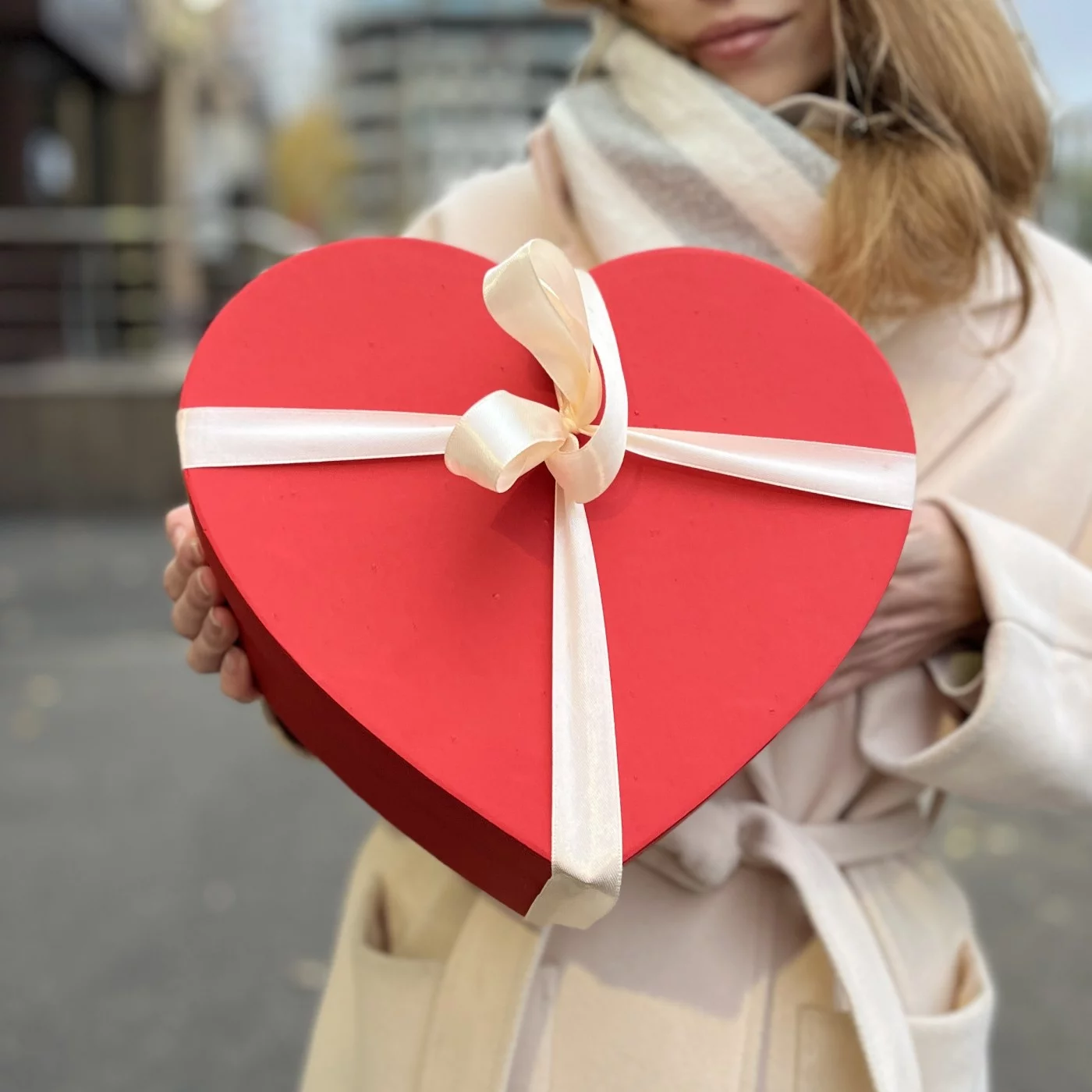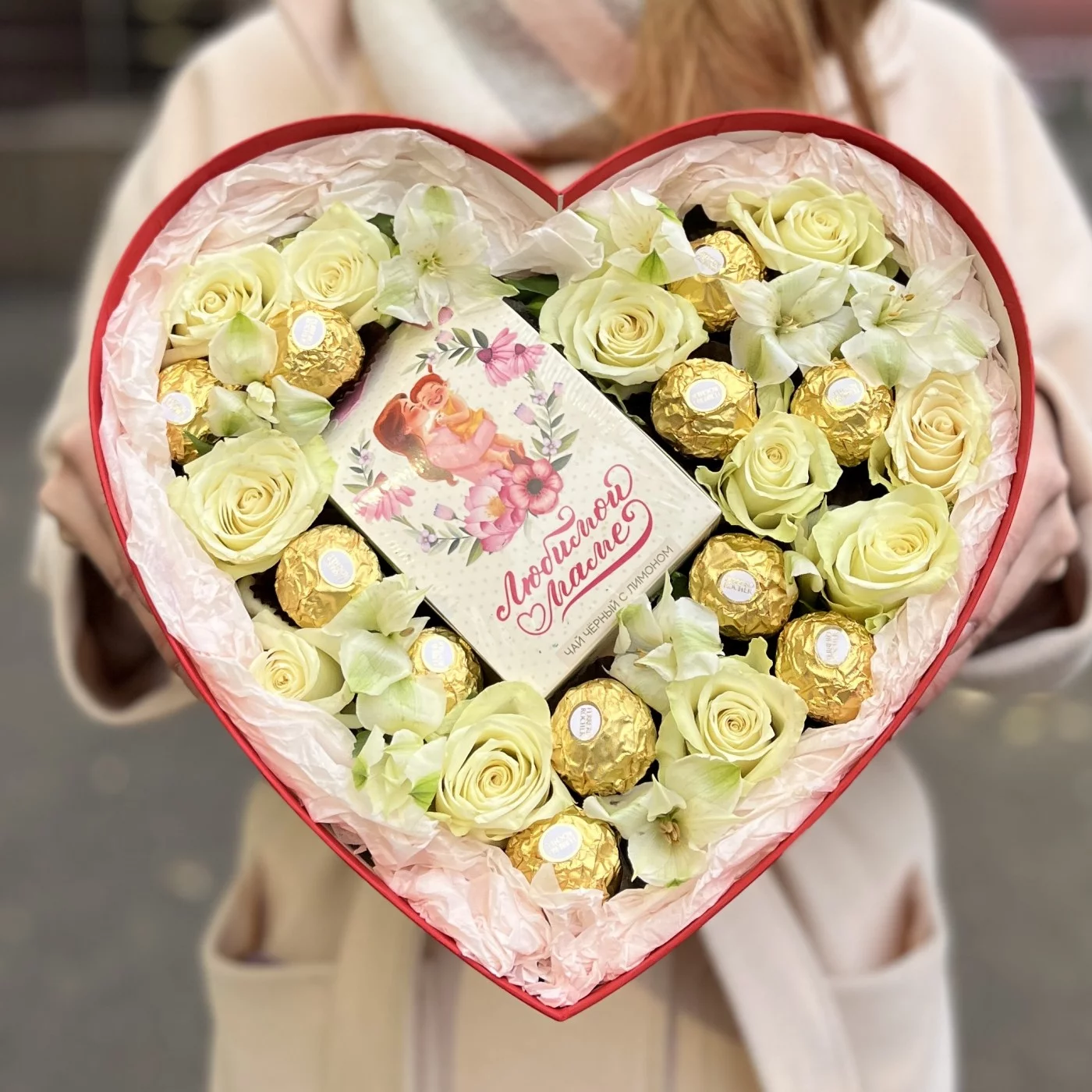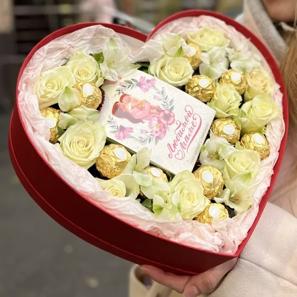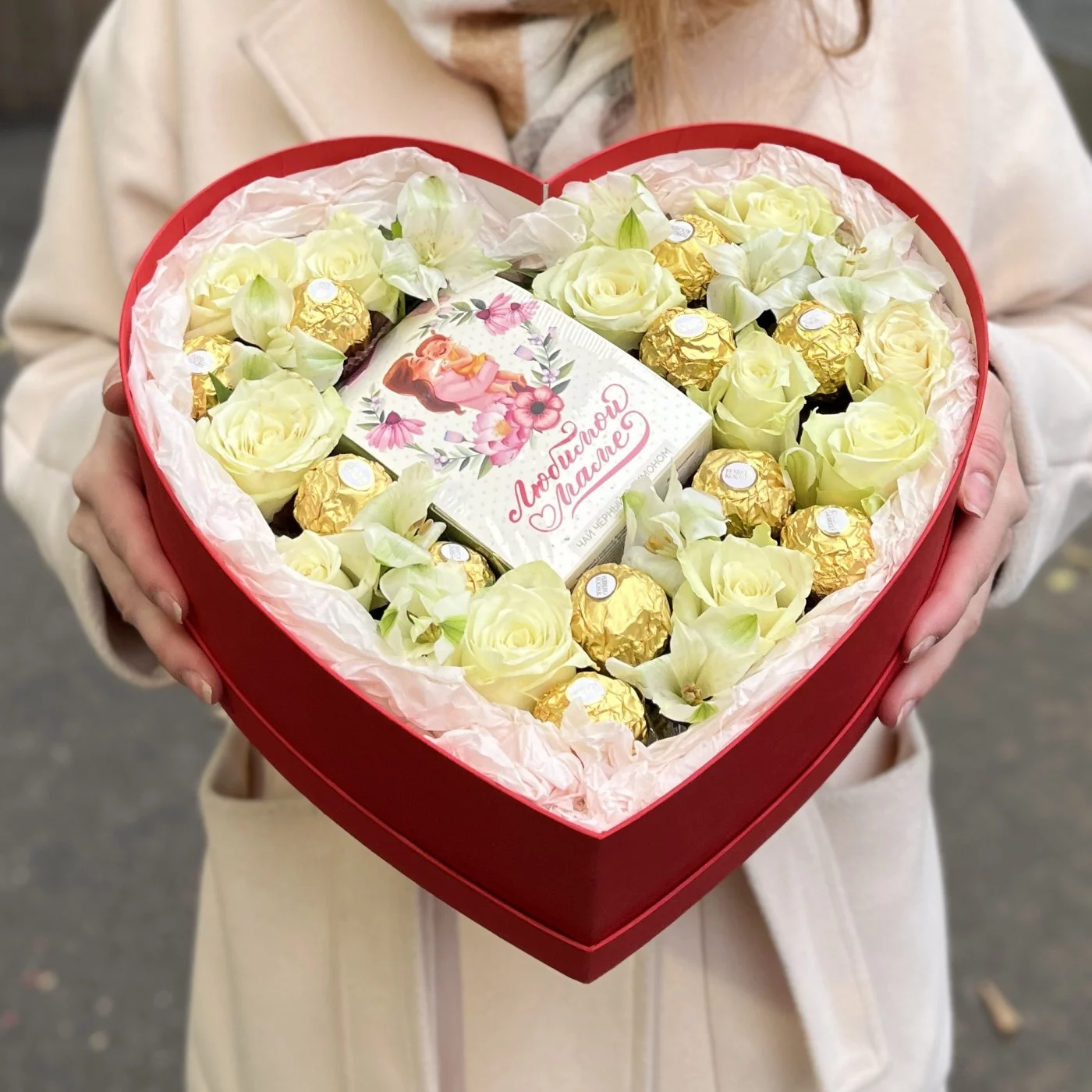 Коробка в форме сердца обеспечивает сохранность Вашего подарка и сохраняет аромат свежих цветов.