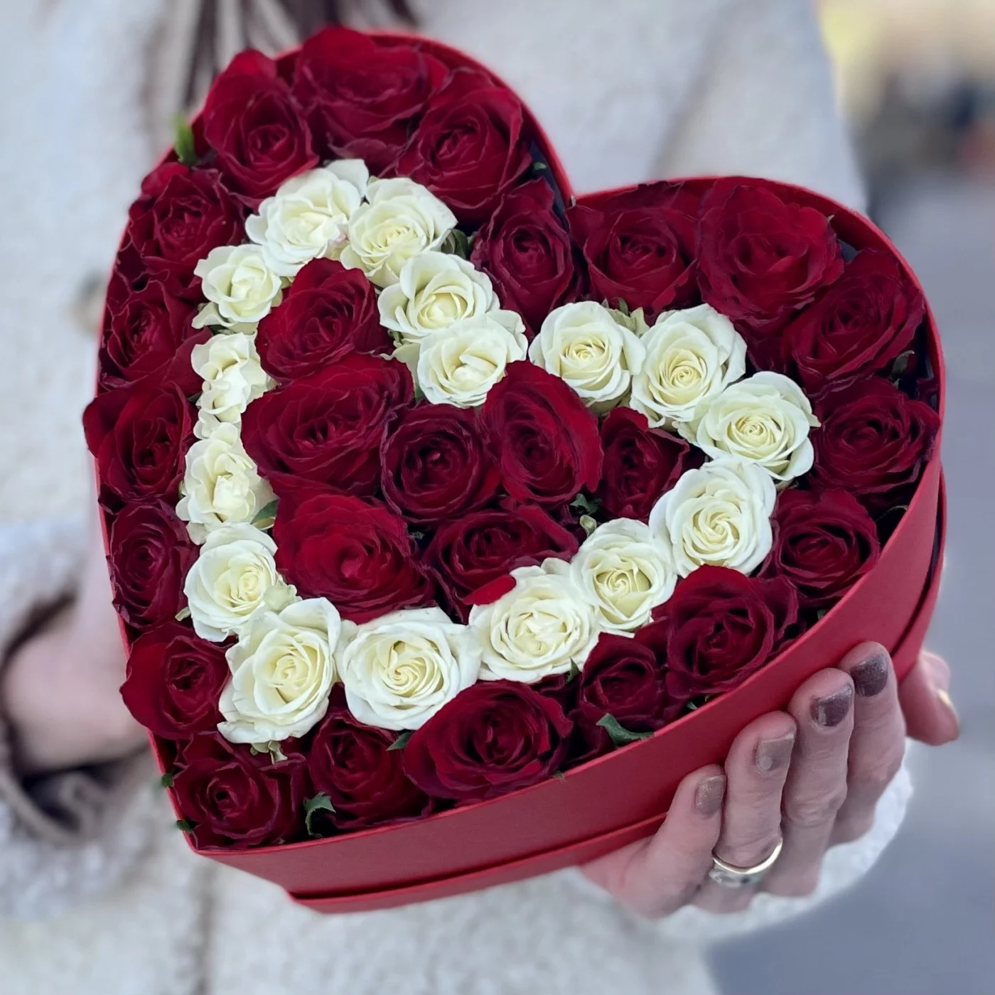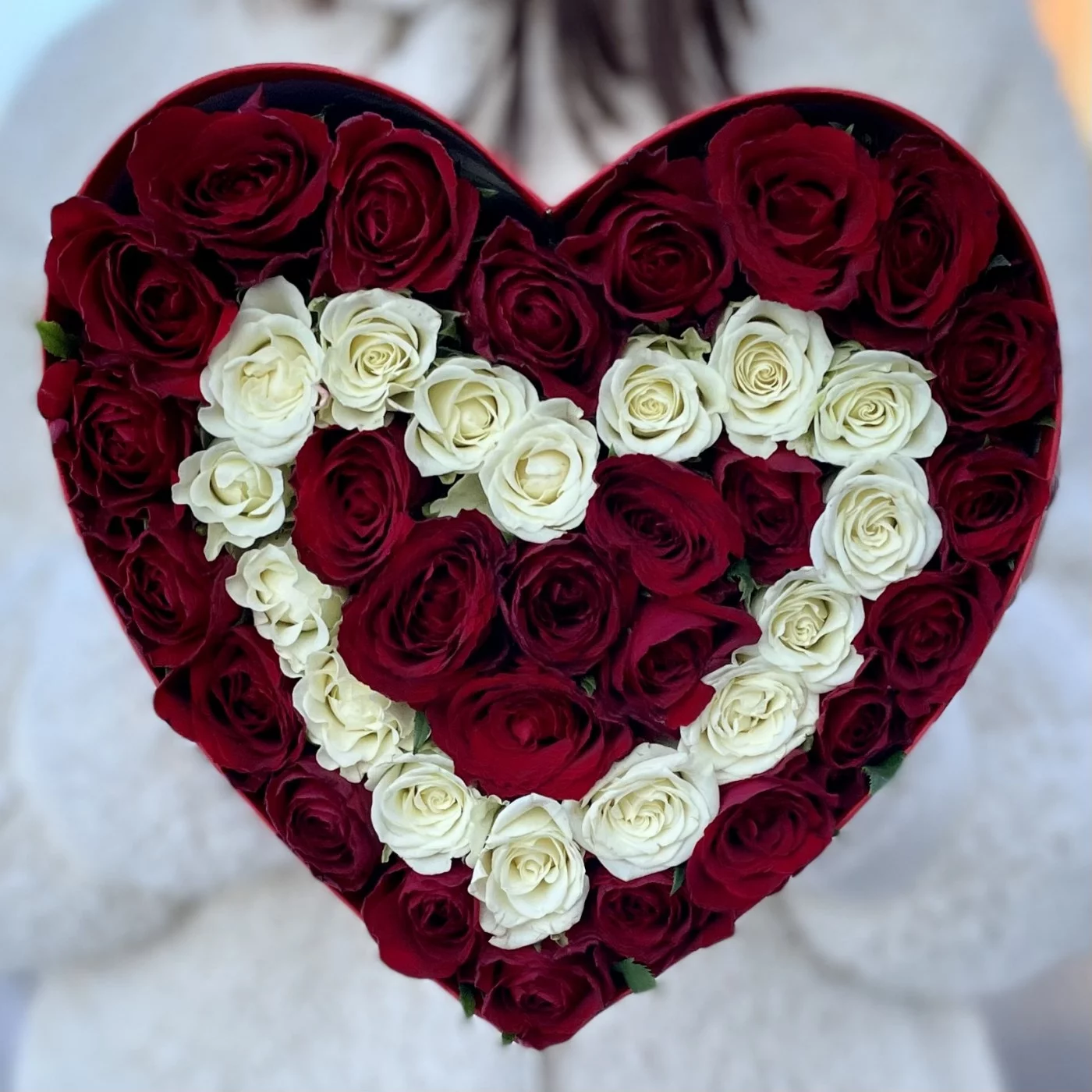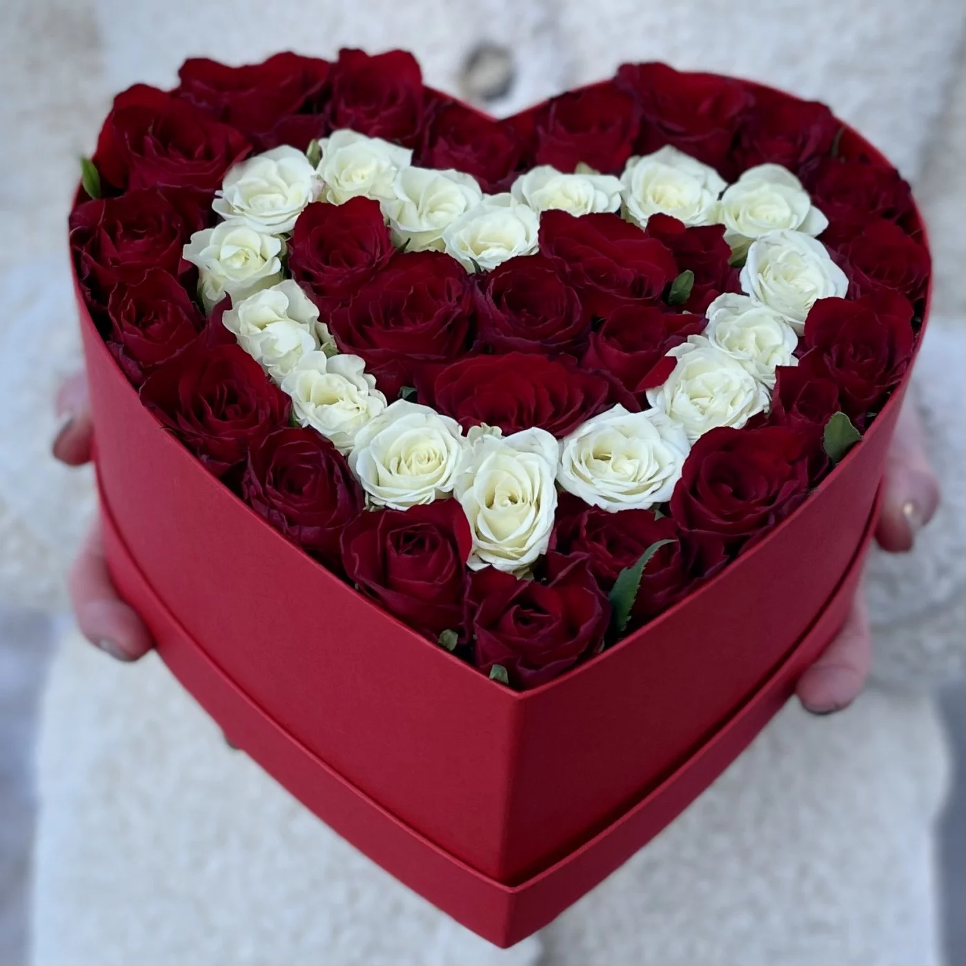 Коробка Сердце с красными и белыми кустовыми розами
