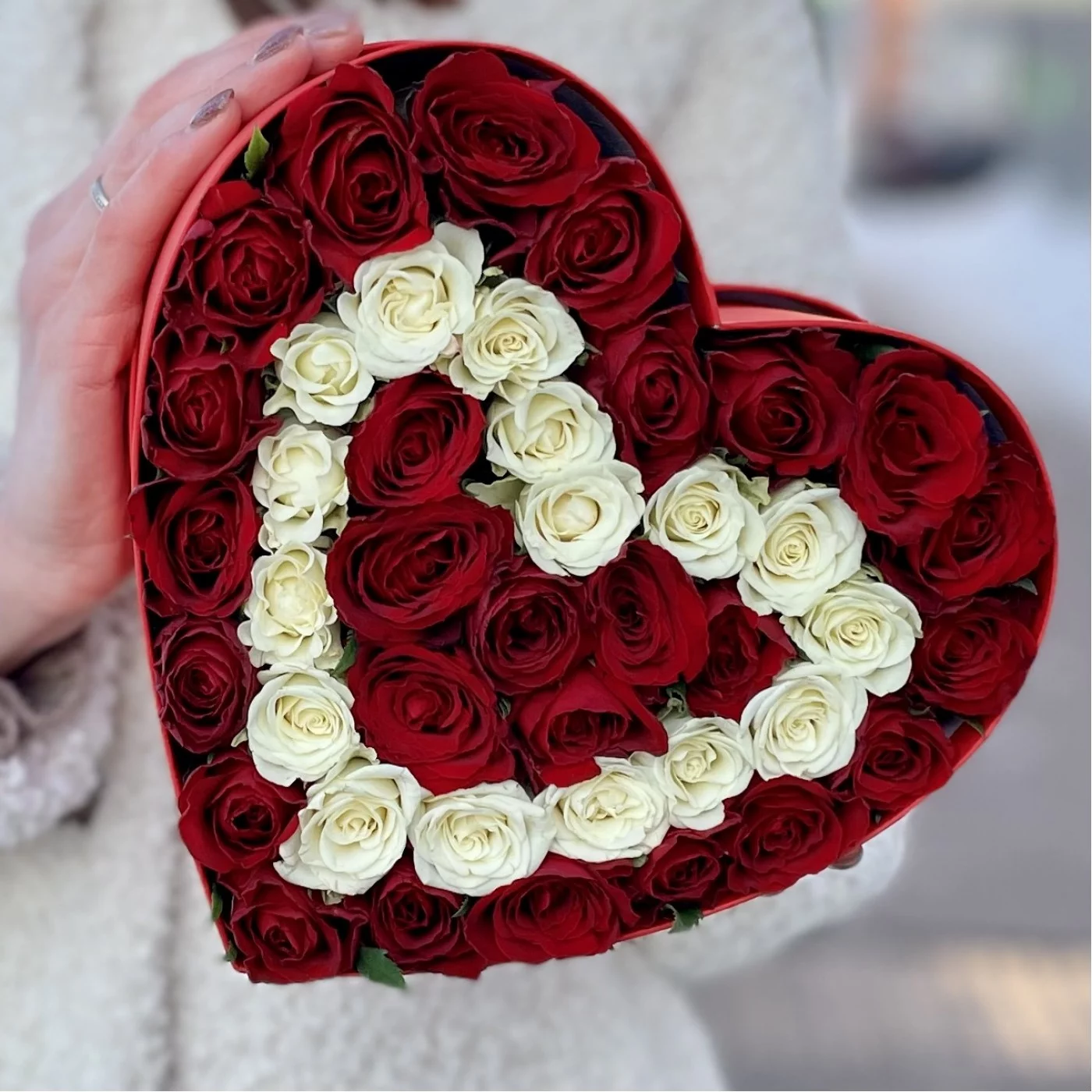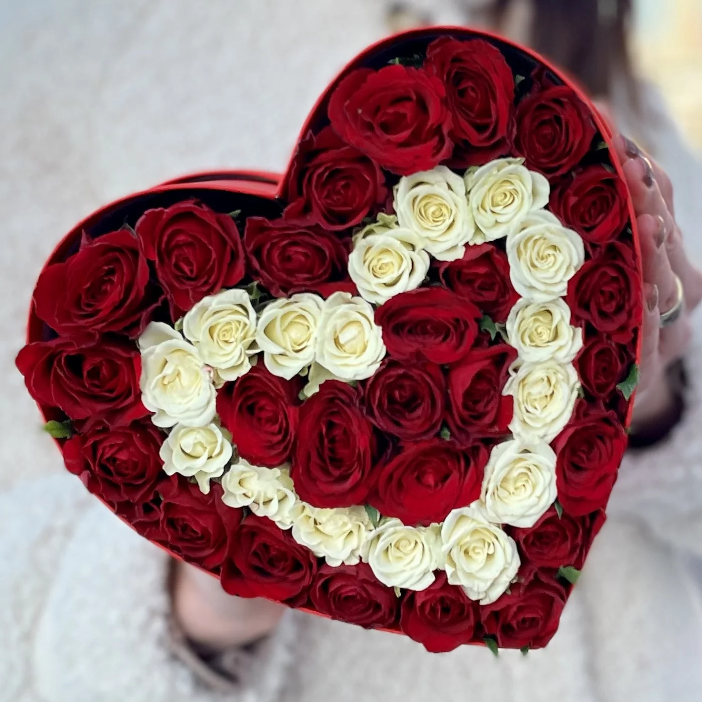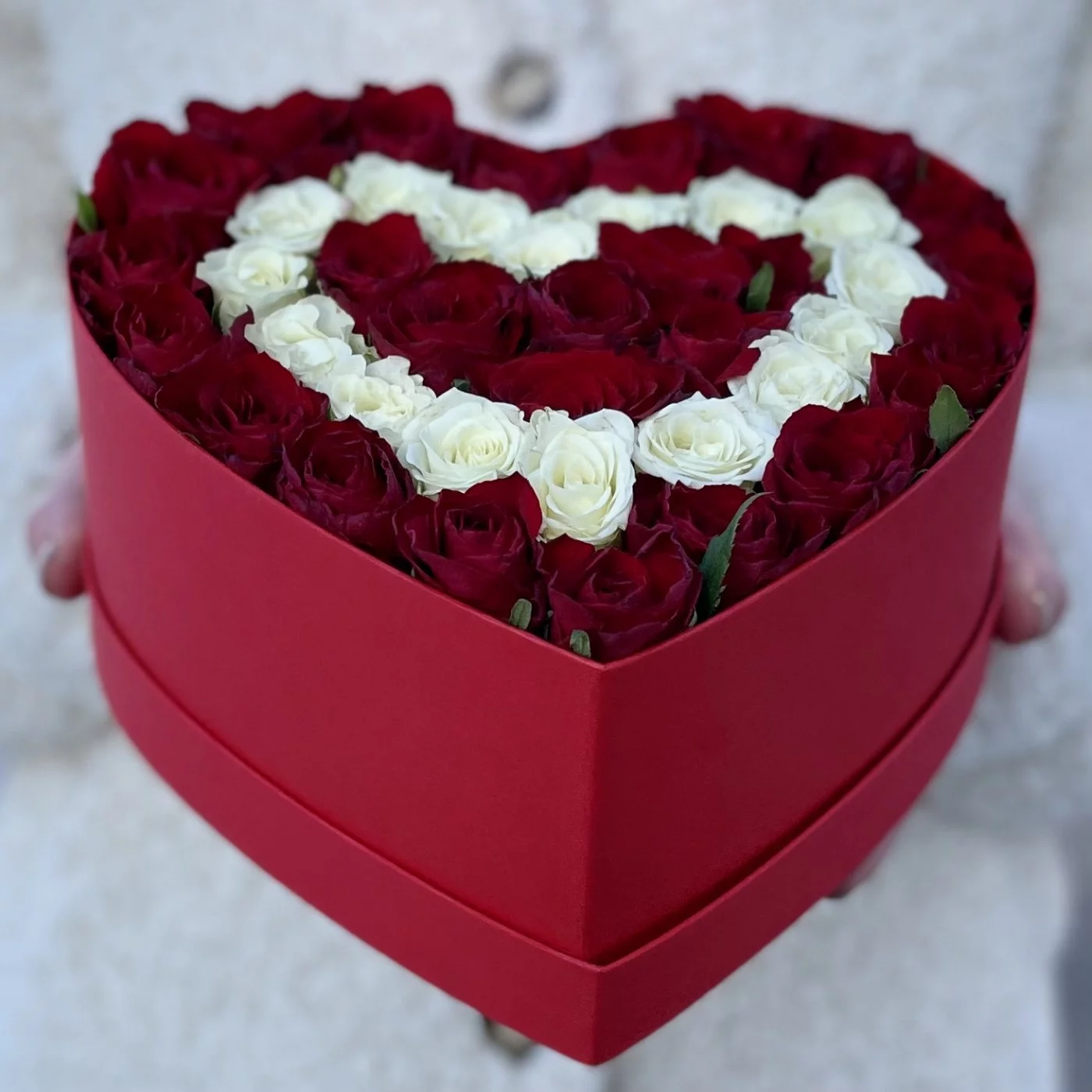 Коробка Сердце с красными и белыми кустовыми розами