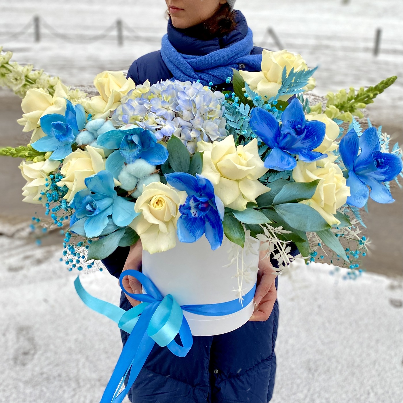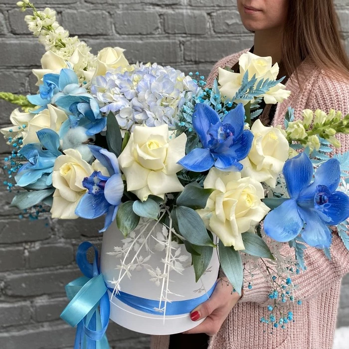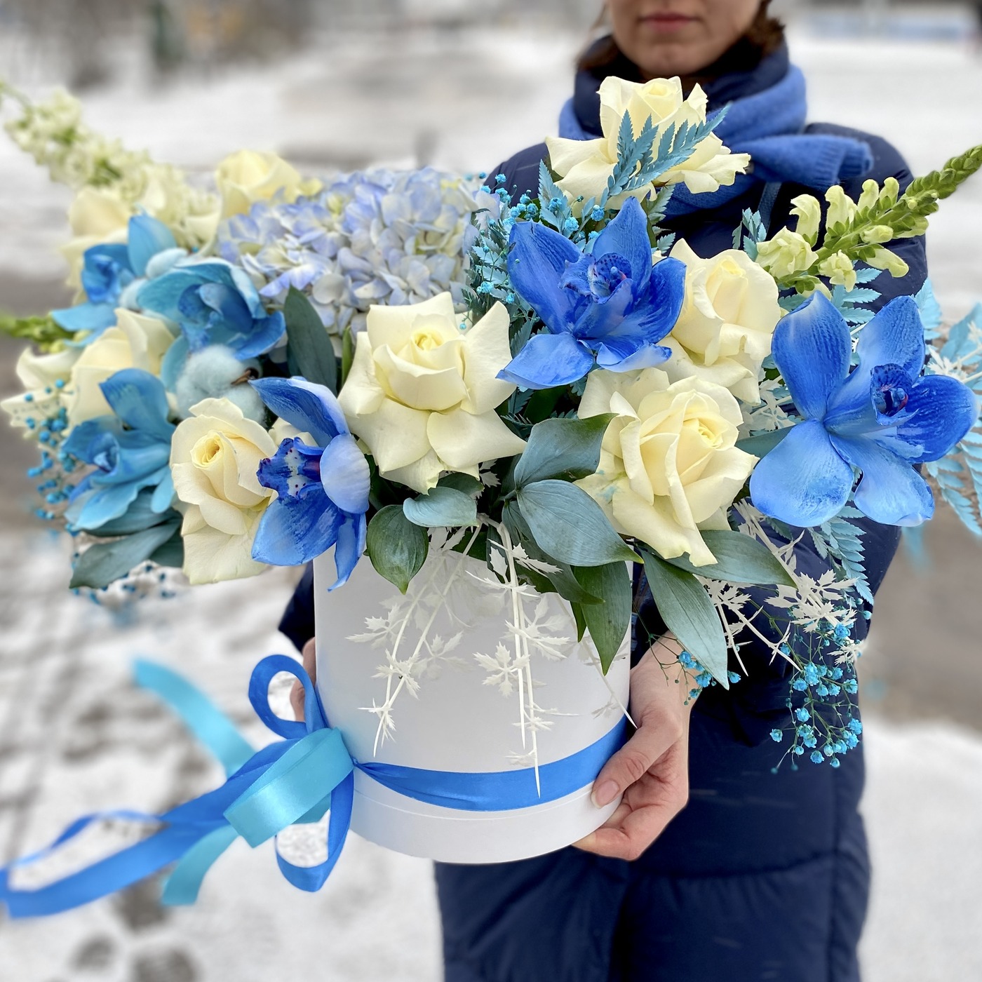 Зимняя компзиция в шляпной коробке создана для того, чтобы украшать пространство и наполнять его собственной красотой. В композиции использваны всеми любимые цветы: гортензия, орхидея и розы. Создайте зимнюю атмосферу дома или в офисе. Не забывайте поливать композицию каждый день в 3-4 местах. А шляпную коробку используйте в дальнейшем, например, для хранения памятных вещей.