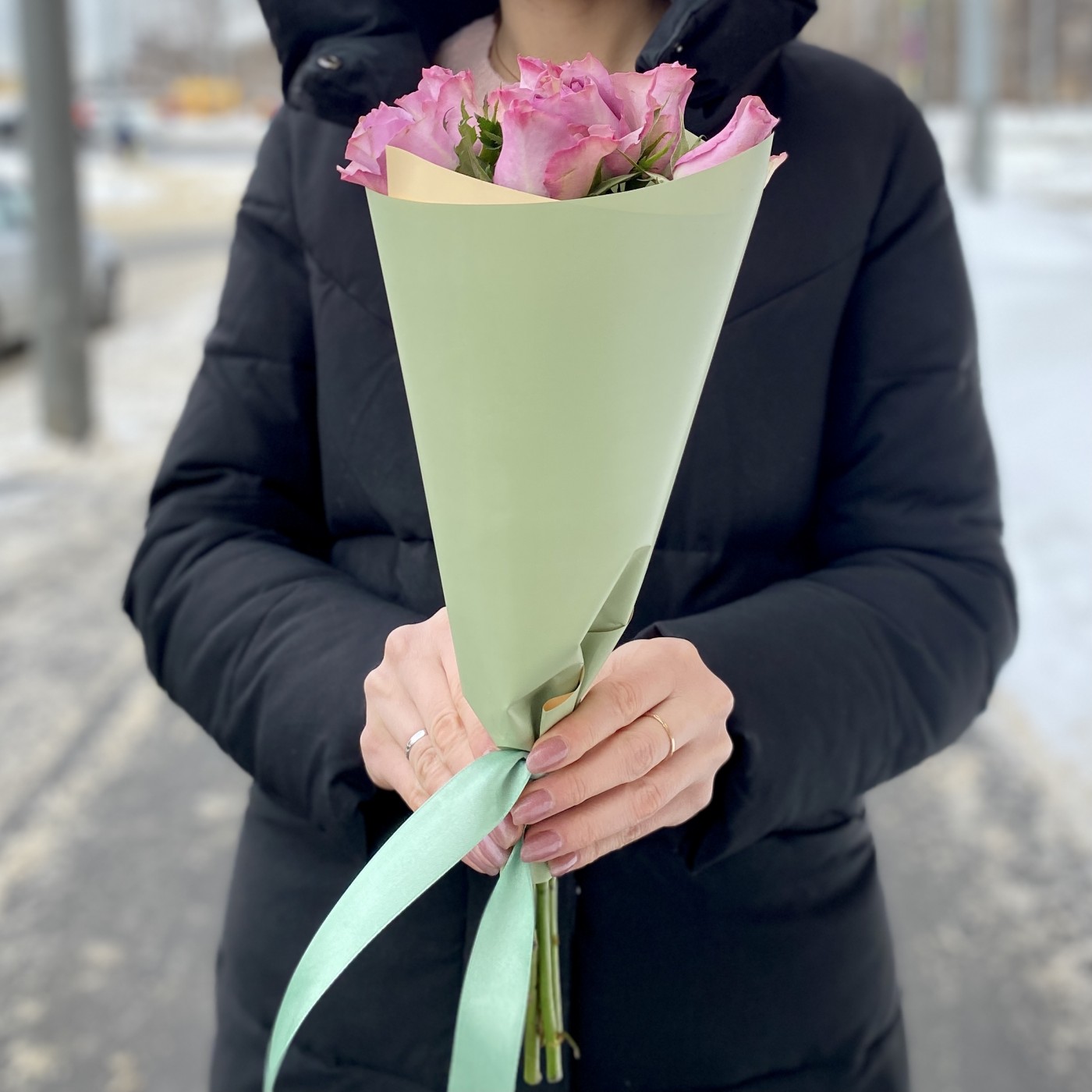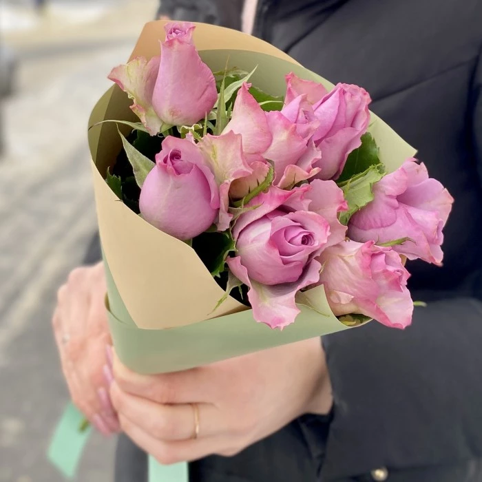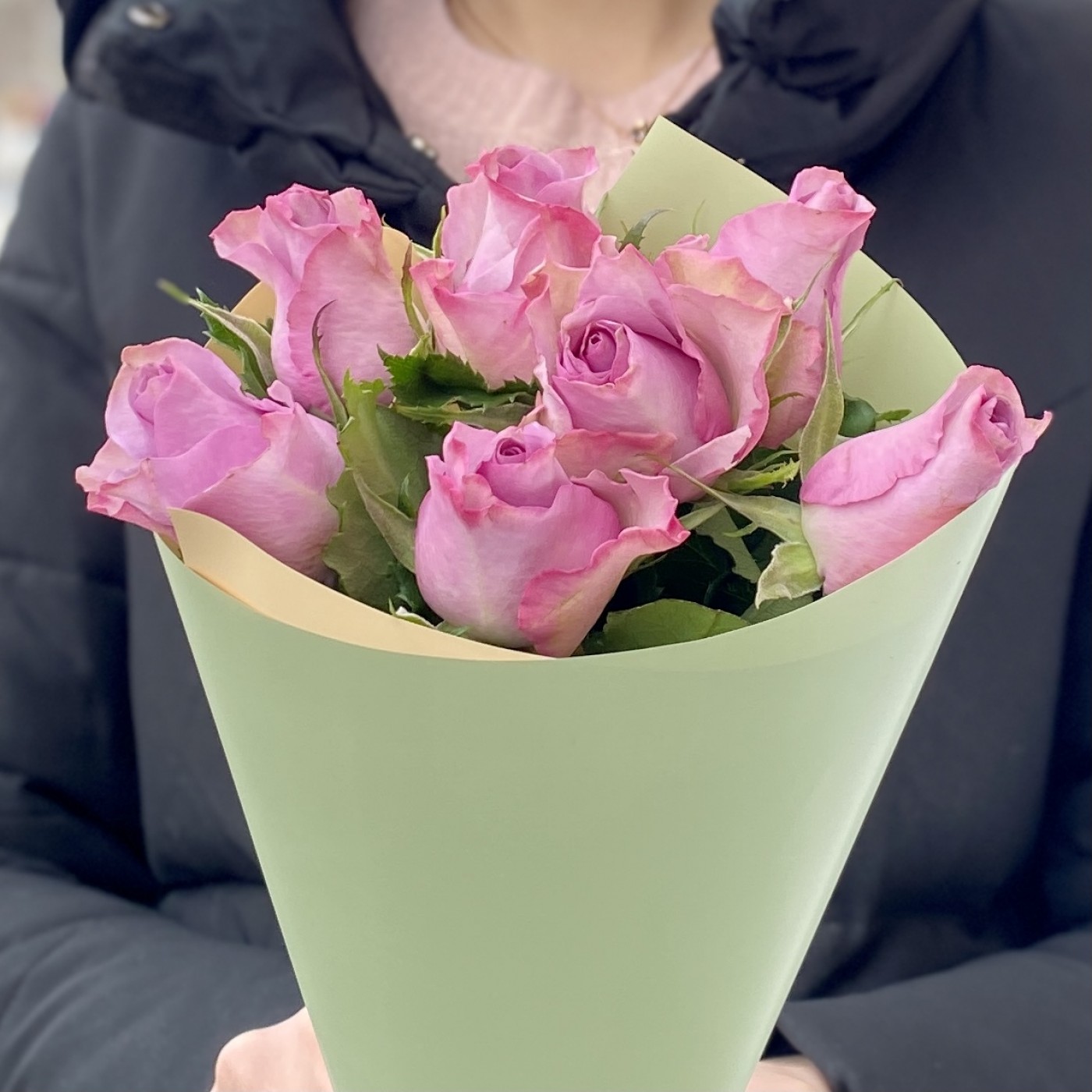 Корпоративный букет из семи сиреневых роз в цветной упаковке. Приятный презент на 8 марта.