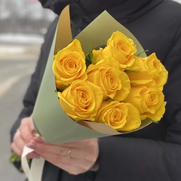 Сдержанный, но при этом невероятно яркий и сочный корпоративный букет из 7 желтых роз. Их цвет символизирует прибыль, достаток и материальное благополучие. Шикарный монохромный букет для коллег на 8 марта, юбилей или любой другой корпоративный праздник. Стильная цветная упаковка подчеркивает насыщенный цвет бутонов. Заказывая у нас корпоративный букет из 7 желтых роз, вы можете быть уверенными в том, что композиция будет собрана из свежих цветков, а наш курьер доставит этот флористический шедевр в целости и сохранности и точно ко времени.