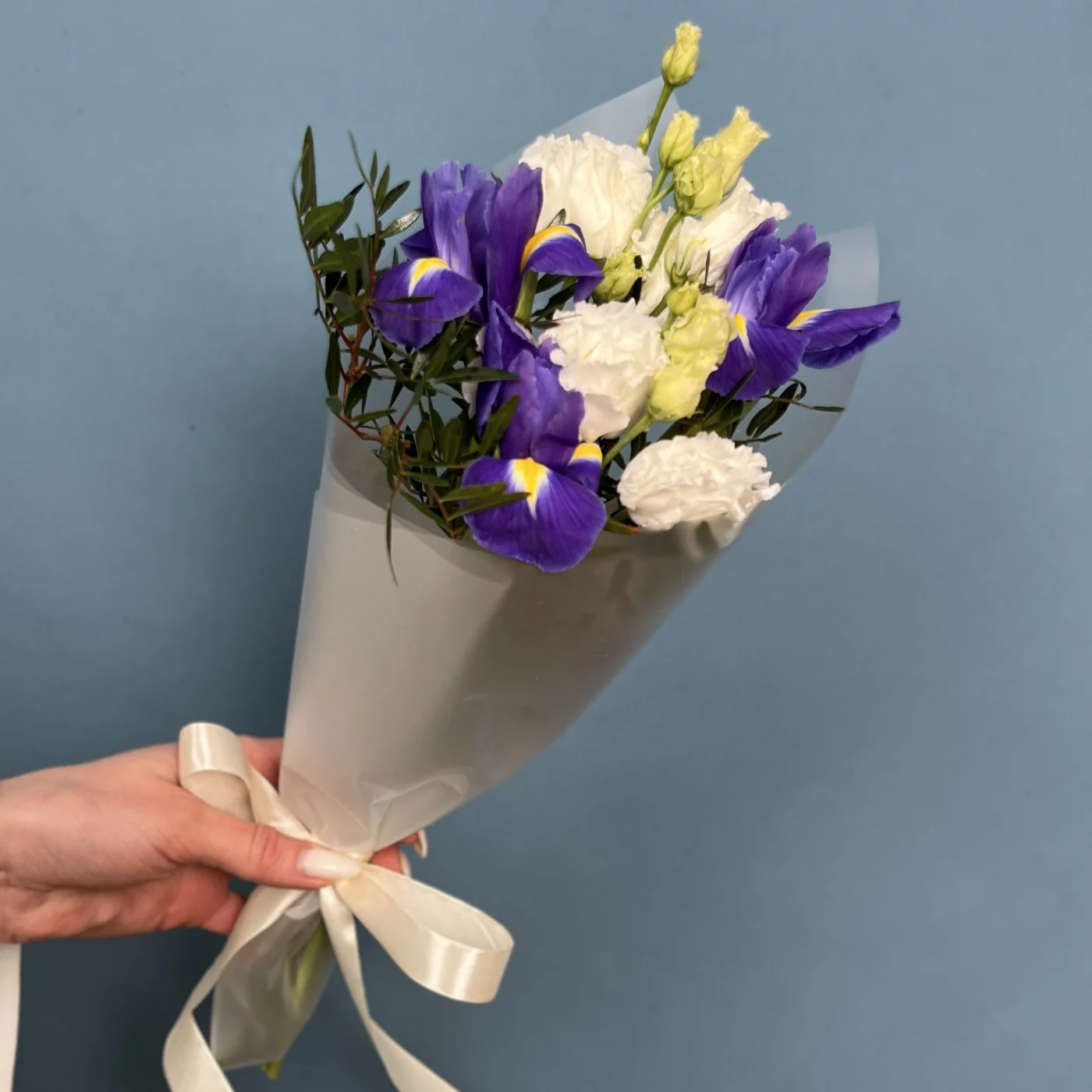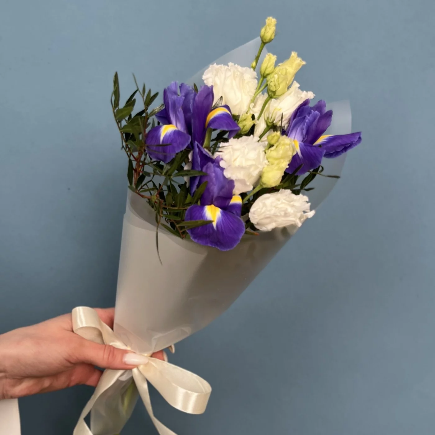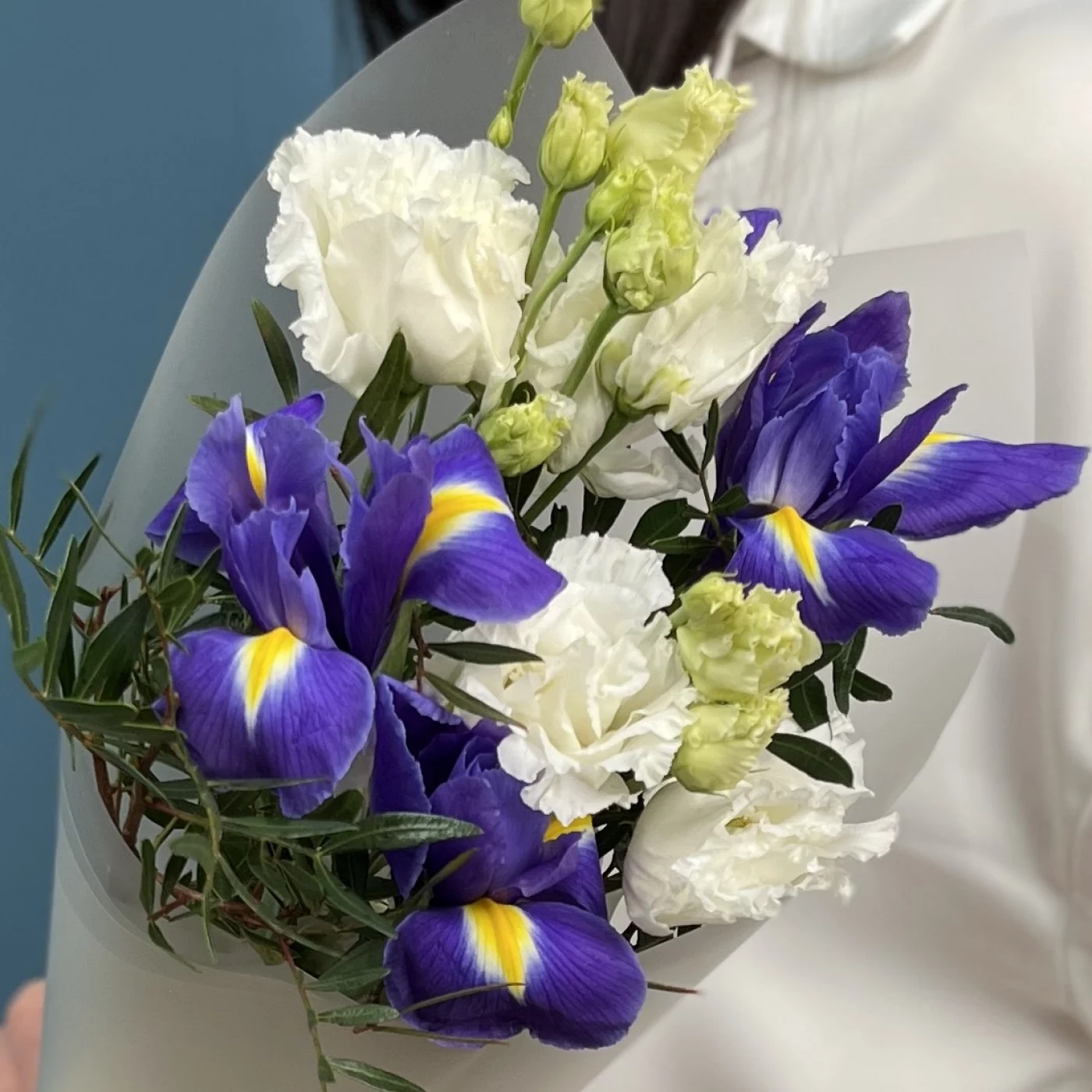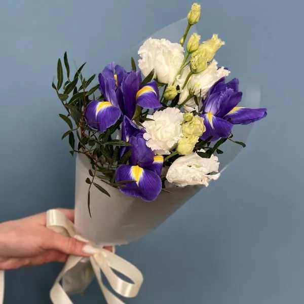Ирисы символизируют мудрость и надежду, а белая эустома добавляет нежности и утонченности.